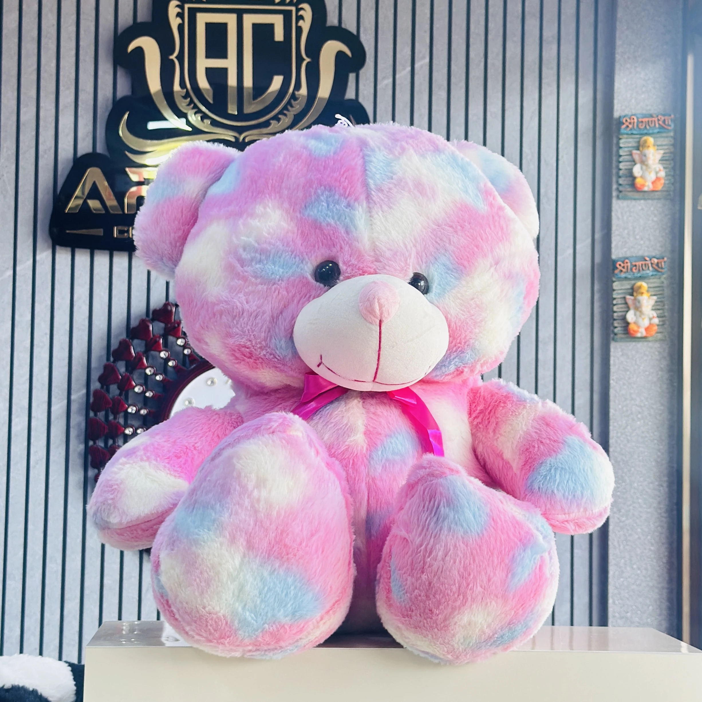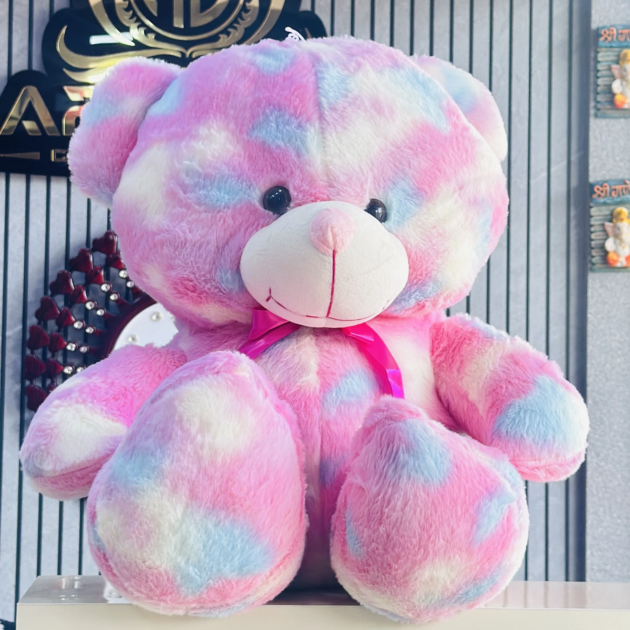 👉Theme :- soft, fluffy teddy bear with a pink, blue, and white tie-dye or rainbow pattern.