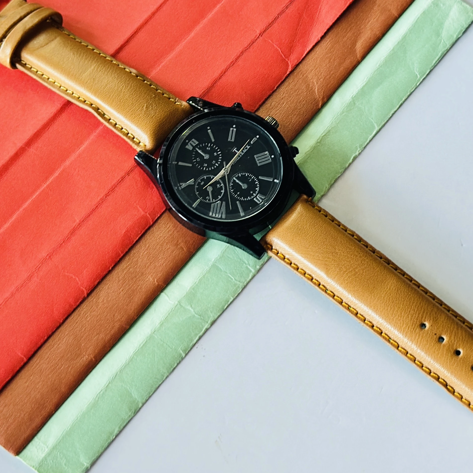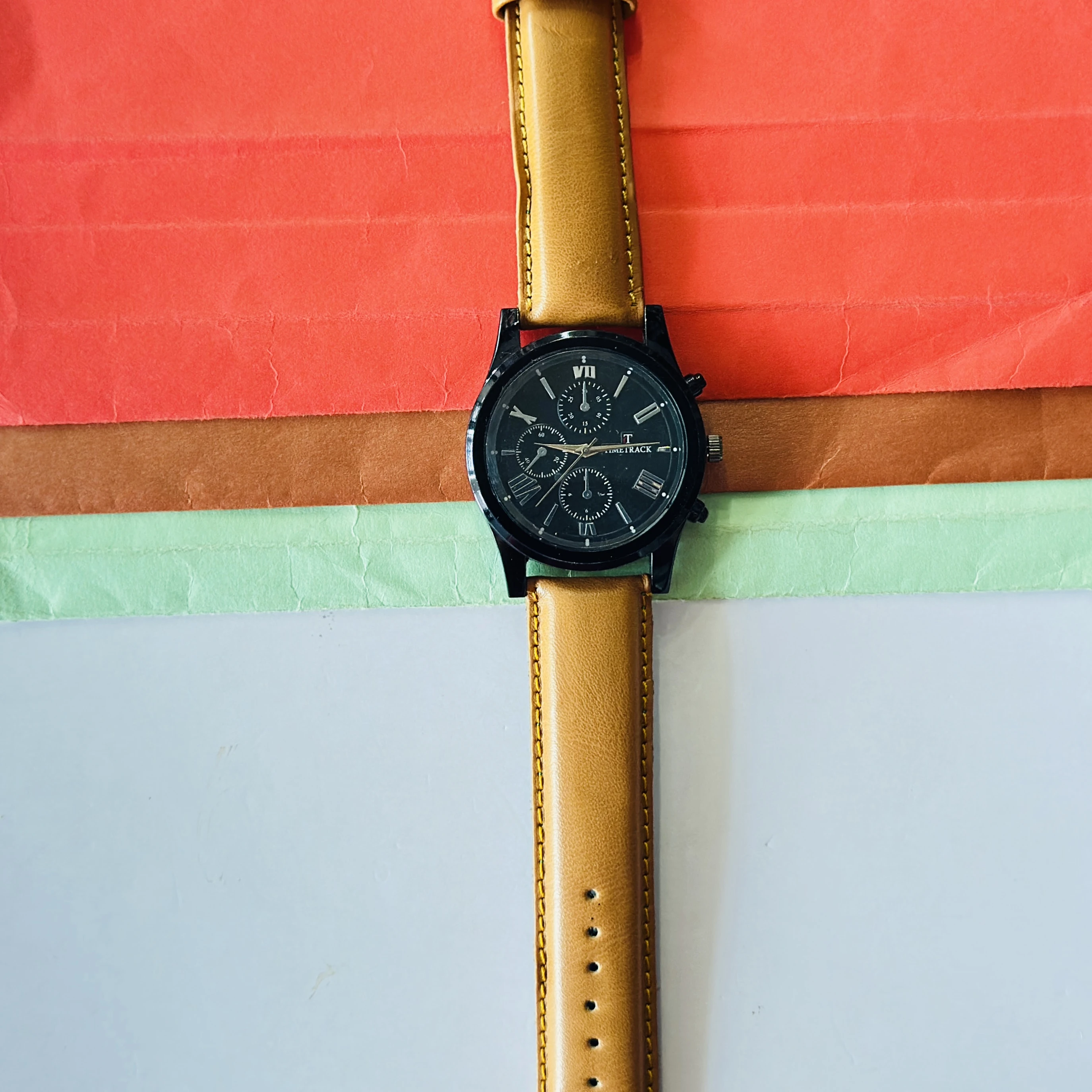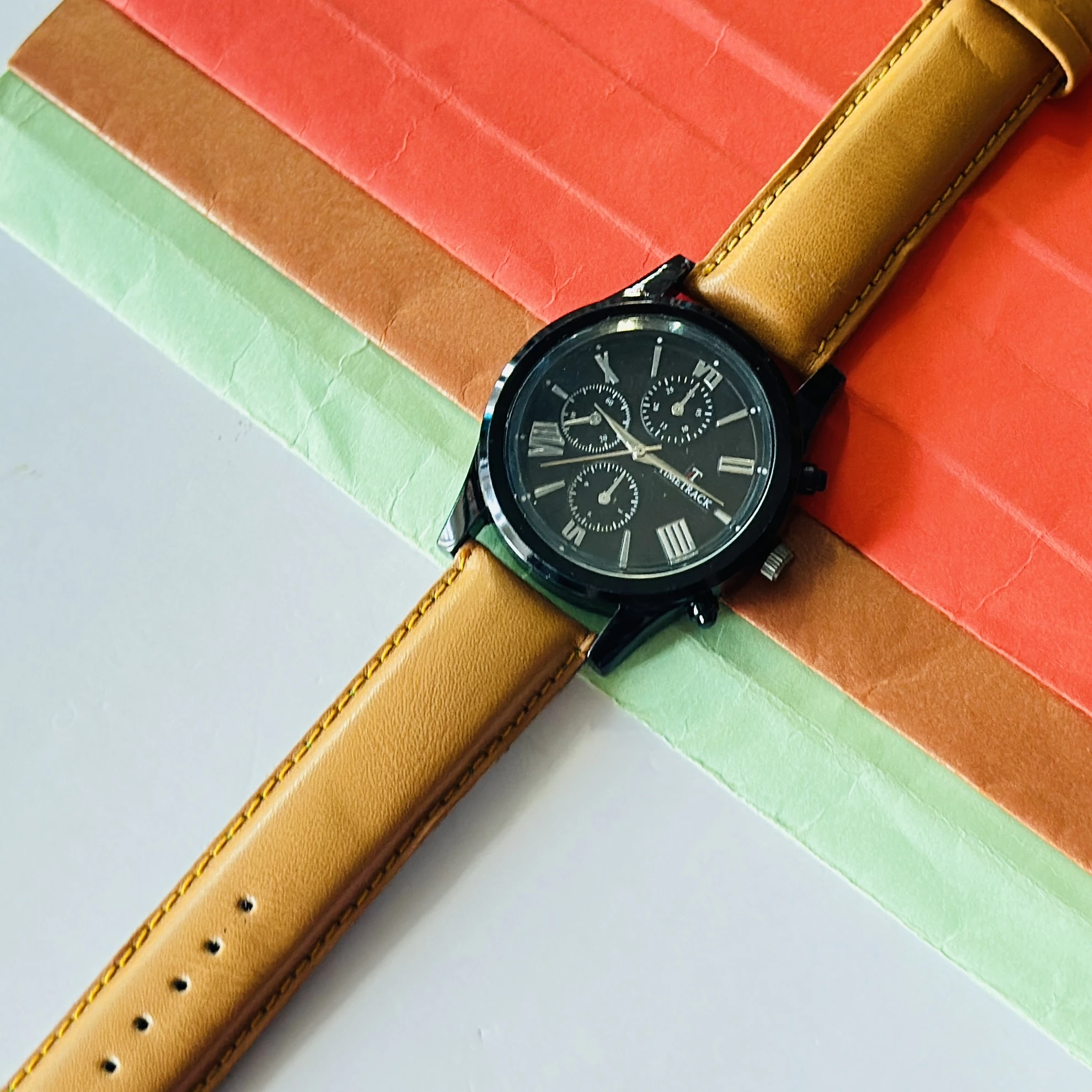 Timetrack quartz analog watch with a black dial and a brown leather strap.