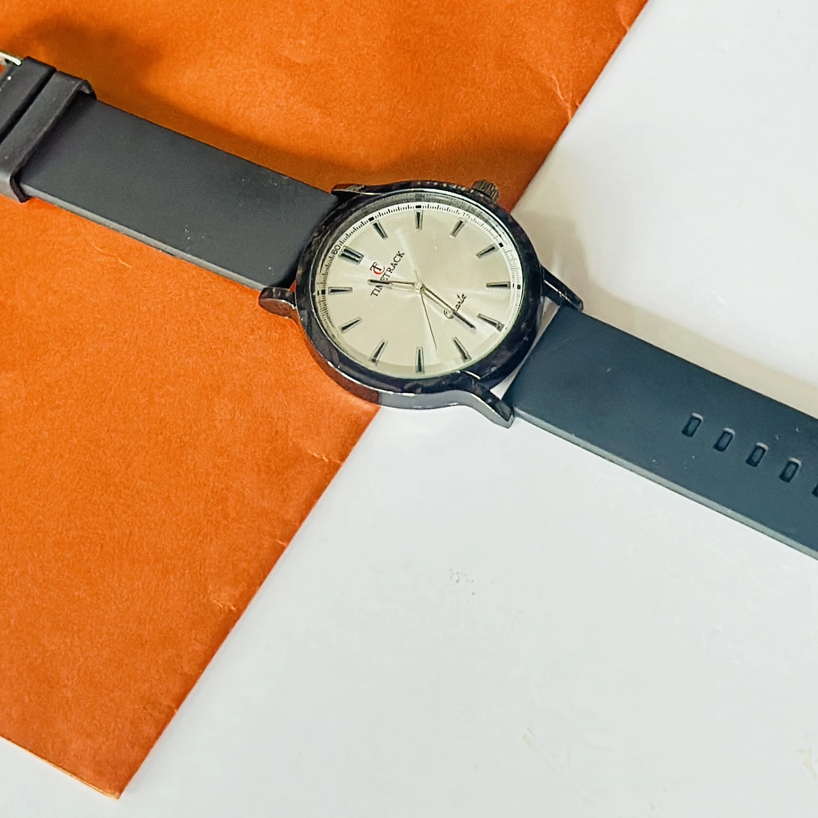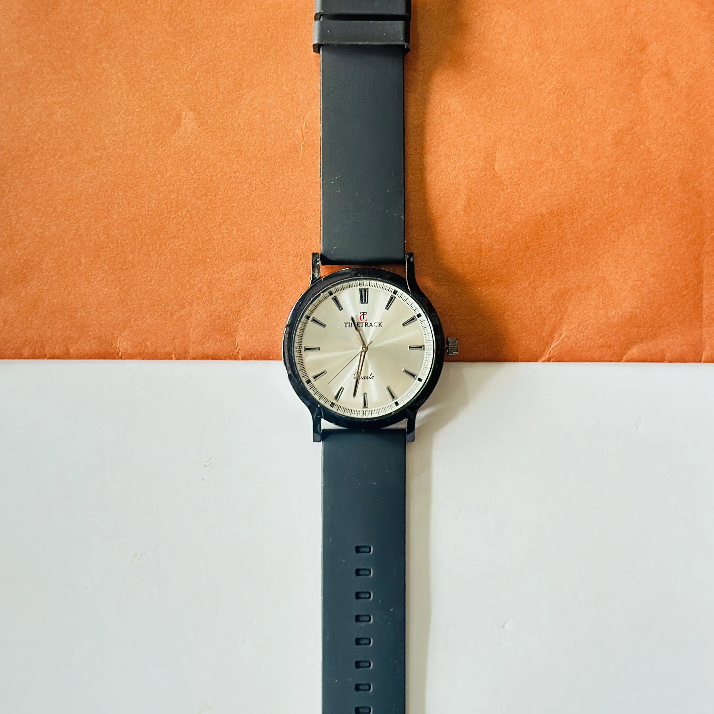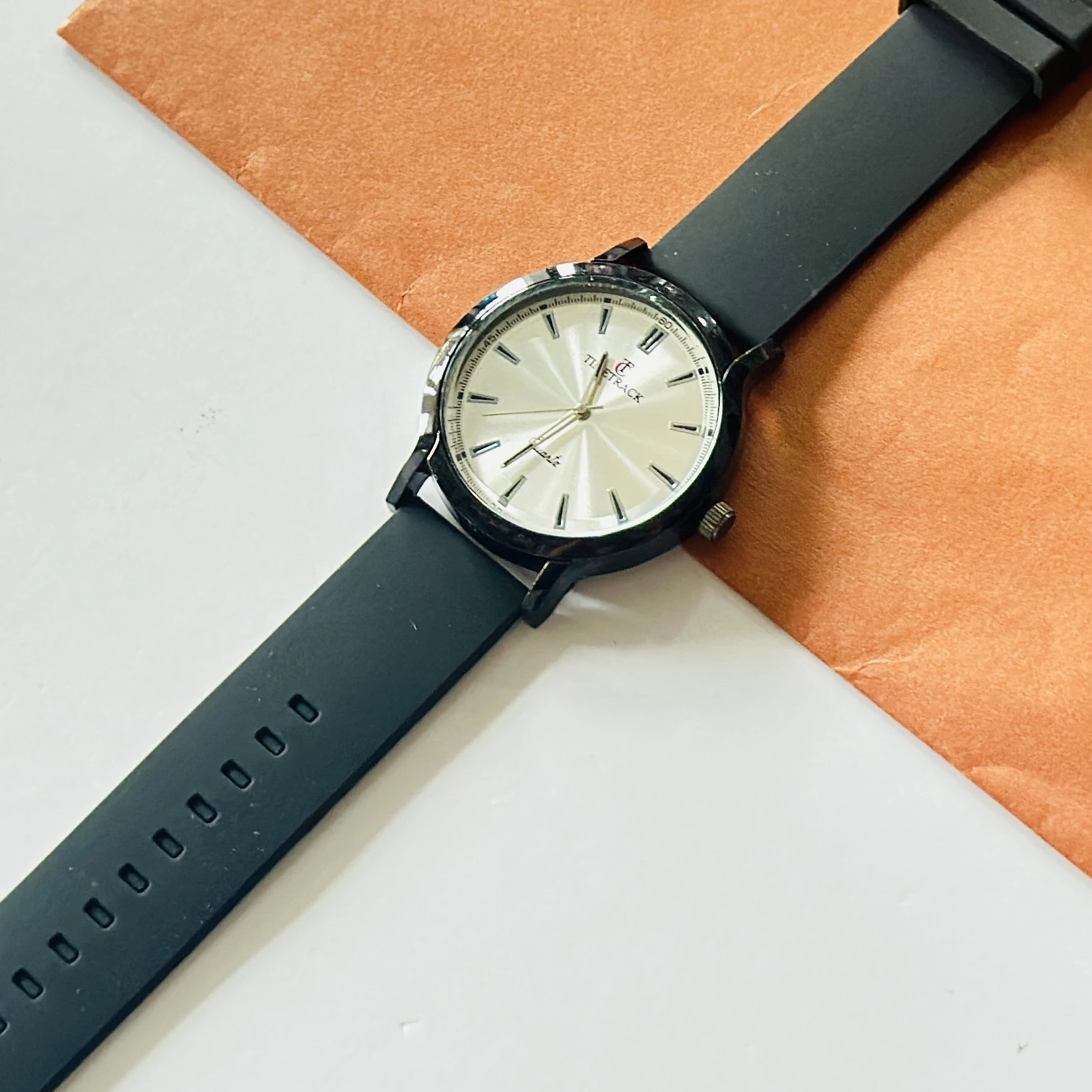 Timitrack brand quartz analog wristwatch with a silver-toned dial and a black silicone strap.