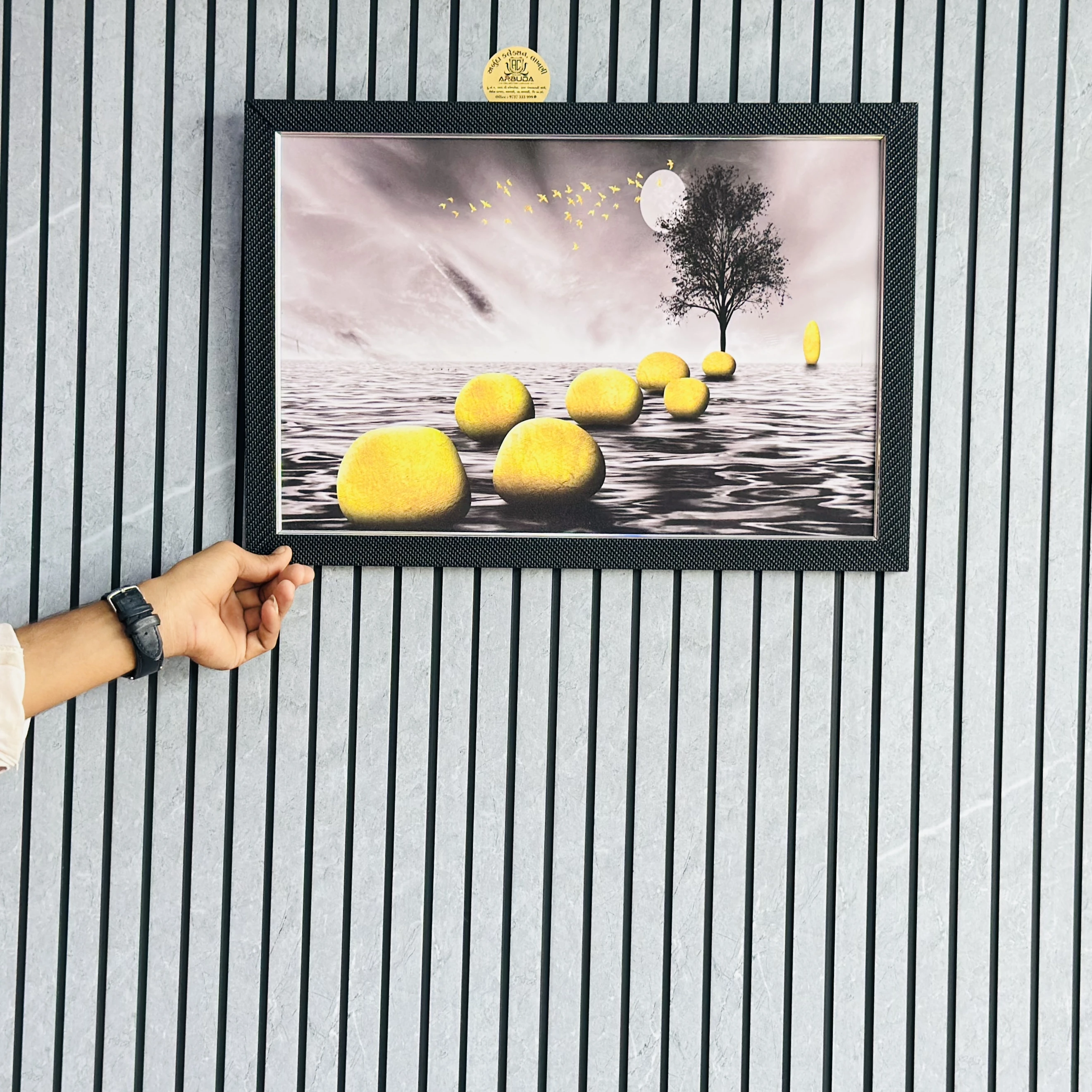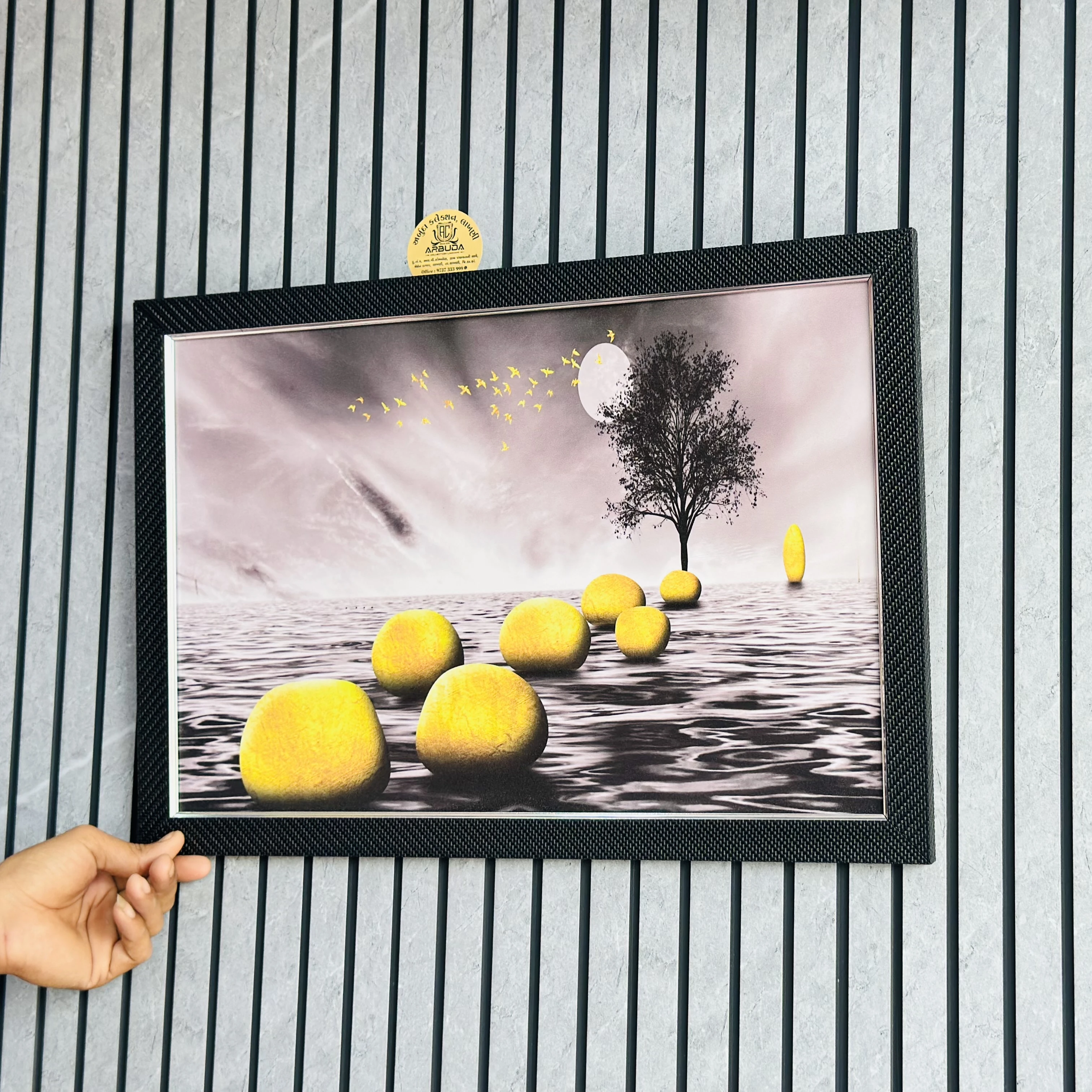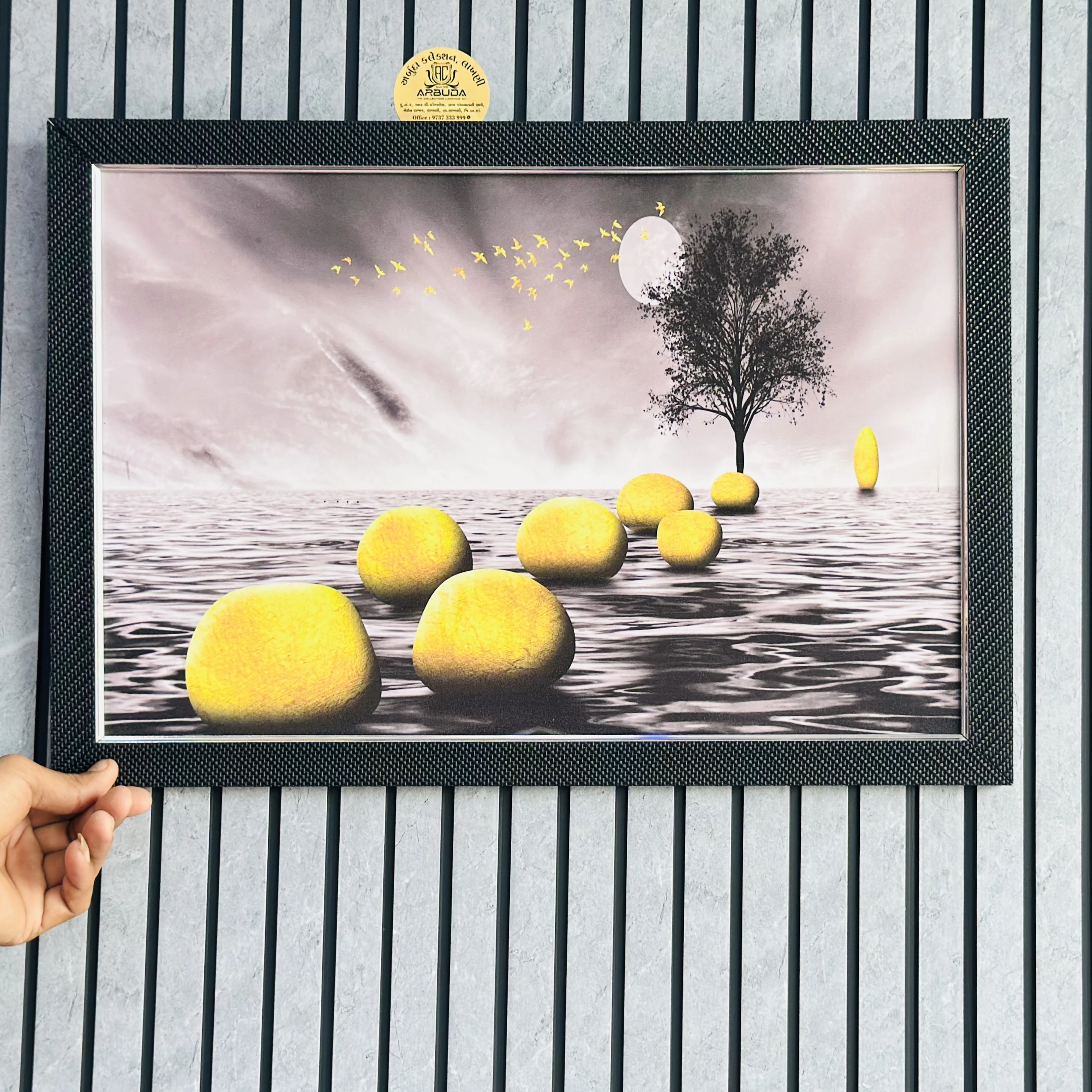 👉 Theme :- wall art depicting a surreal landscape. The image features a black and white background with a path of yellow stones leading across a body of water toward a single tree and a full moon. Golden birds are shown flying across the sky.