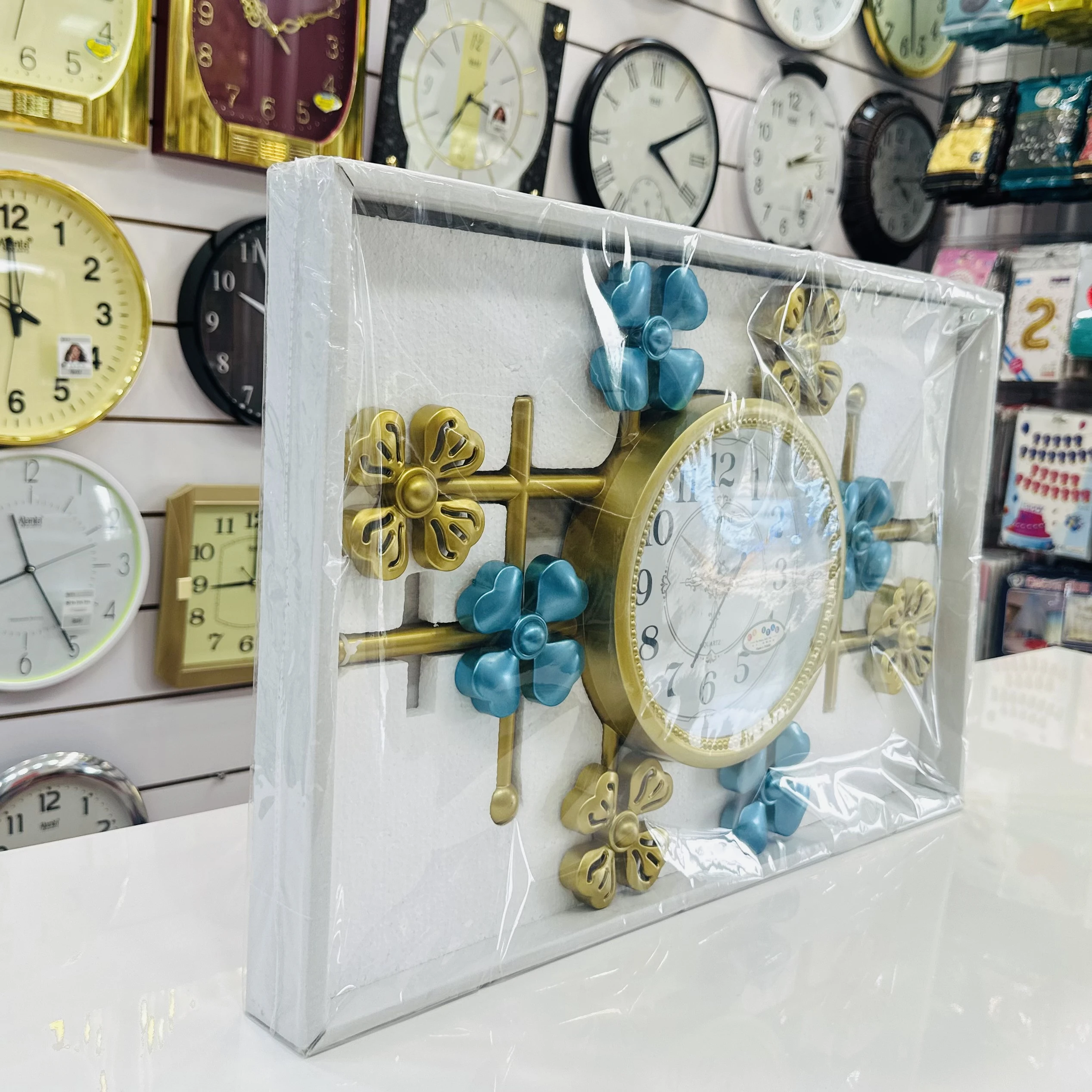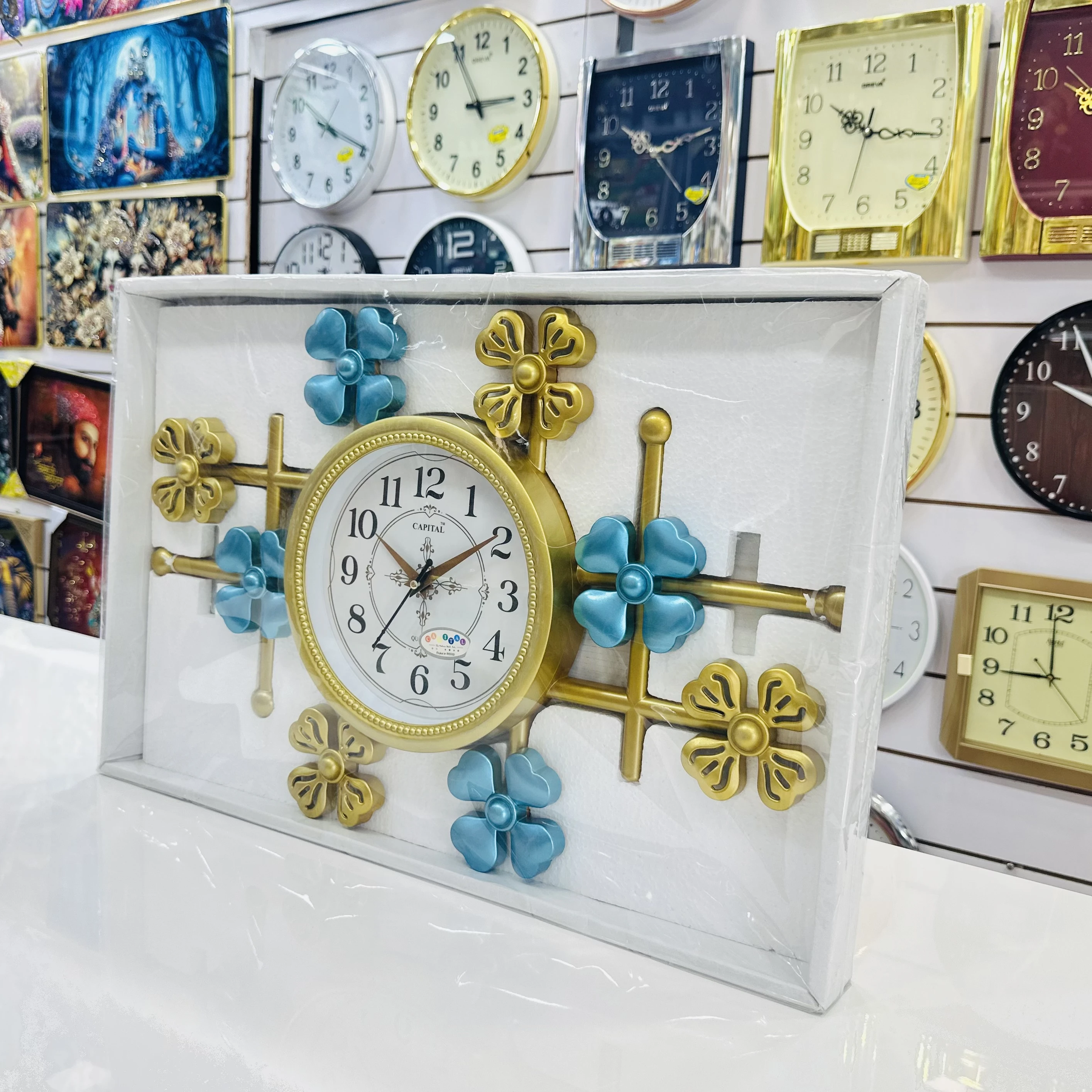 👉 Theme :- CAPITAL brand wall clock with a metallic blue and gold floral design.