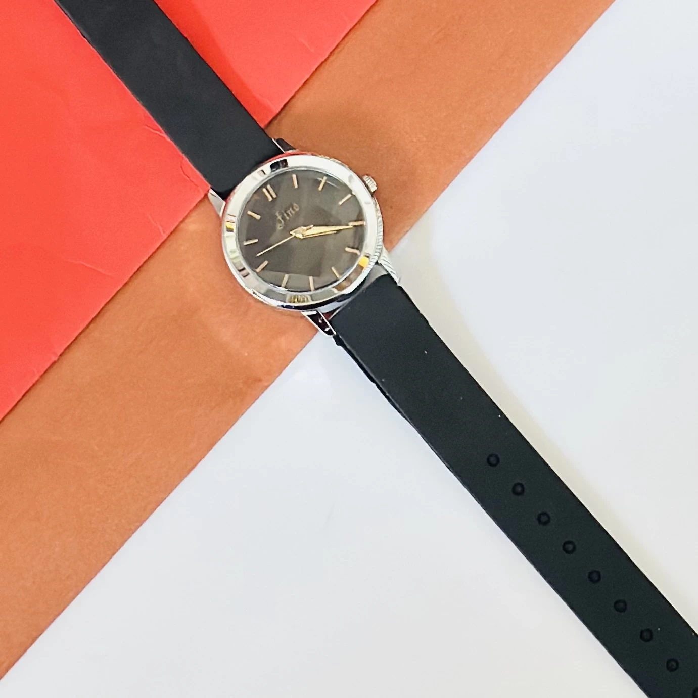 👉 Theme :- Black analog wristwatch with a black faux leather strap.