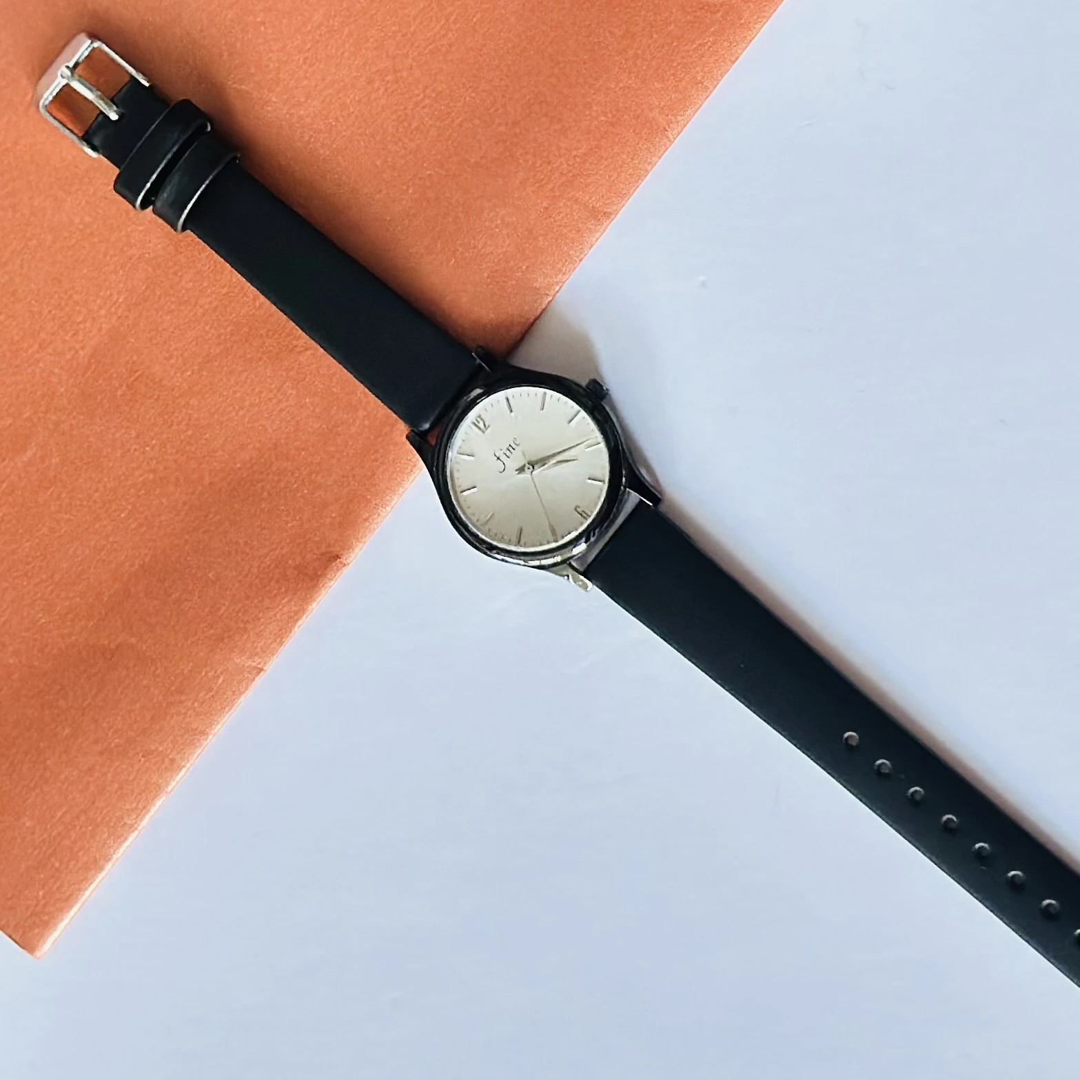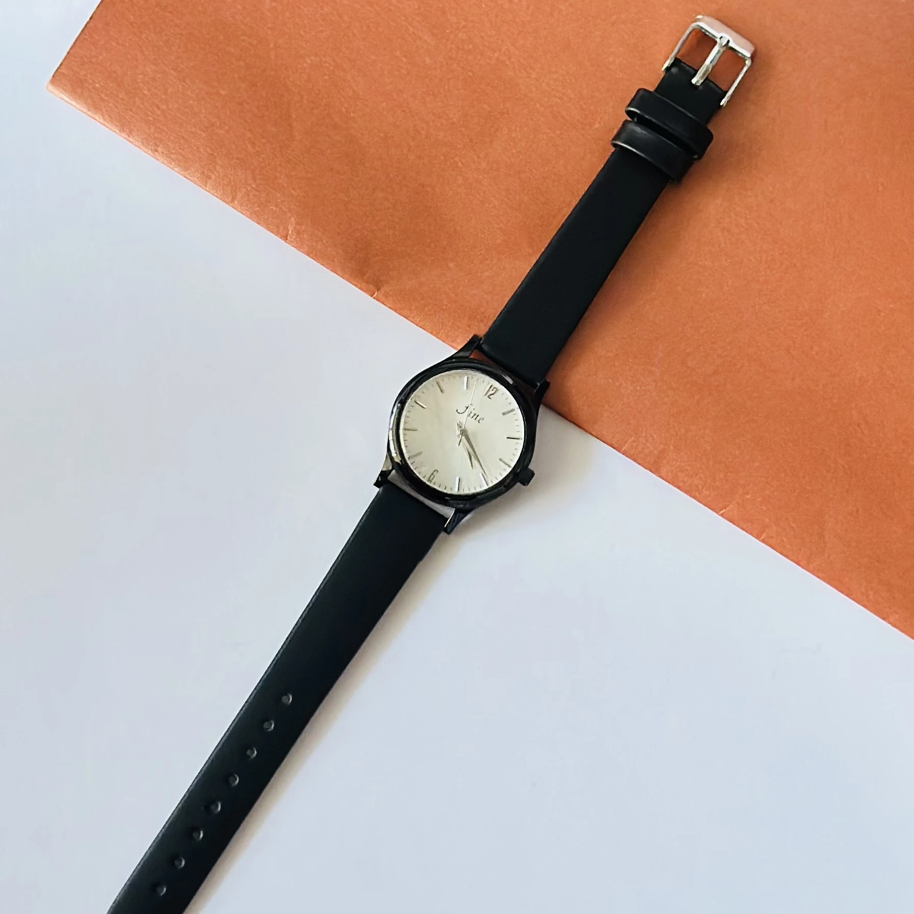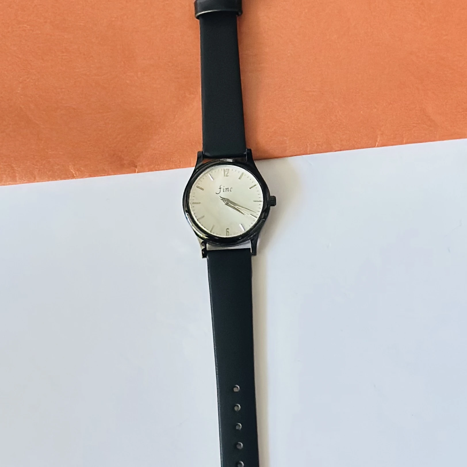 👉 Theme :- Black analog wristwatch with a black faux leather strap.