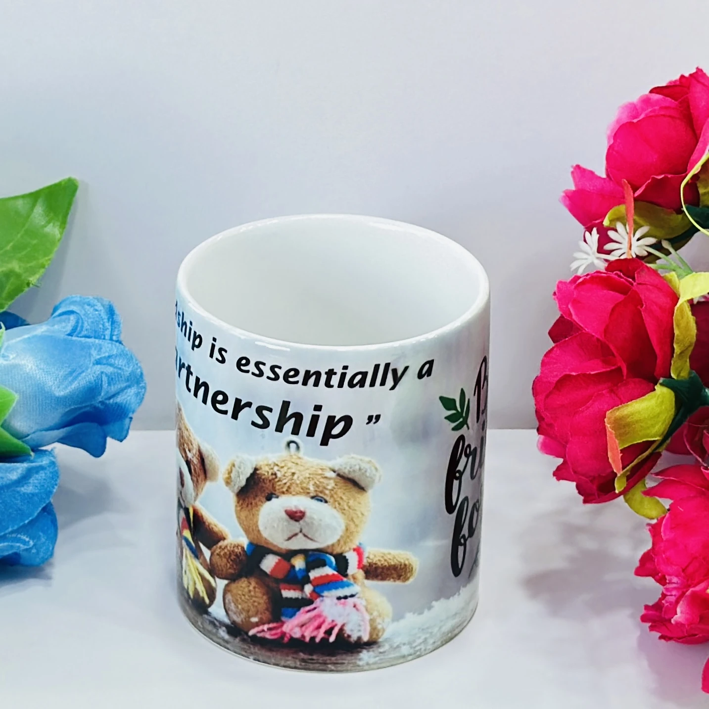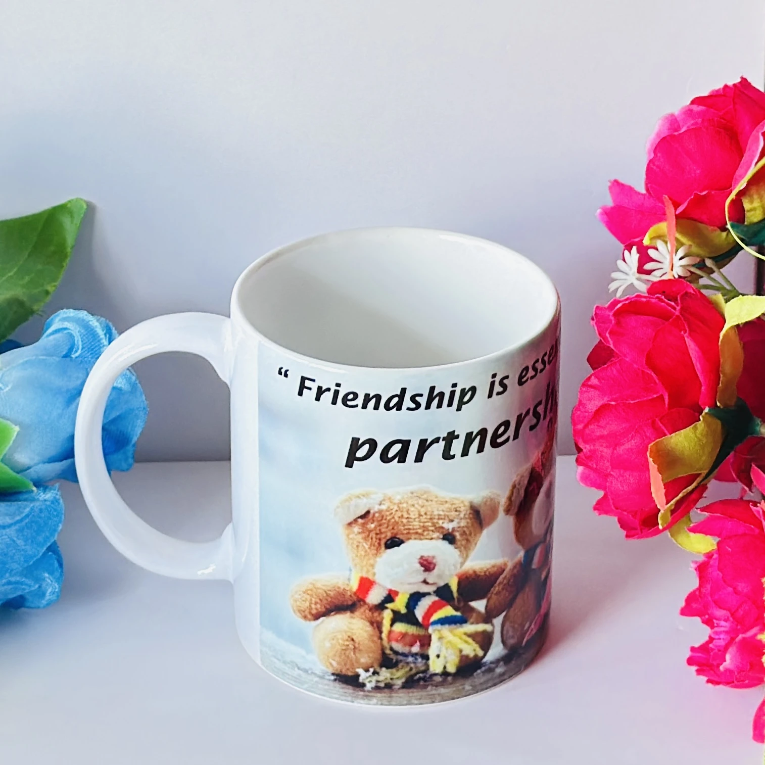 👉 Theme :- white ceramic coffee mug with a "Friendship is..." quote and a teddy bear graphic.