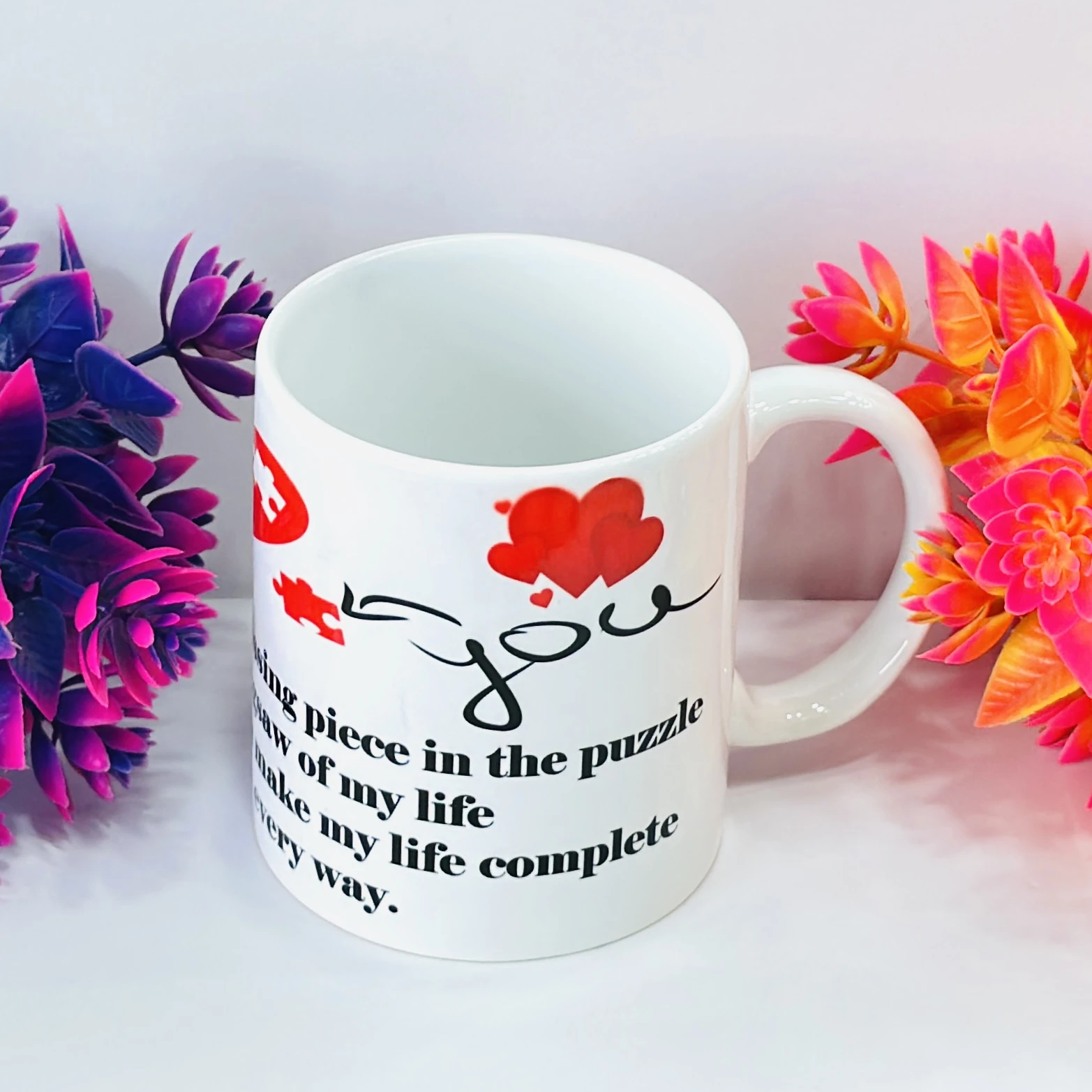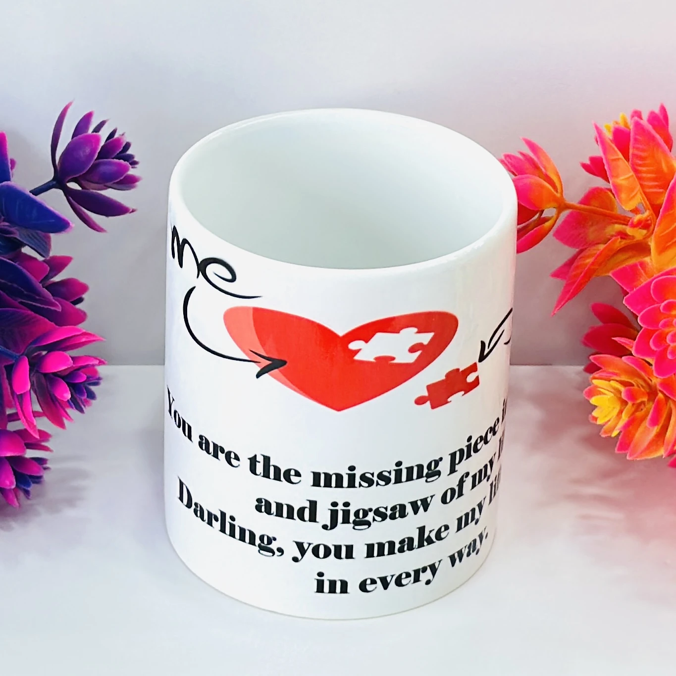👉 Theme :- white ceramic coffee mug with a "LOVE you and me Darling" print.