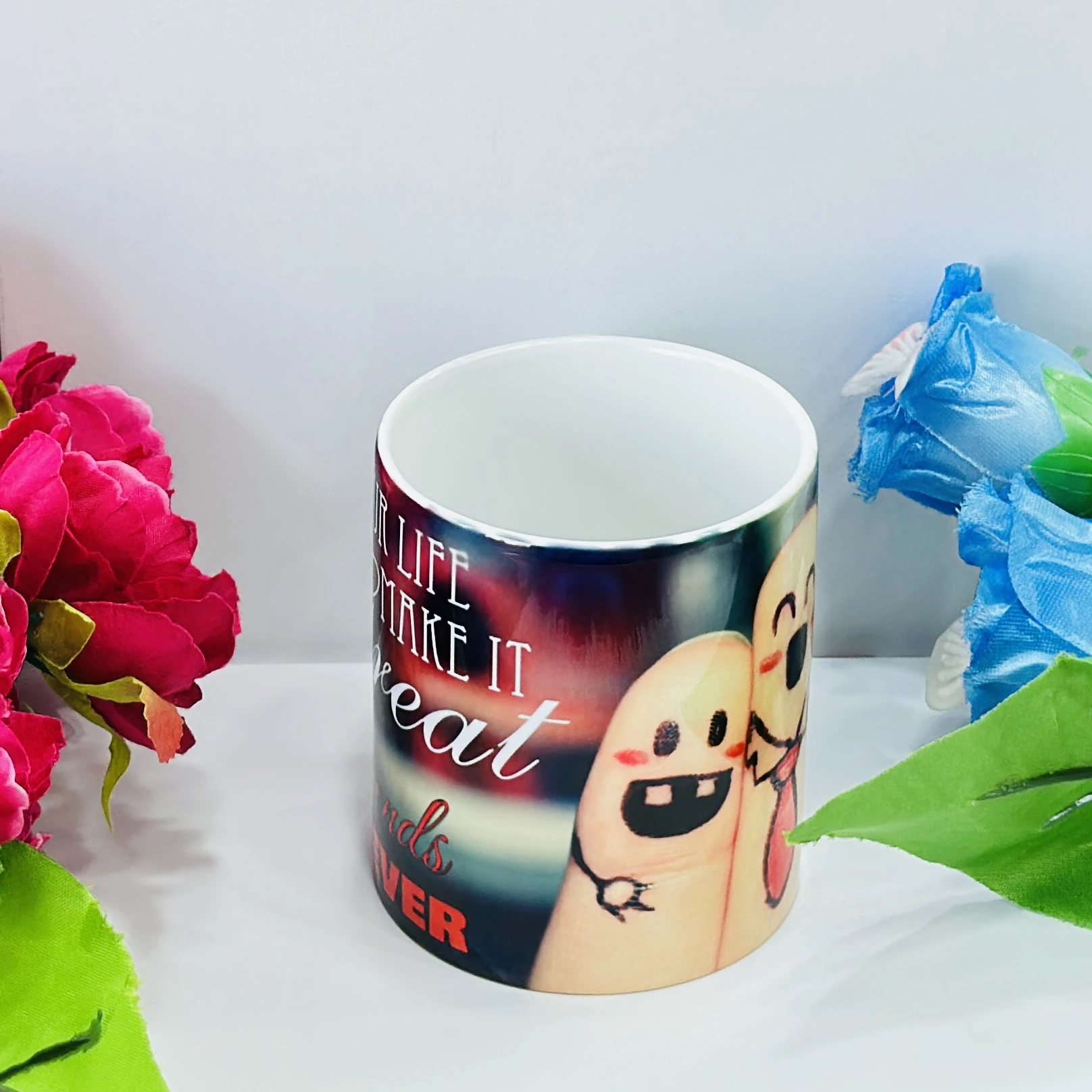 👉 Theme :- white ceramic coffee mug with a "Friendship is..." quote and a teddy bear graphic.