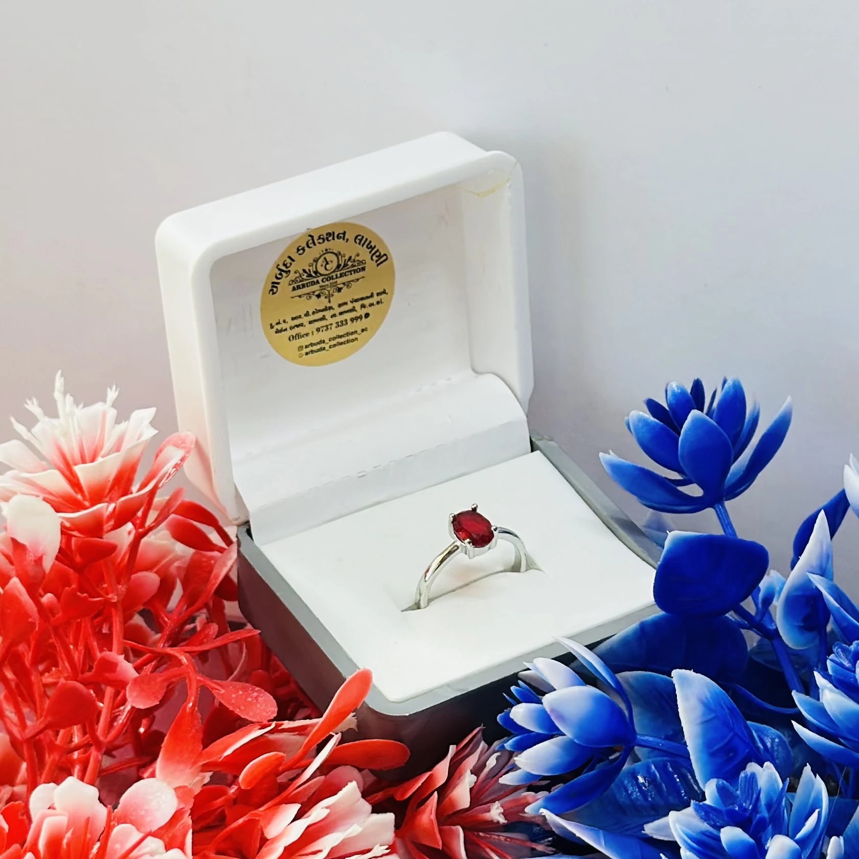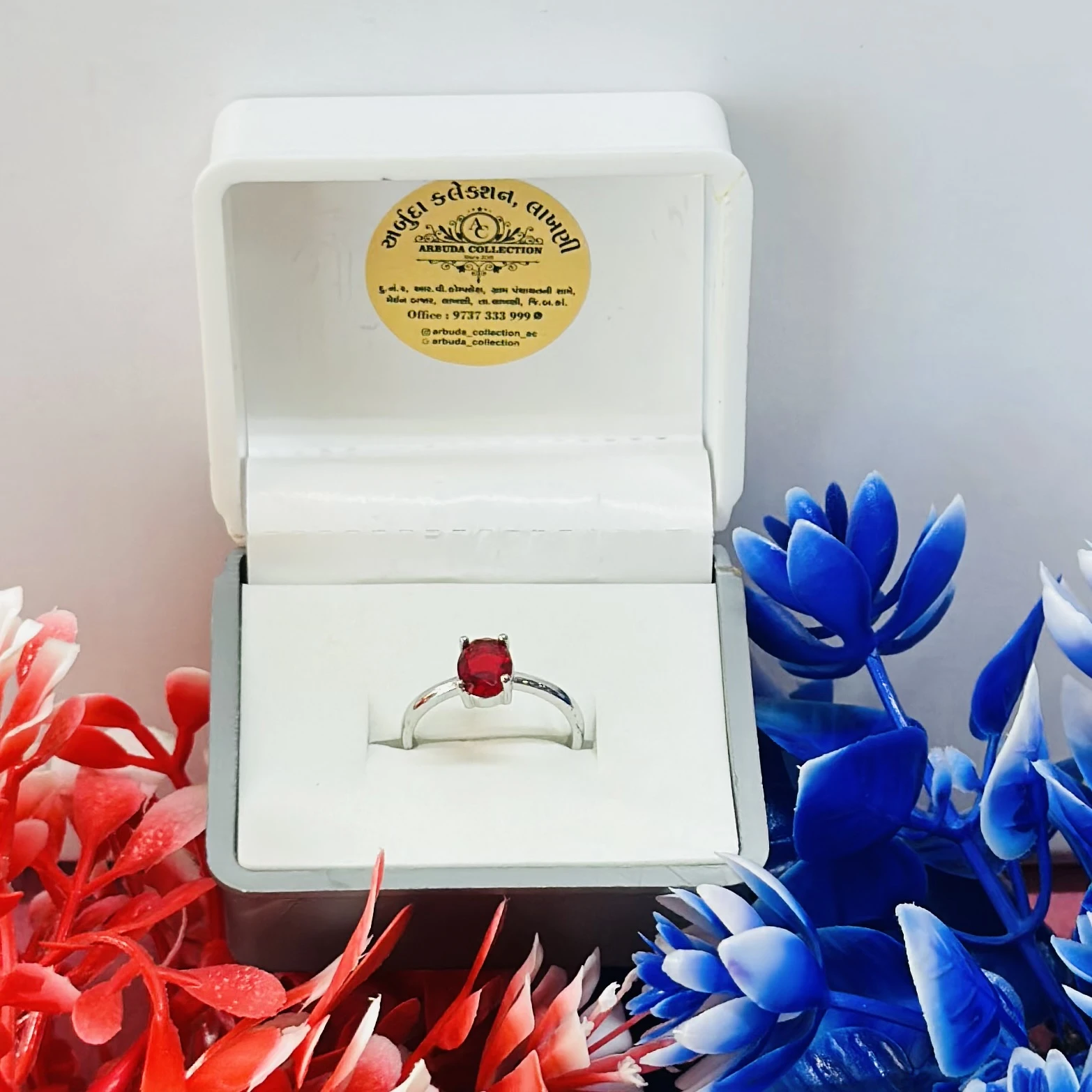 👉 Theme :- white gold or silver solitaire ring with an oval-cut ruby gemstone.