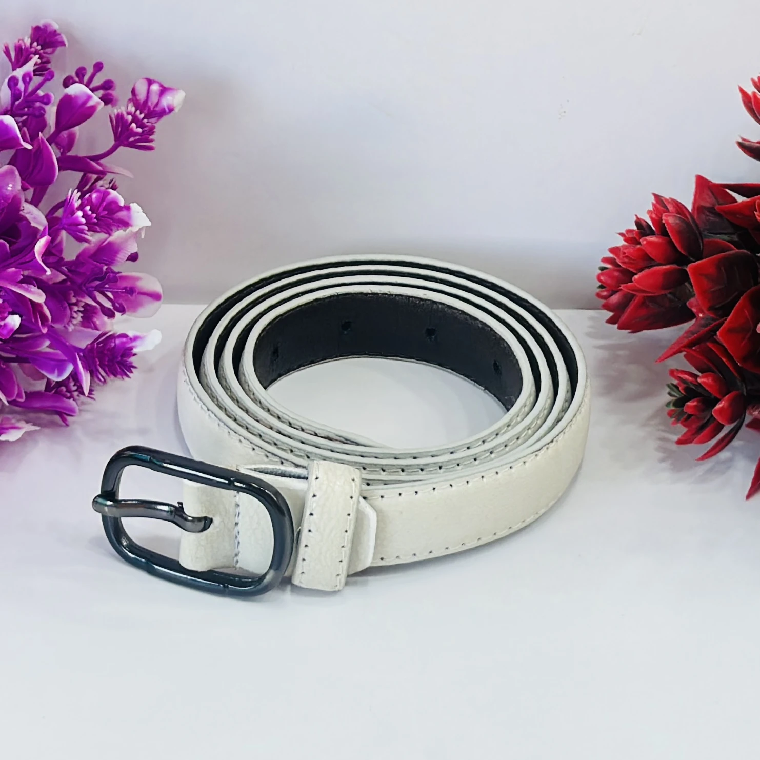 👉 Theme :- white leather women's belt with a black buckle.