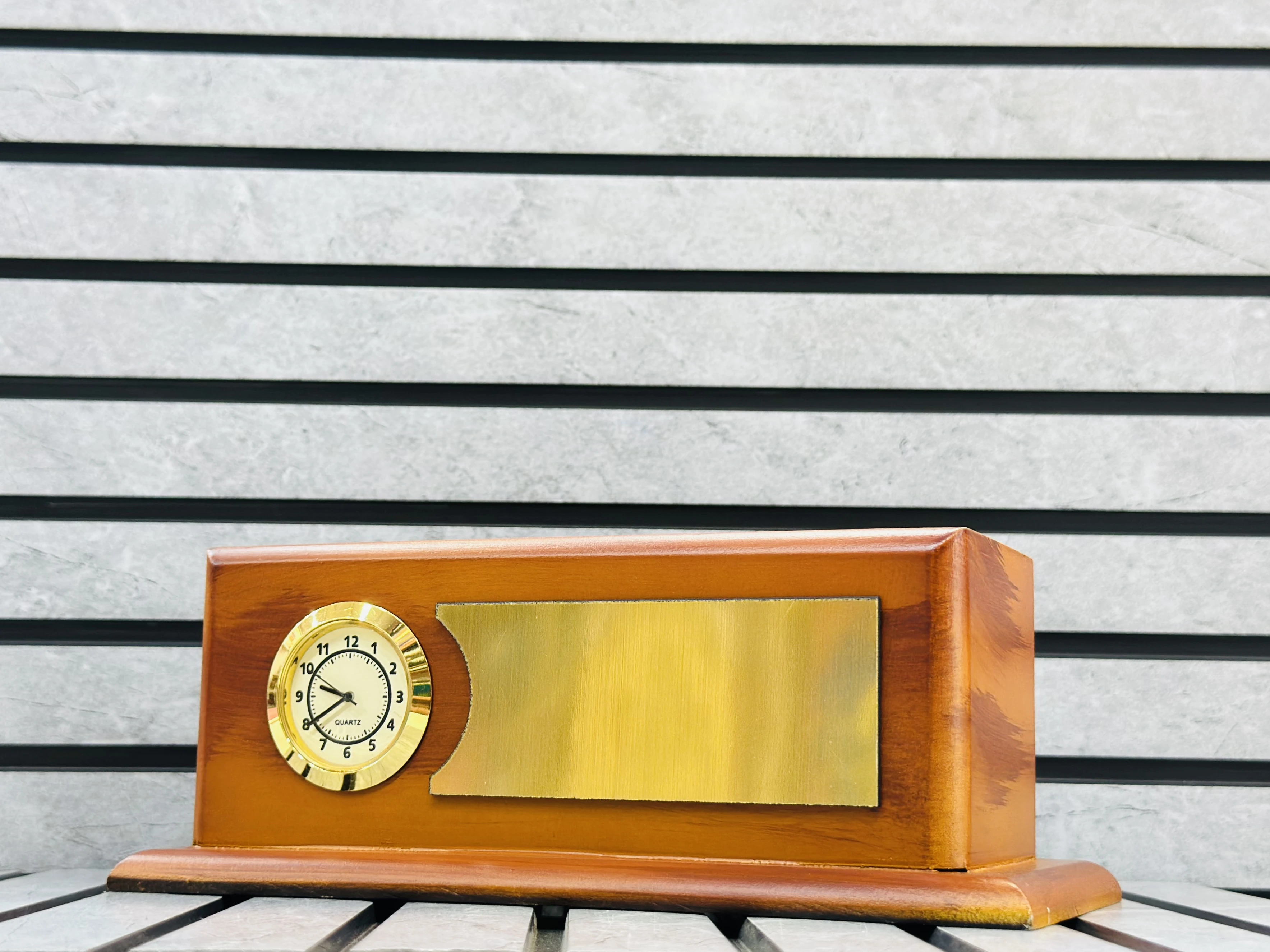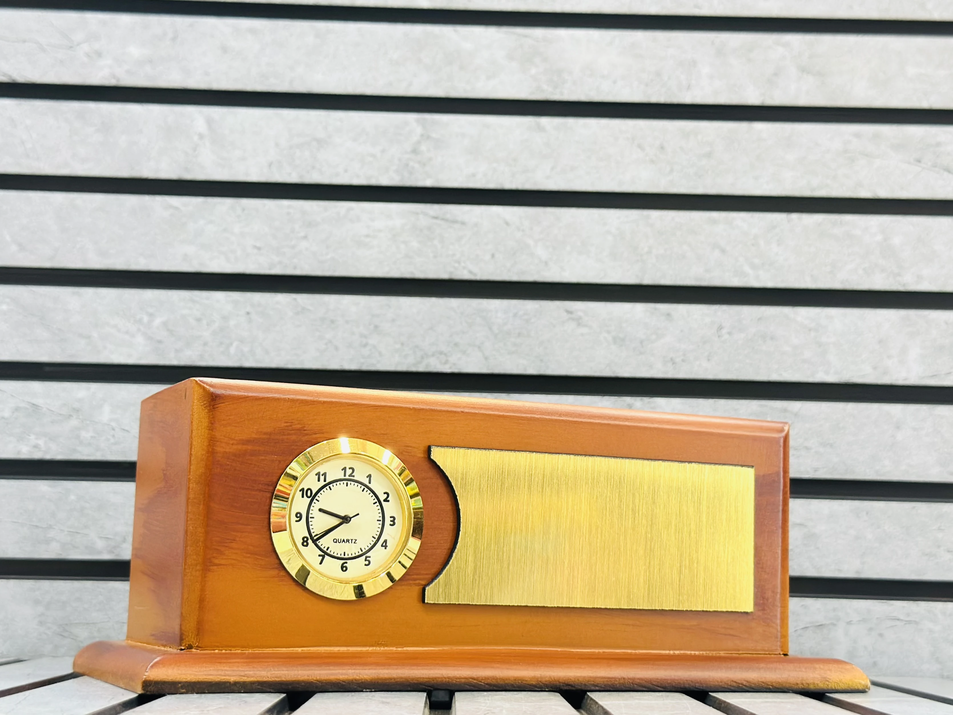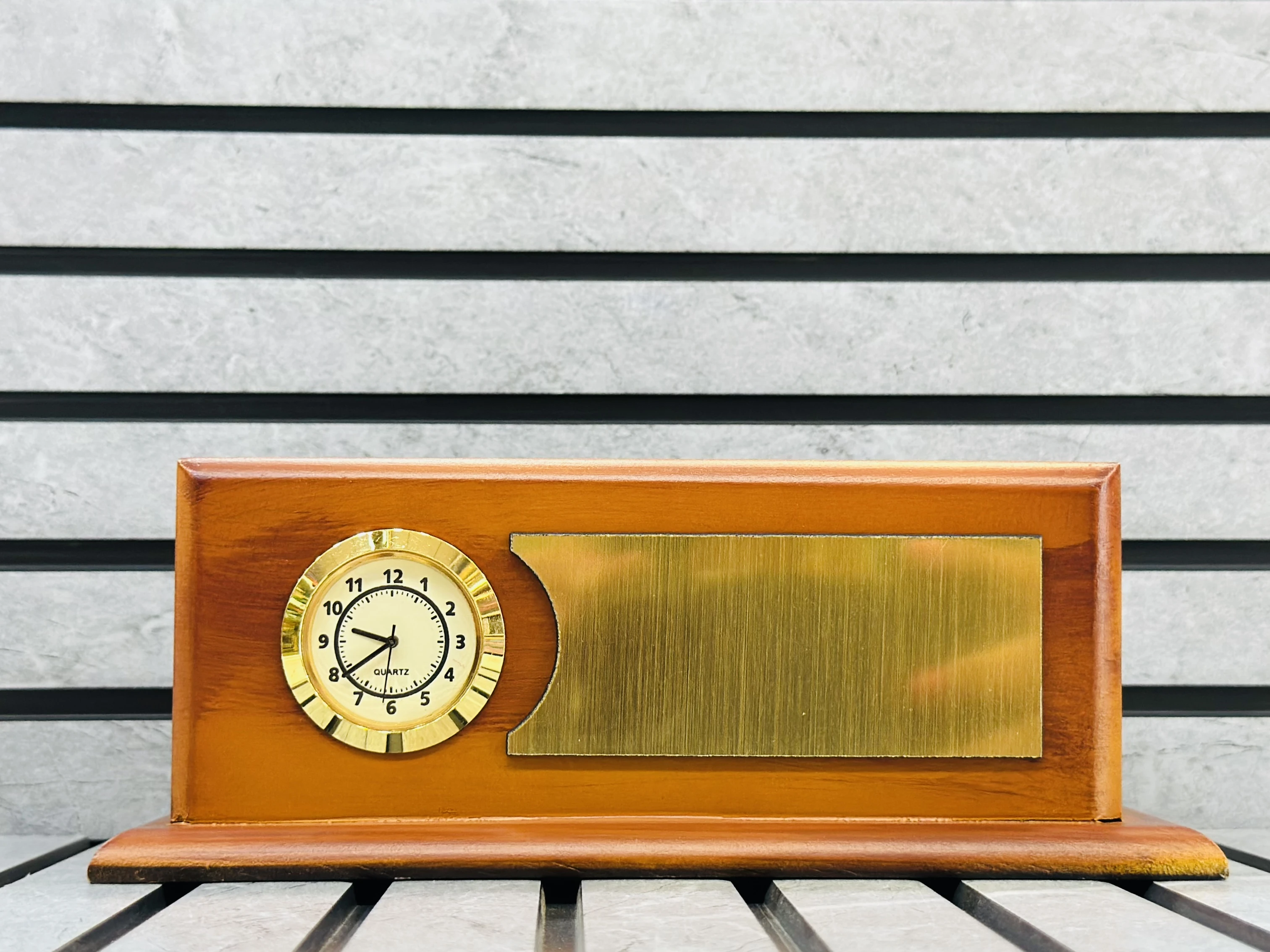 👉 Theme :- wooden desk clock and plaque, likely intended as a gift or promotional item
