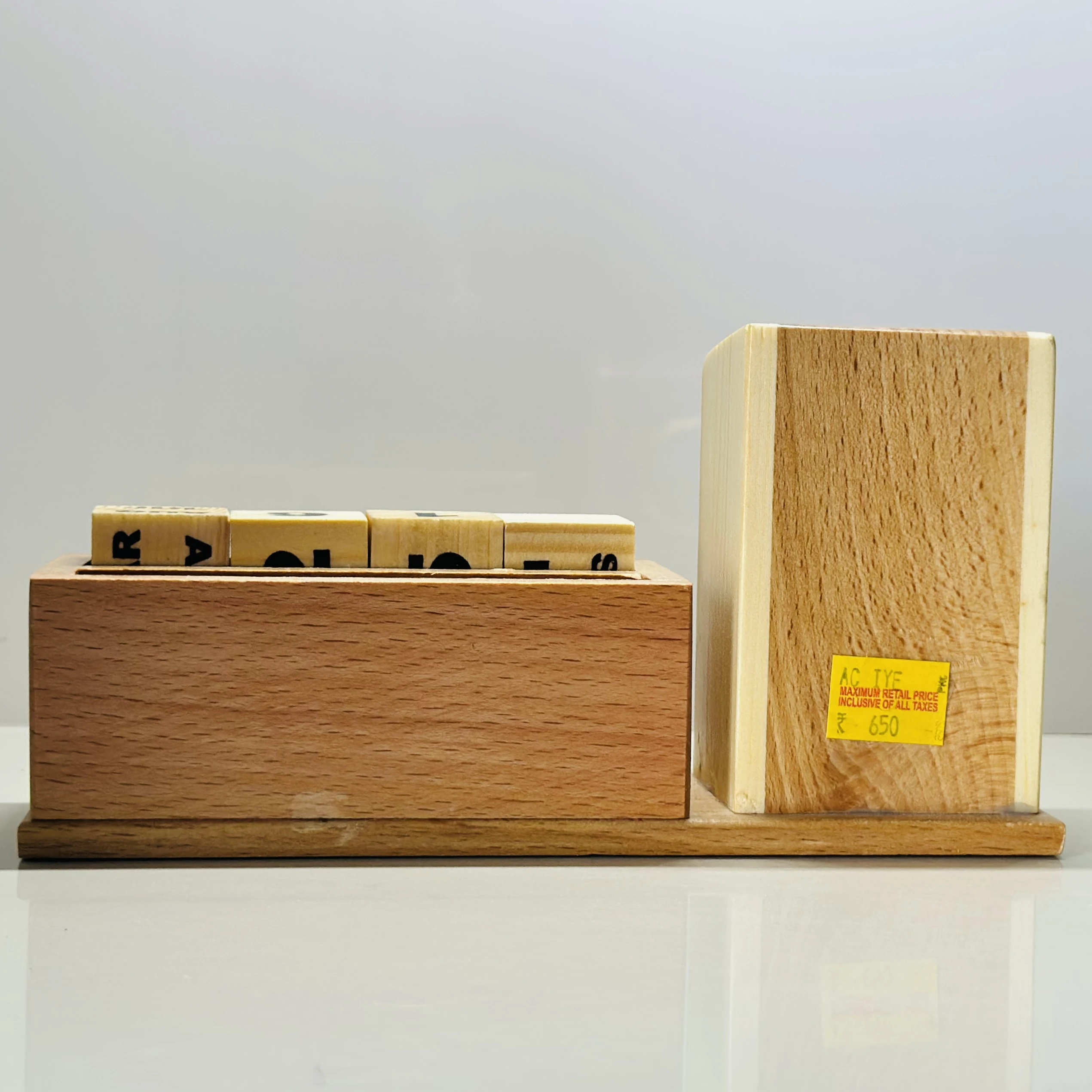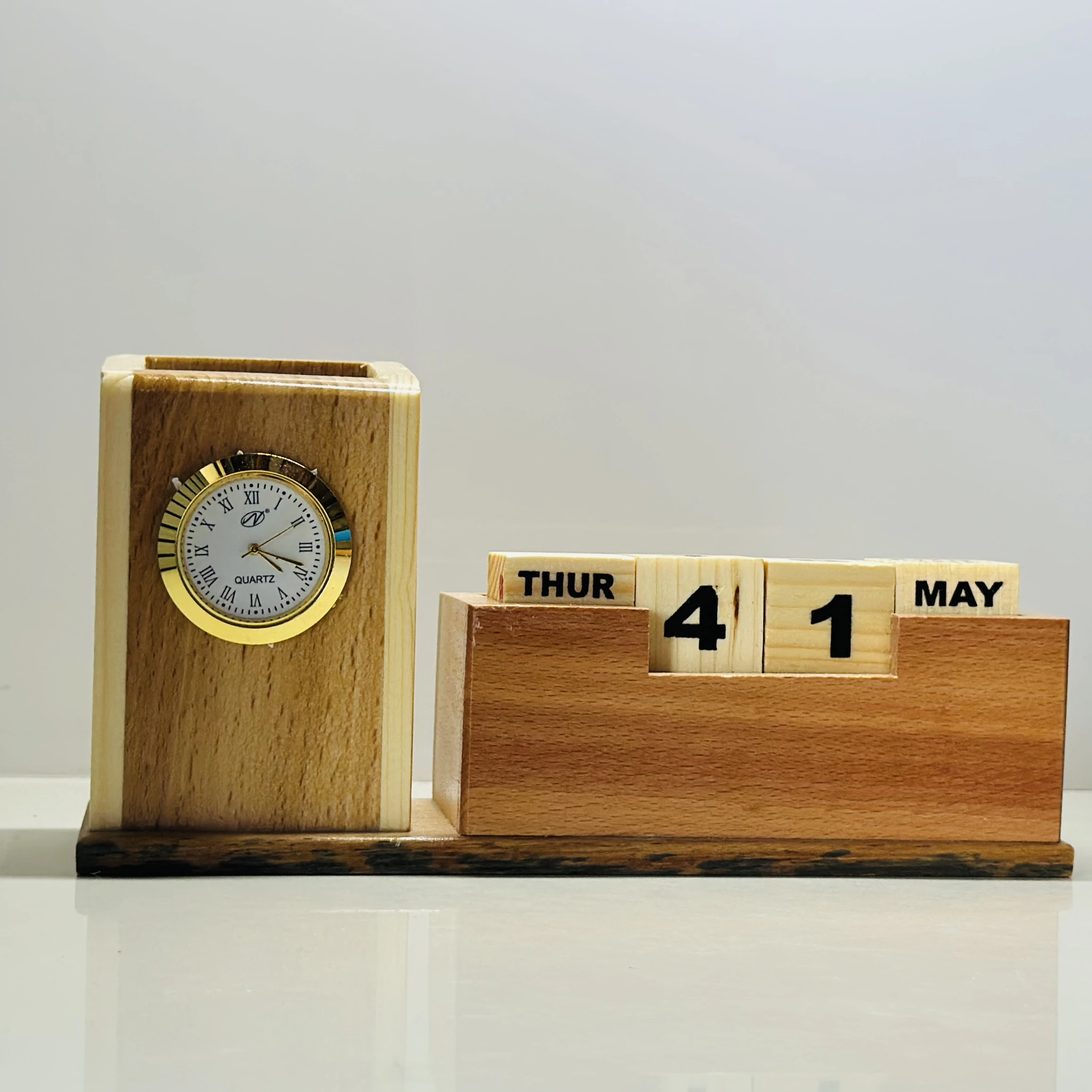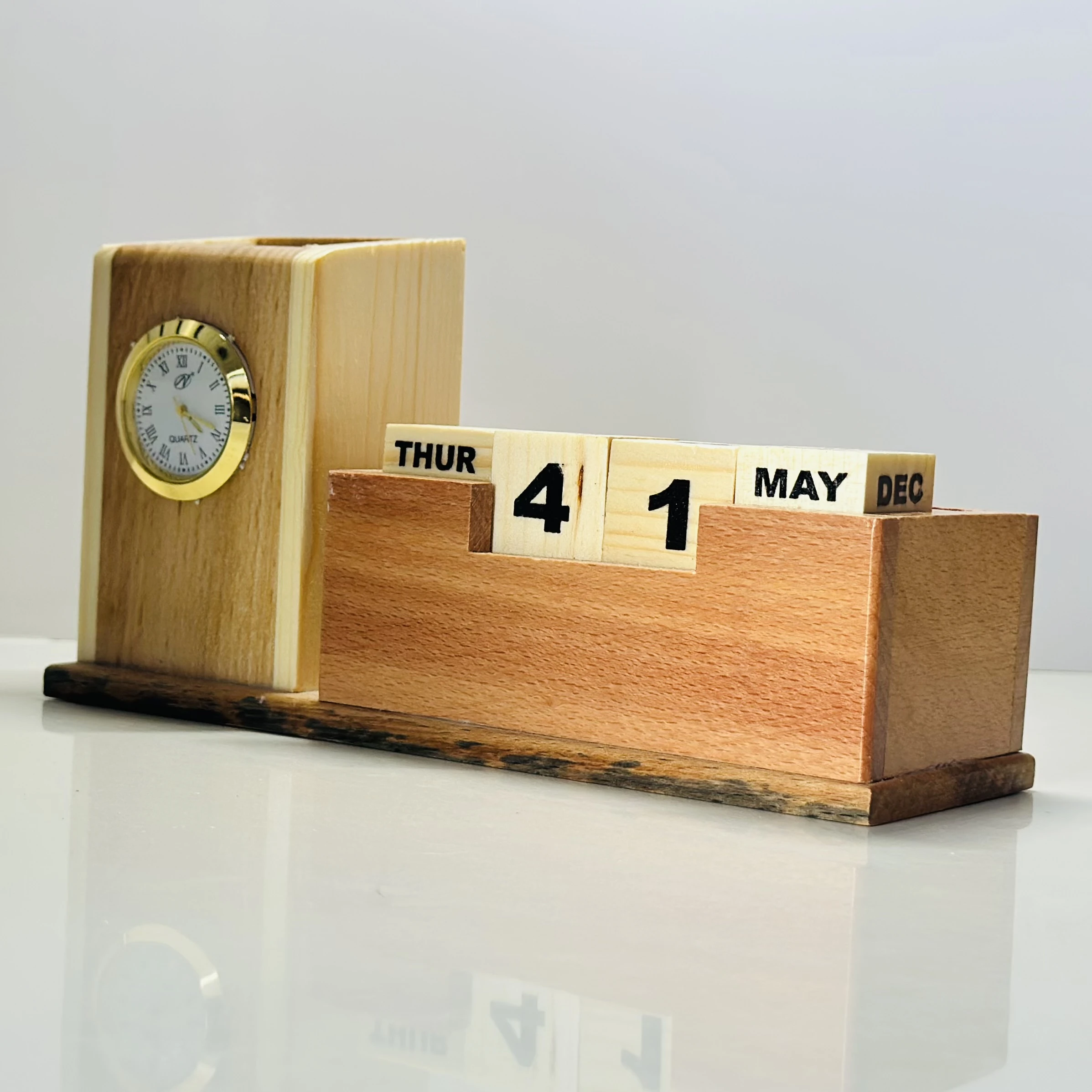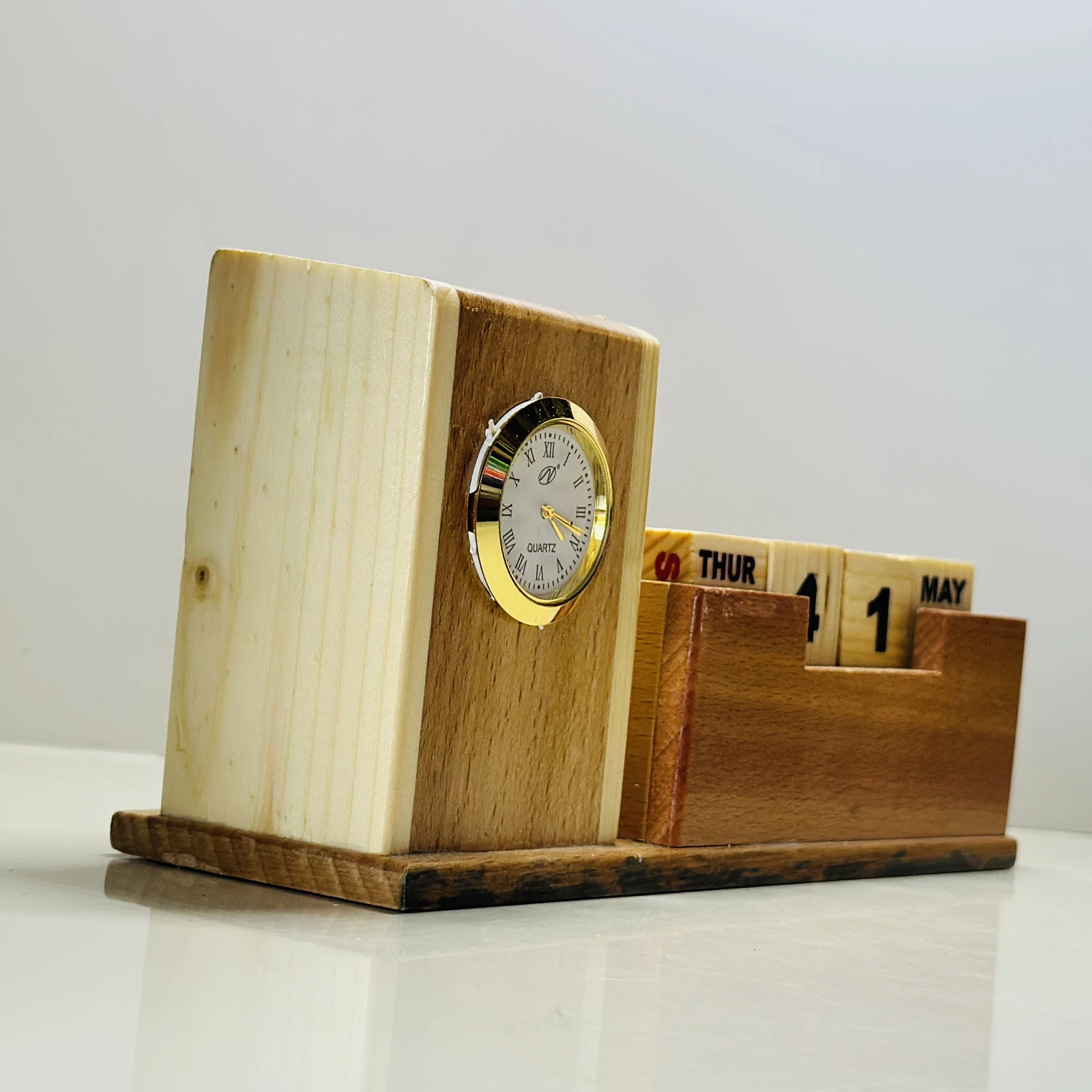 π Theme :- wooden multi-functional desk organizer with a clock and a perpetual calendar.