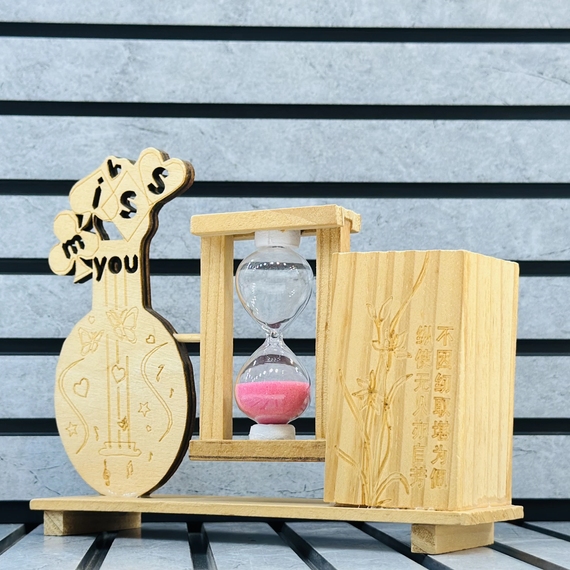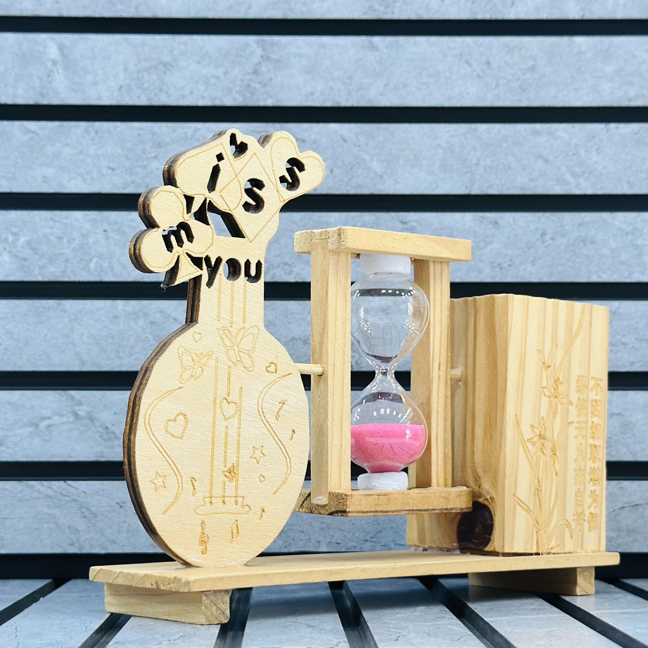 π Theme :- wooden pen stand featuring an integrated hourglass timer and decorative elements.