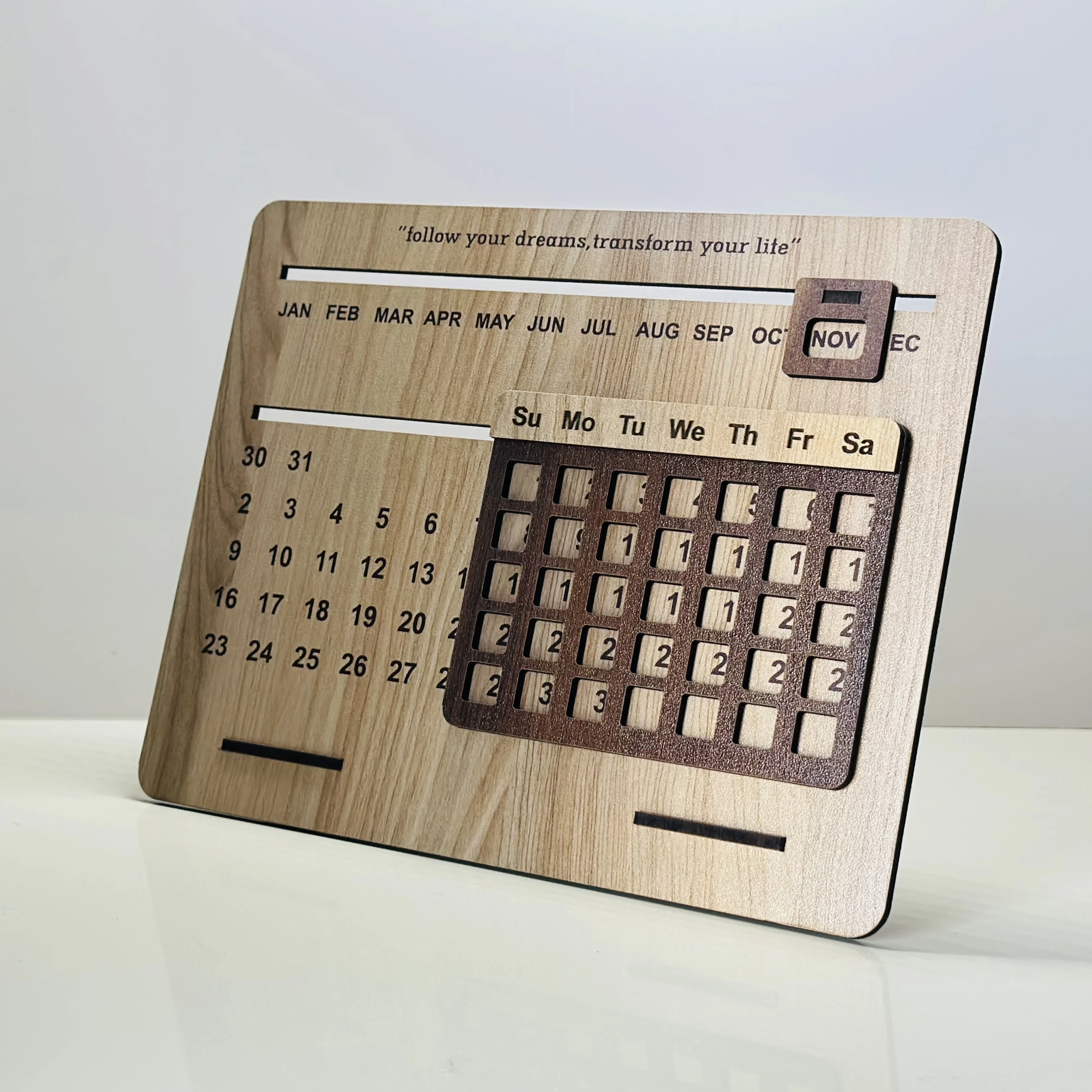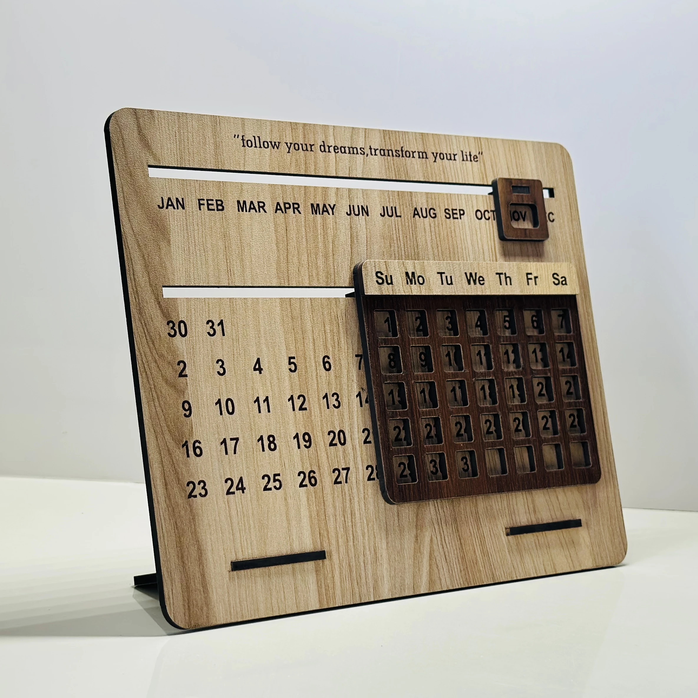 👉 Theme :- wooden perpetual desk calendar. It features a manual system for updating the month, day of the week, and date.