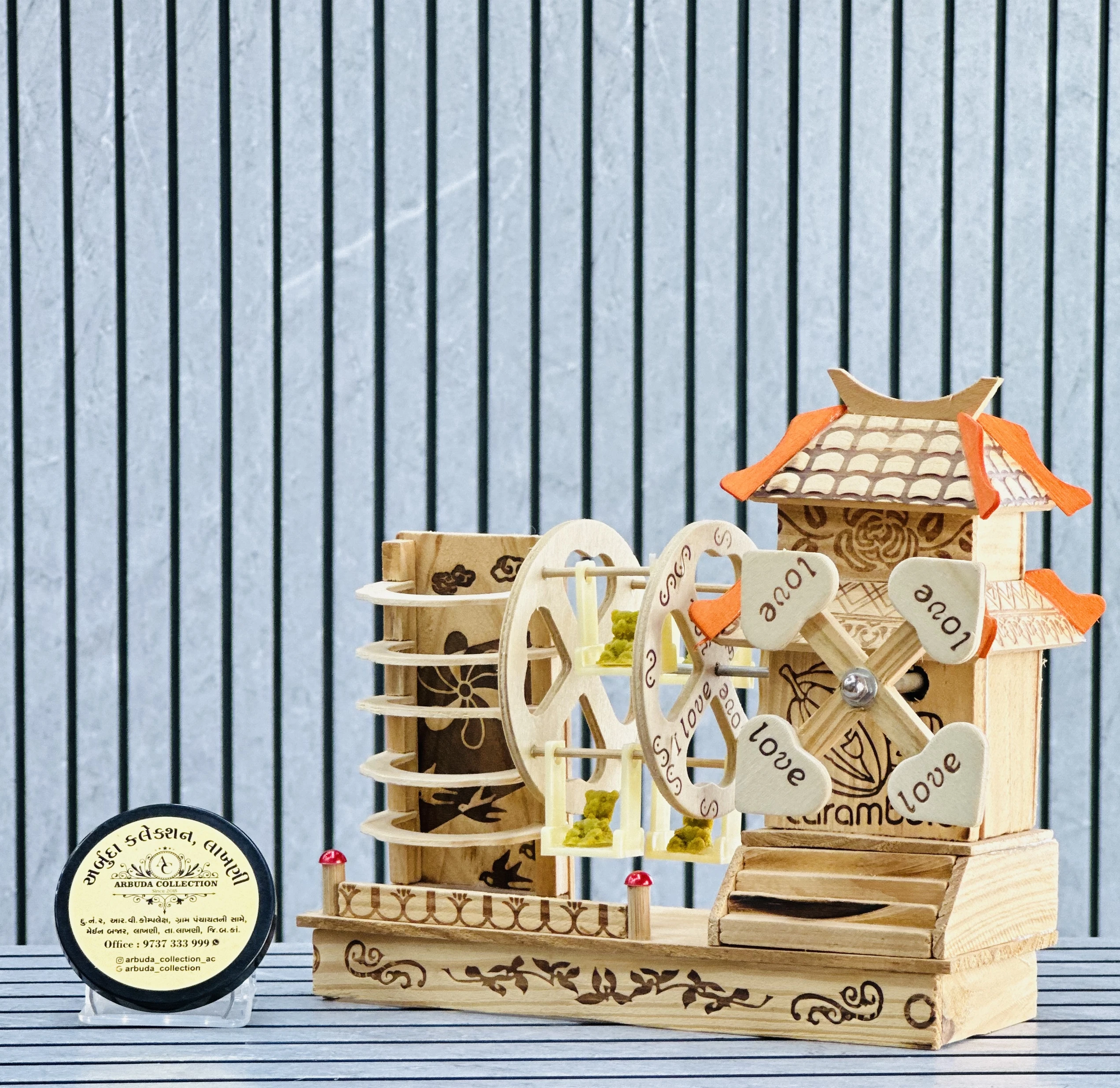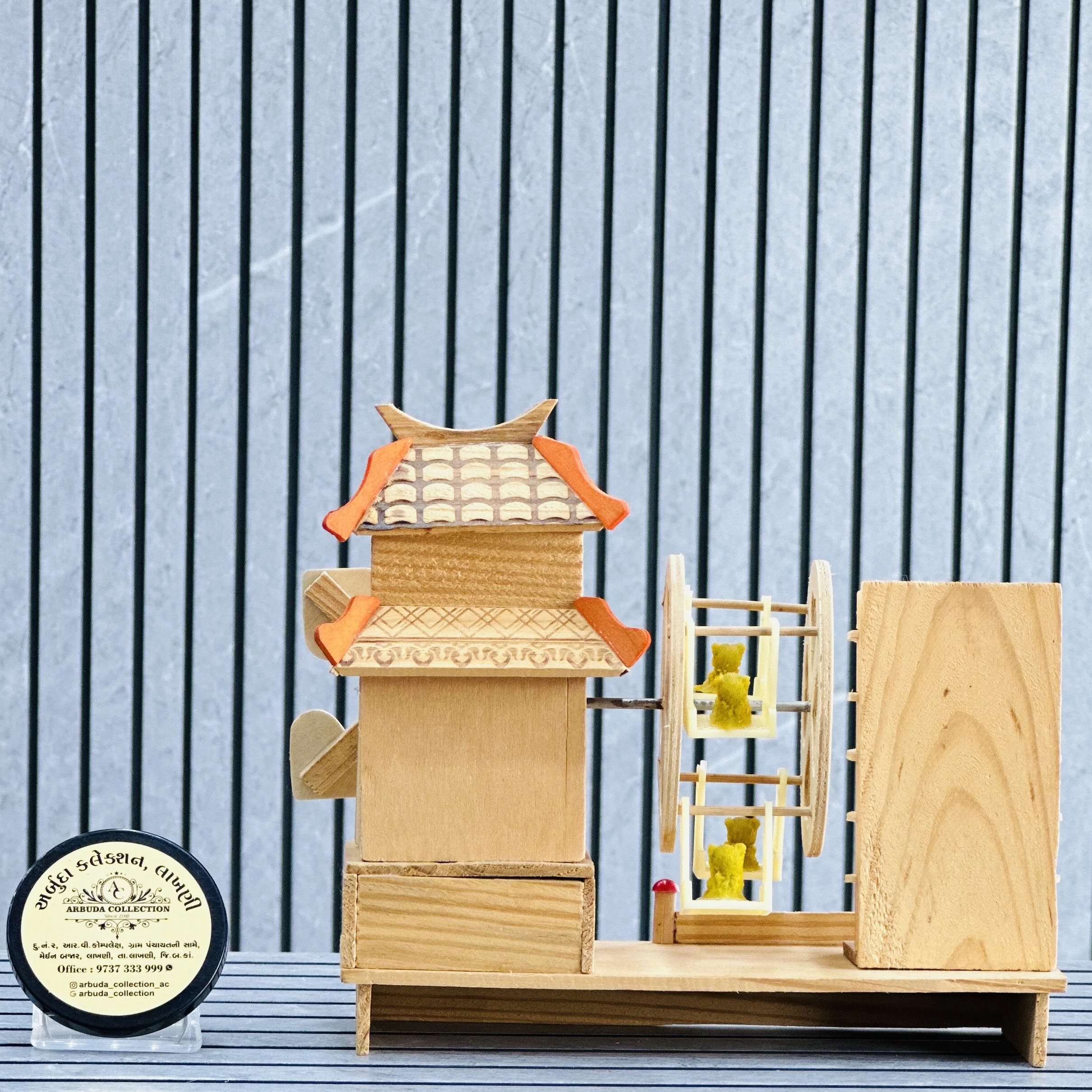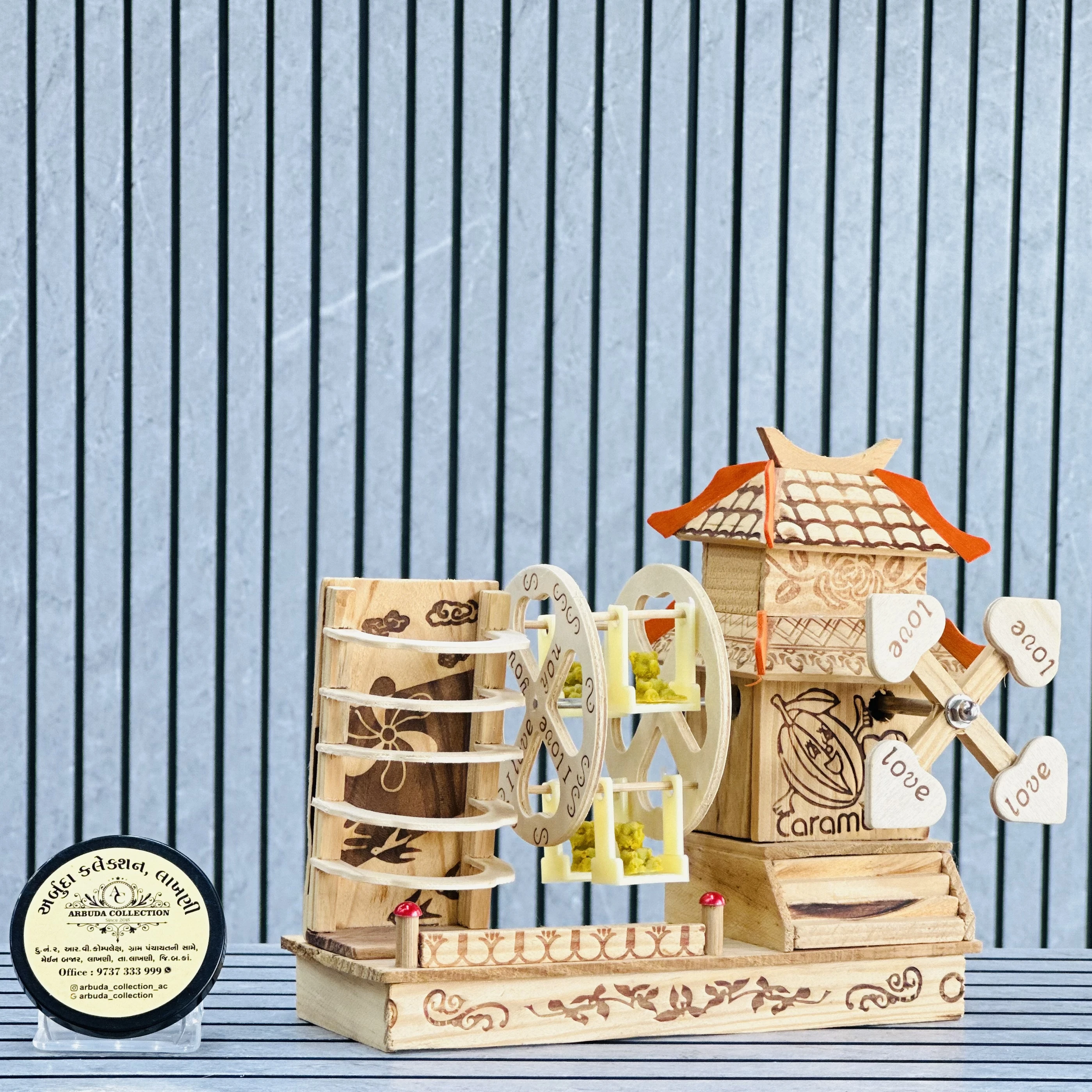 *✅ ARBUDA COLLECTION ✅* *✅9737333999✅* Theme :- Wooden Toys - smris Brand :- arbuda collection lakhani Colour:- Brown Style:- Designer Fancy look Material:- It is crafted from wood giving it an antique and rustic aesthetic. Dimensions :- 9 hight, 10 width Uses :- Wooden musical carousel or a similar decorative piece, Possible incorporating elements of a water wheel and a swing or j hula. Cleaning:- wipe clean with a dry cloth Origin:- made in India by local artists Other words:- limited addition…