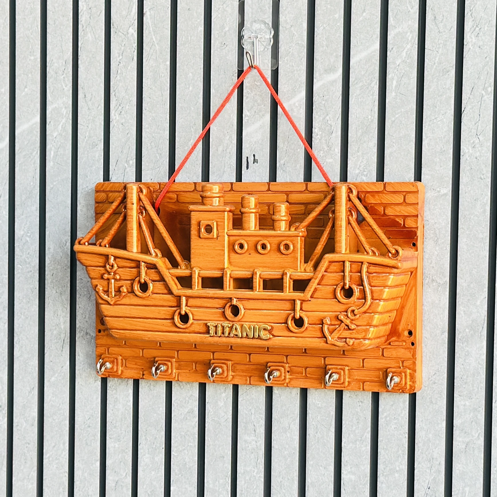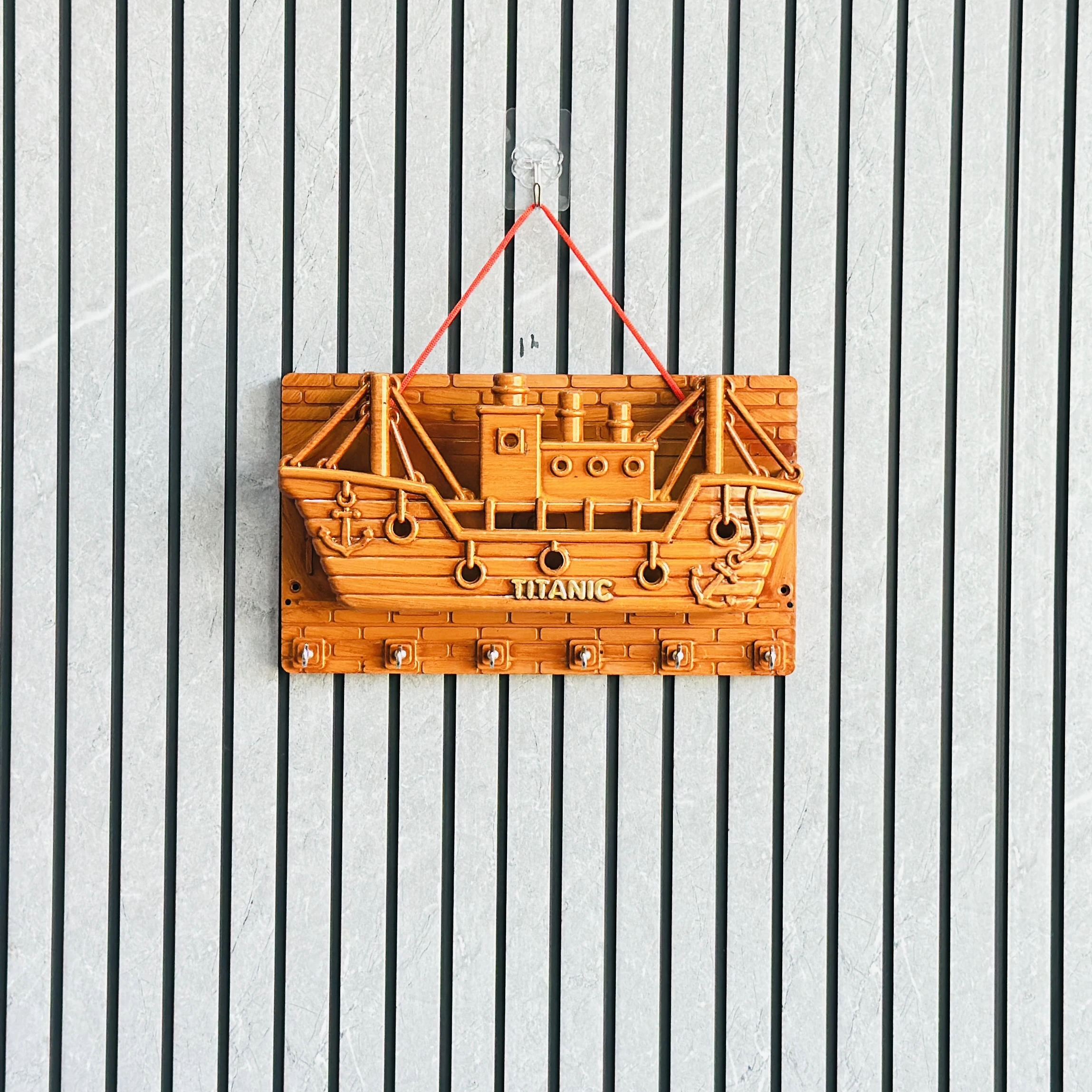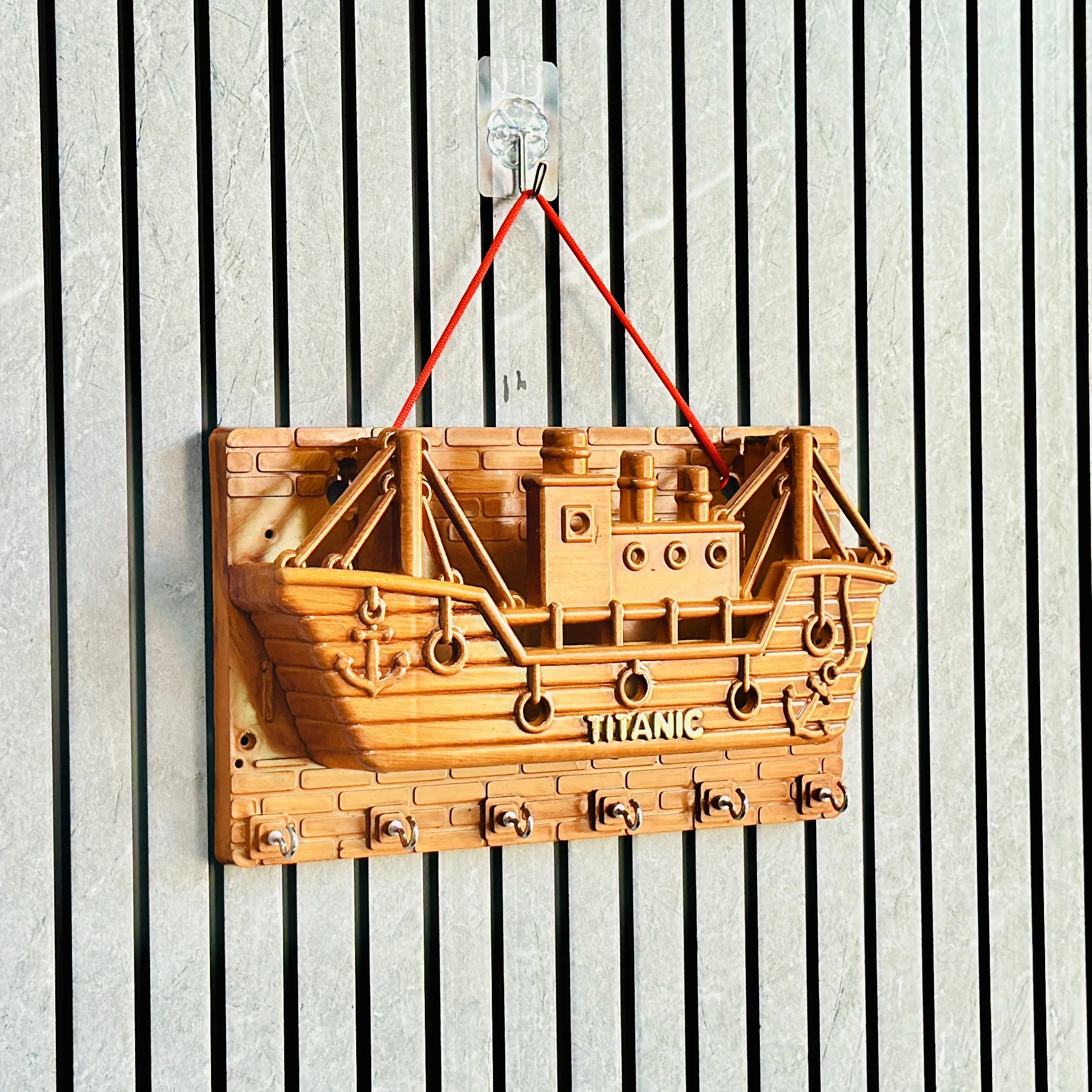 wooden wall-mounted key holder (BRYTZG )shaped like a ship labeled "TITANIC".