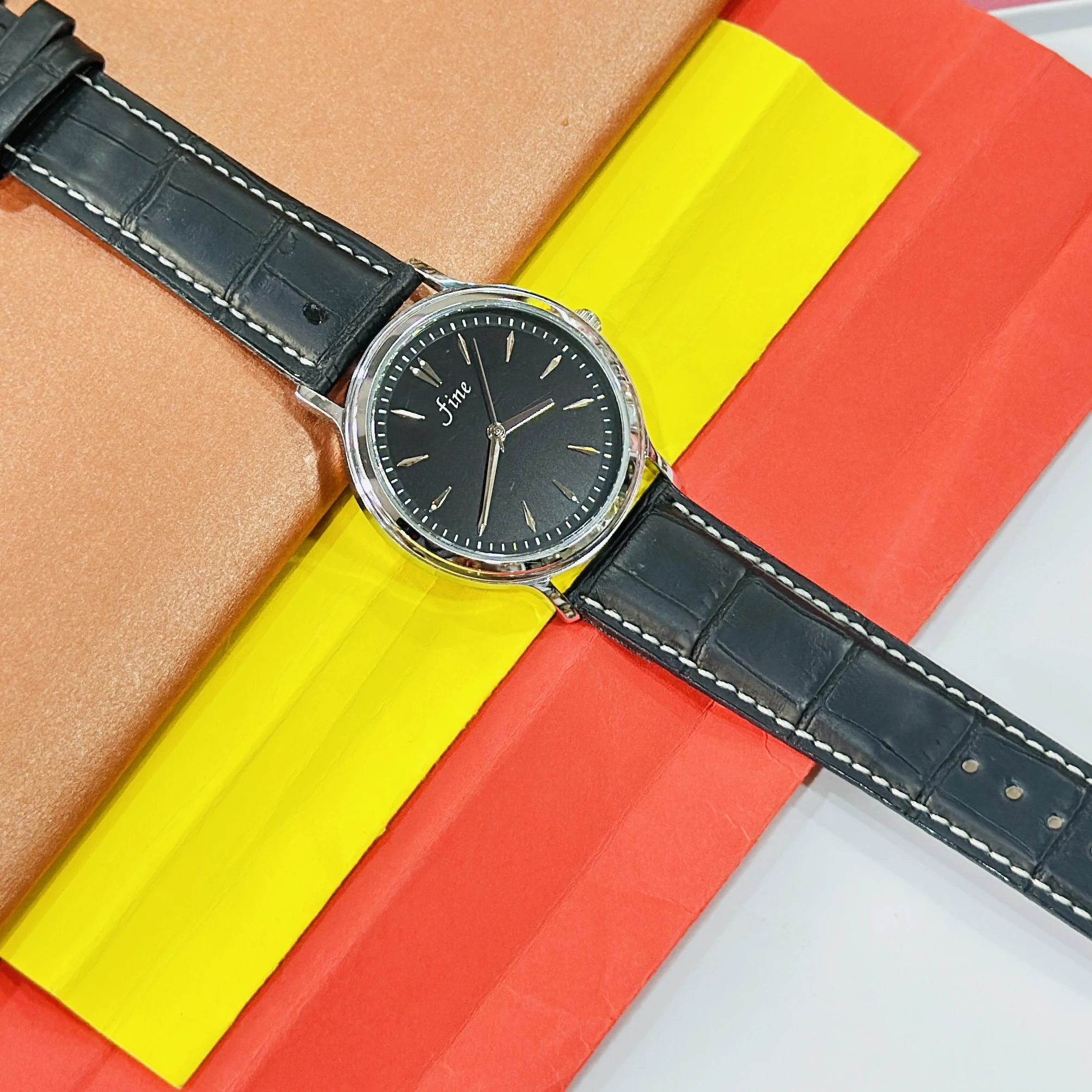 wrist watch featuring a black dial branded as "fine" and a black leather strap.