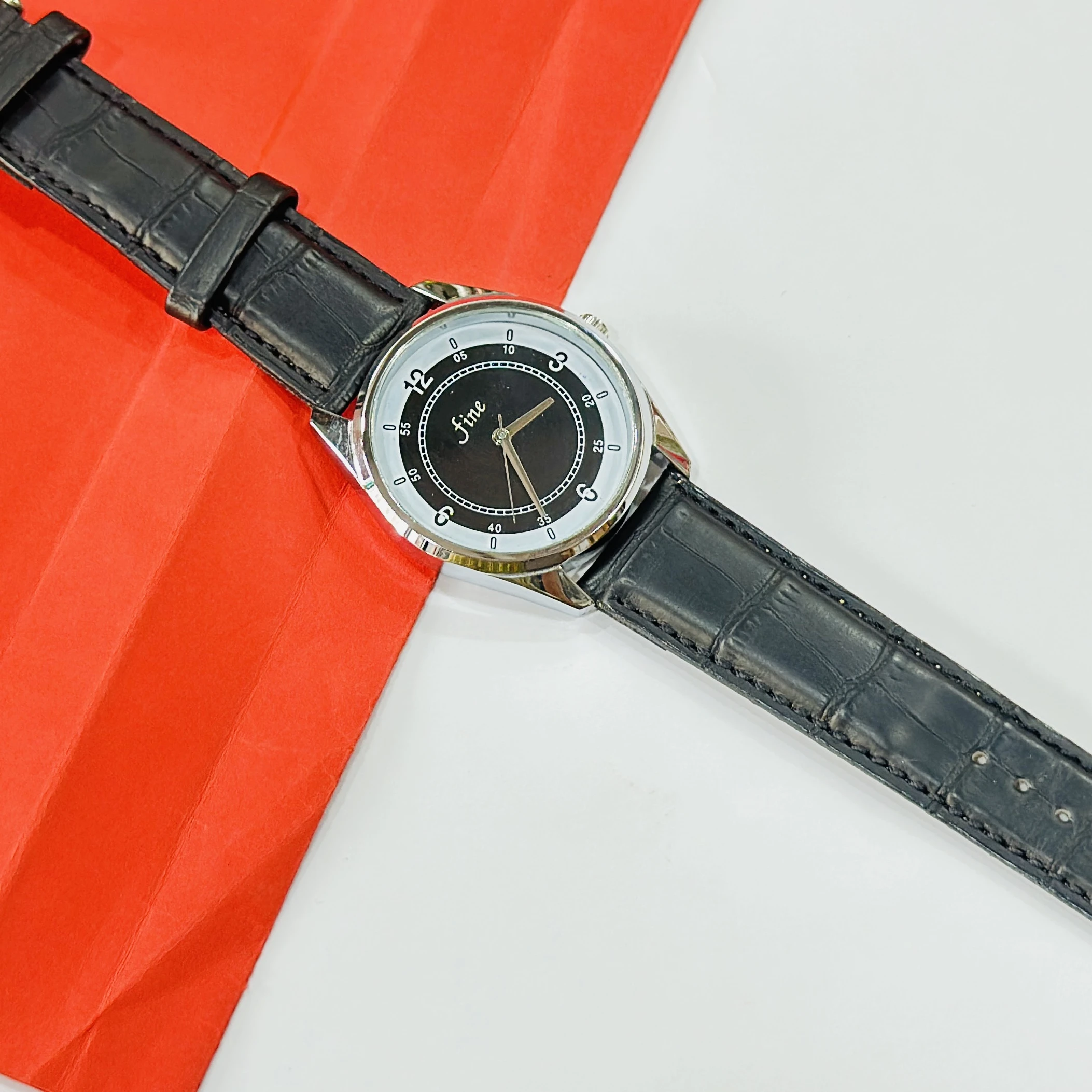 👉Theme :- wrist watch featuring a black dial branded as "fine" and a black leather strap.