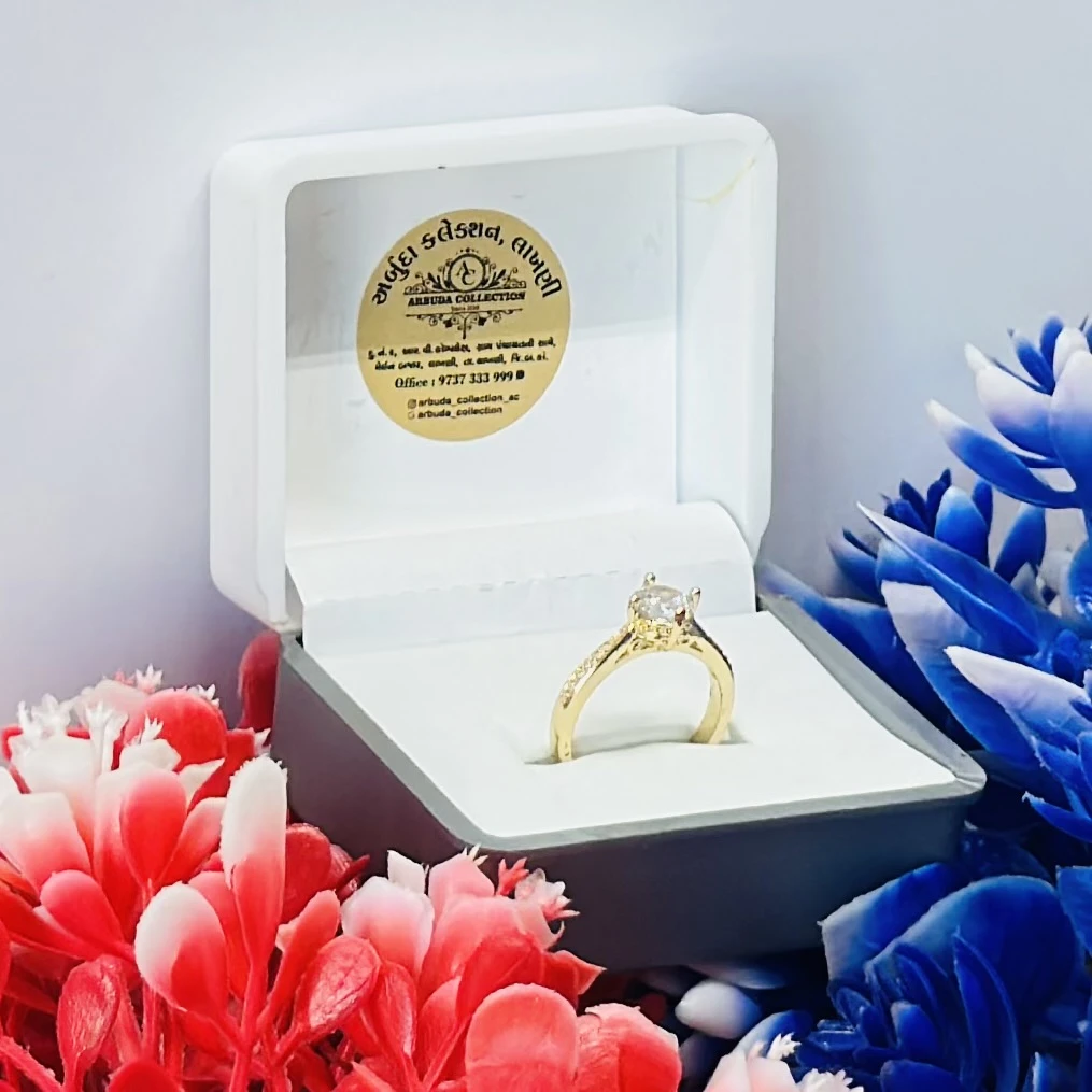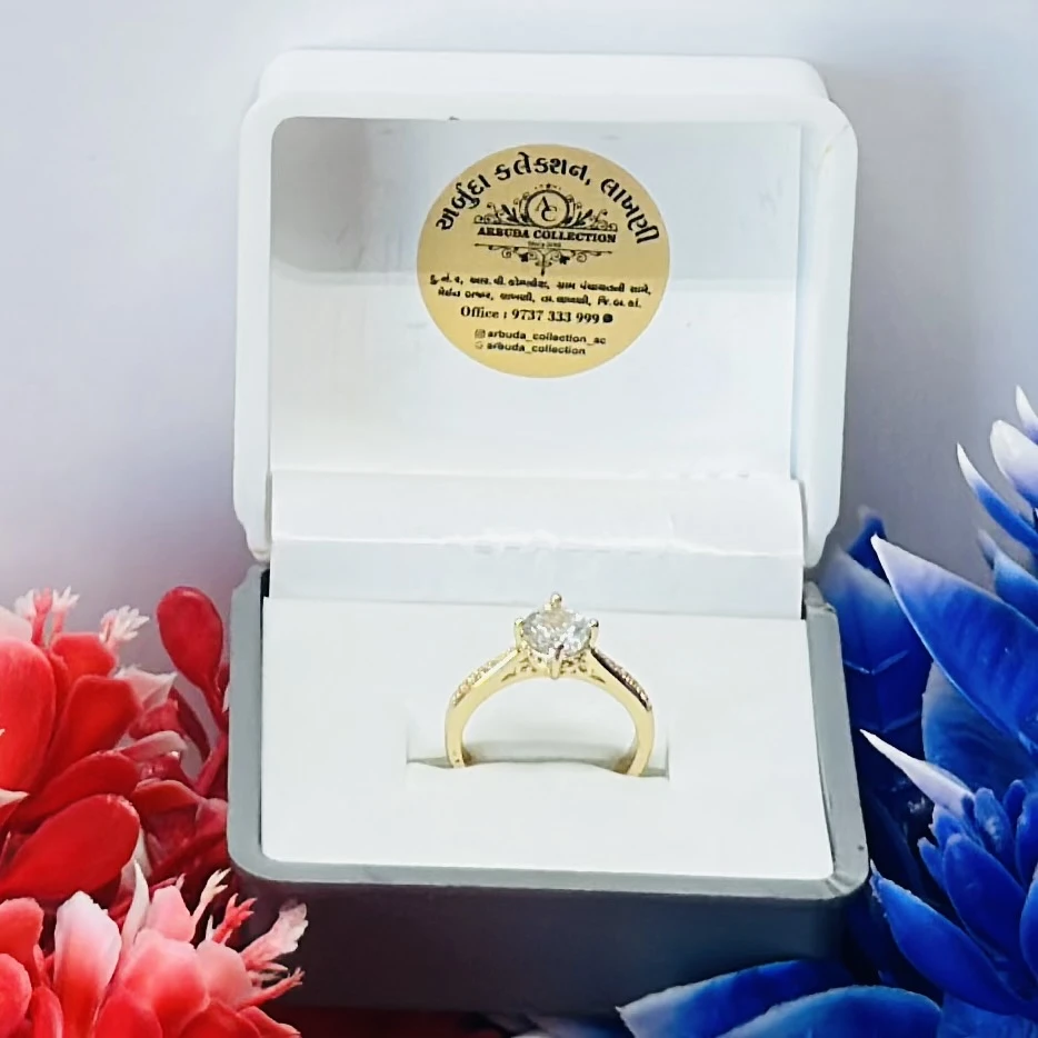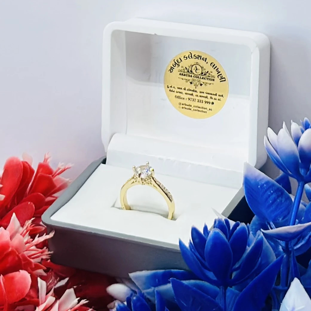 👉 Theme :- Yellow gold engagement ring with a central stone and side accents.