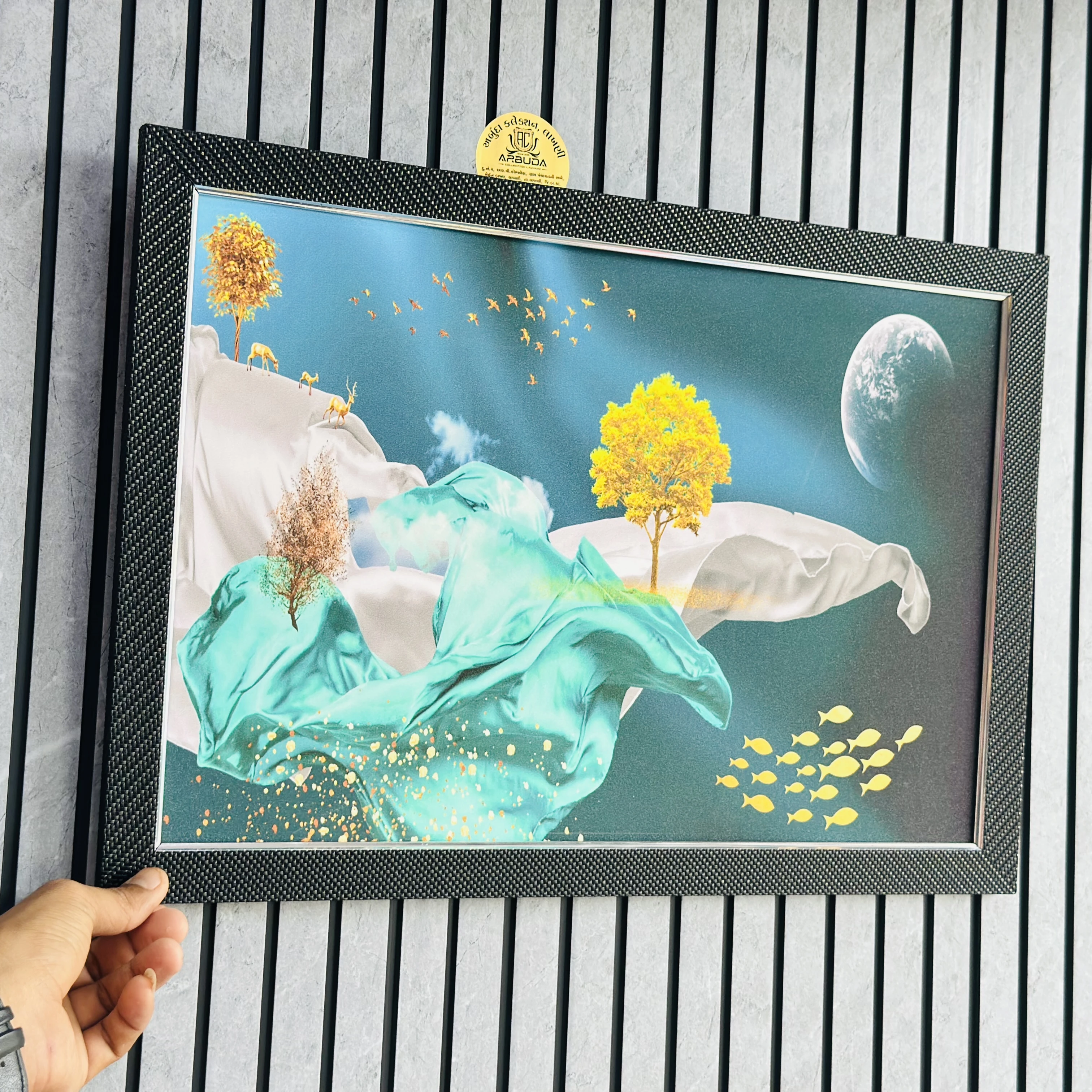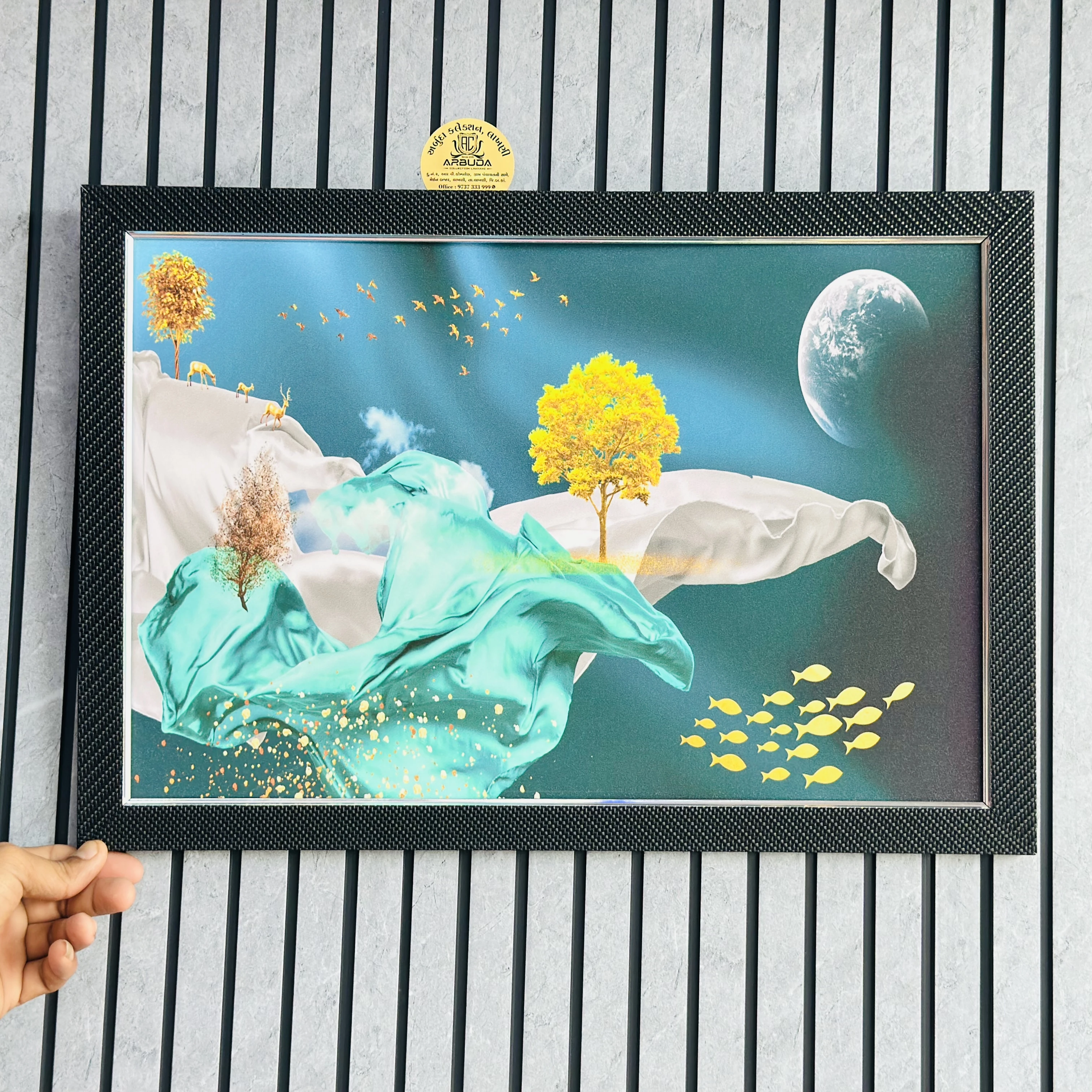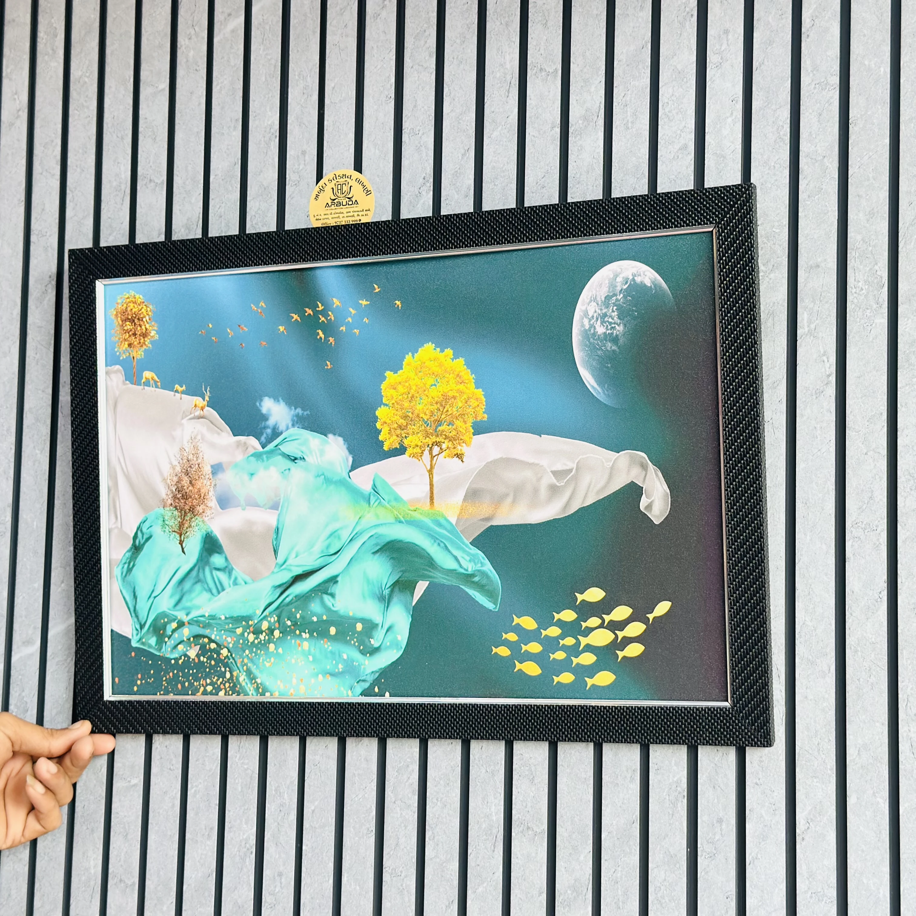 👉 Theme :- 3D ocean art wall frame featuring an underwater scene with yellow trees, swimming fish, and a moonlit backdrop.