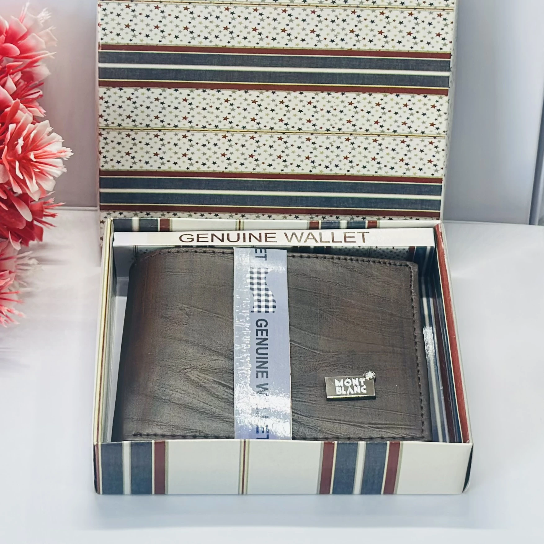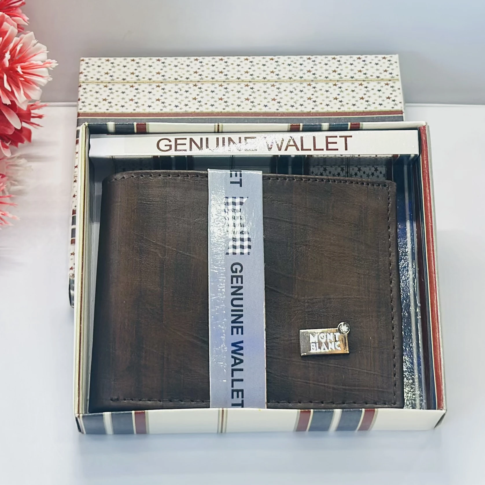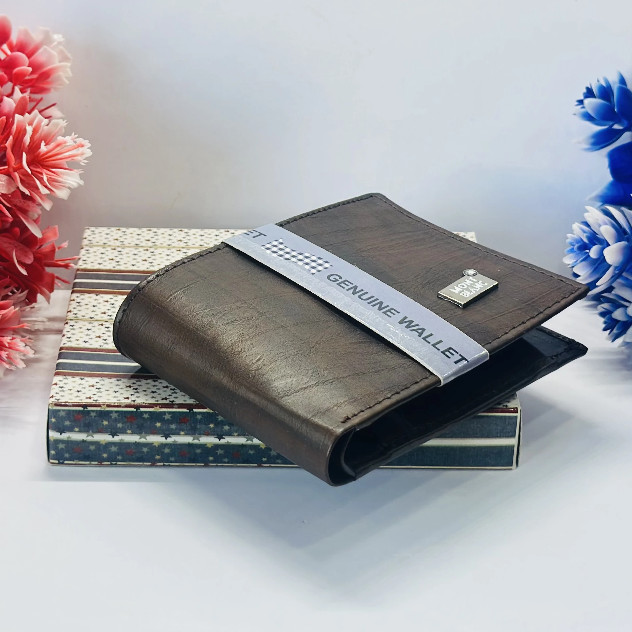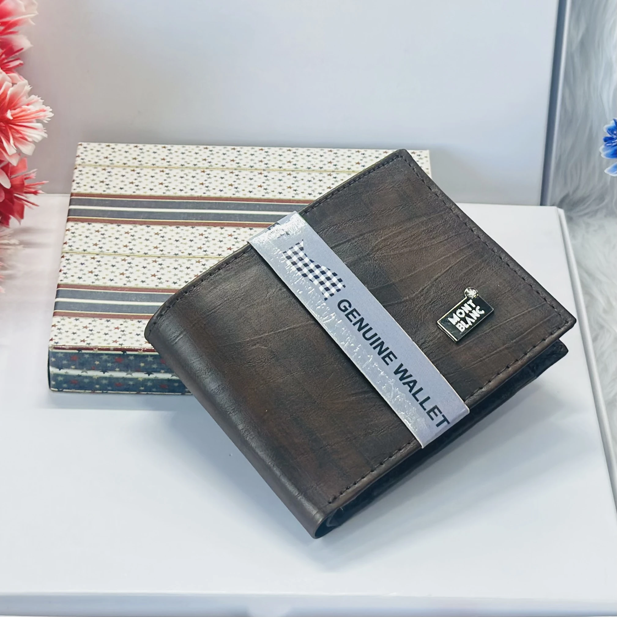 π Theme :- brown bifold wallet, possibly made of genuine leather, branded as a Montblanc product.