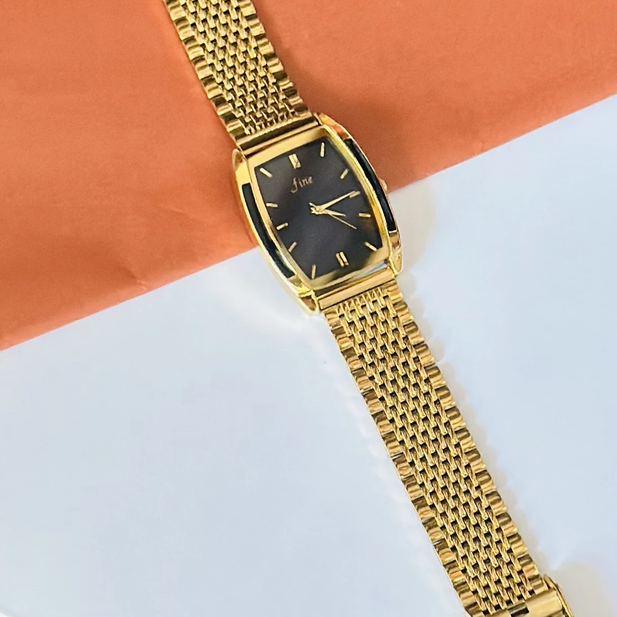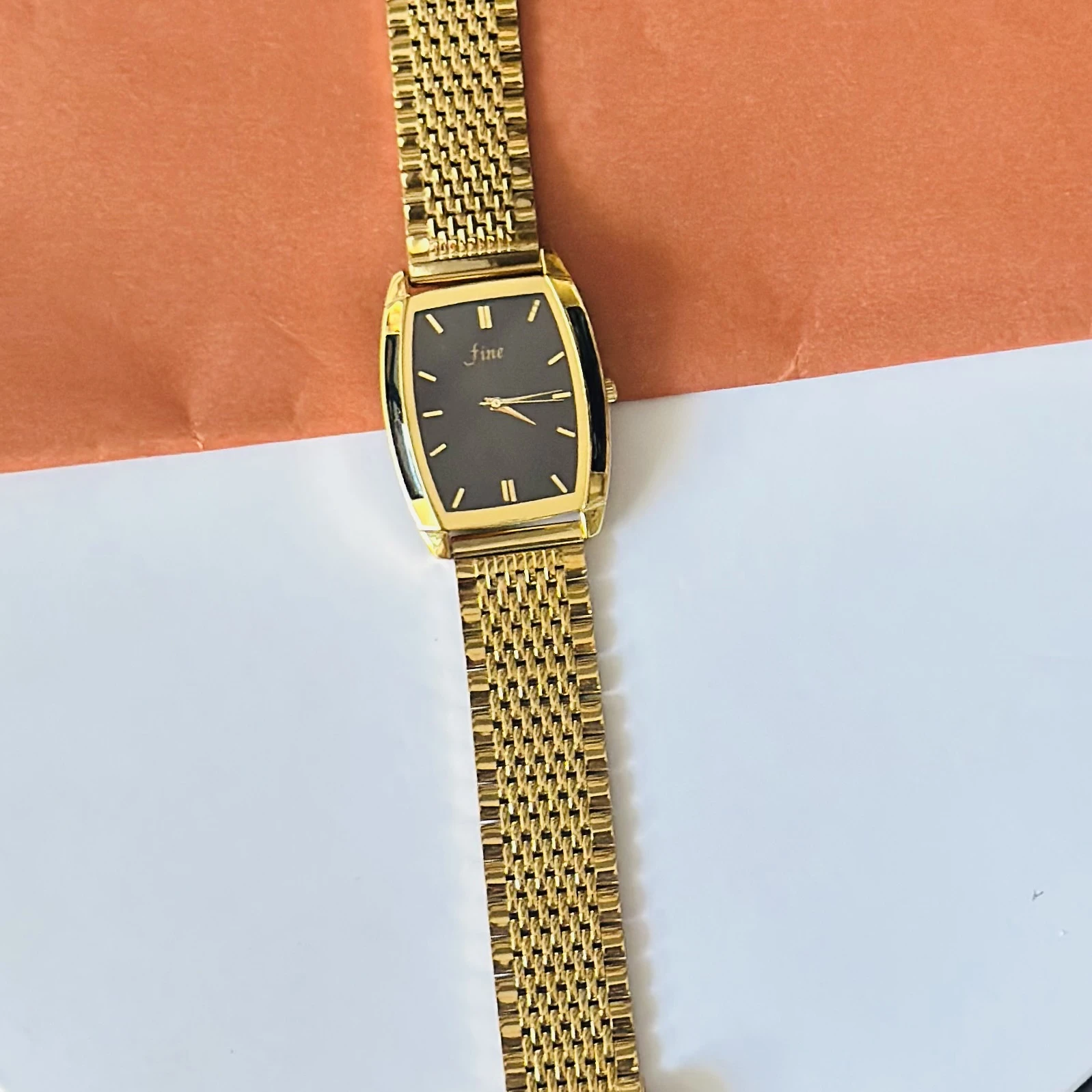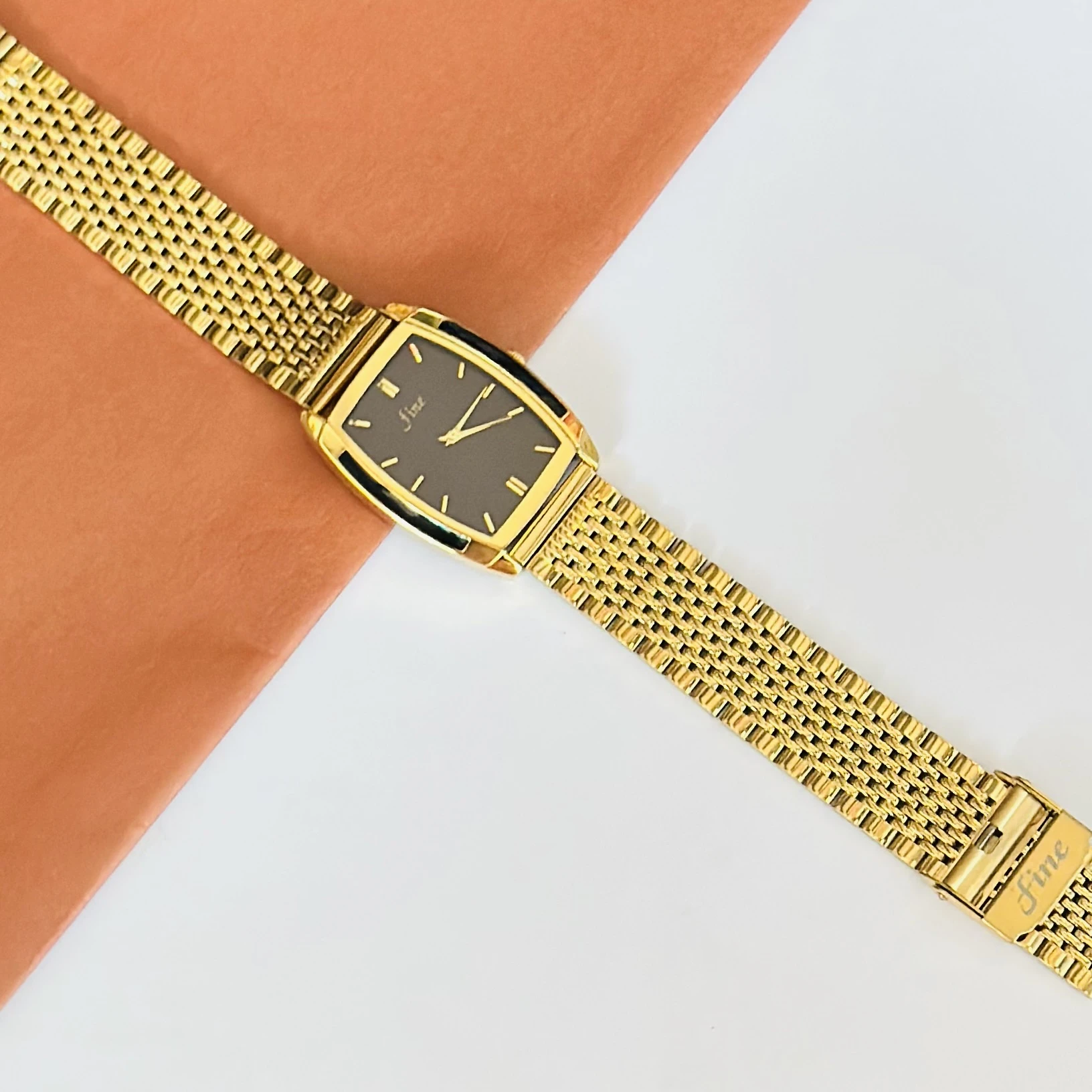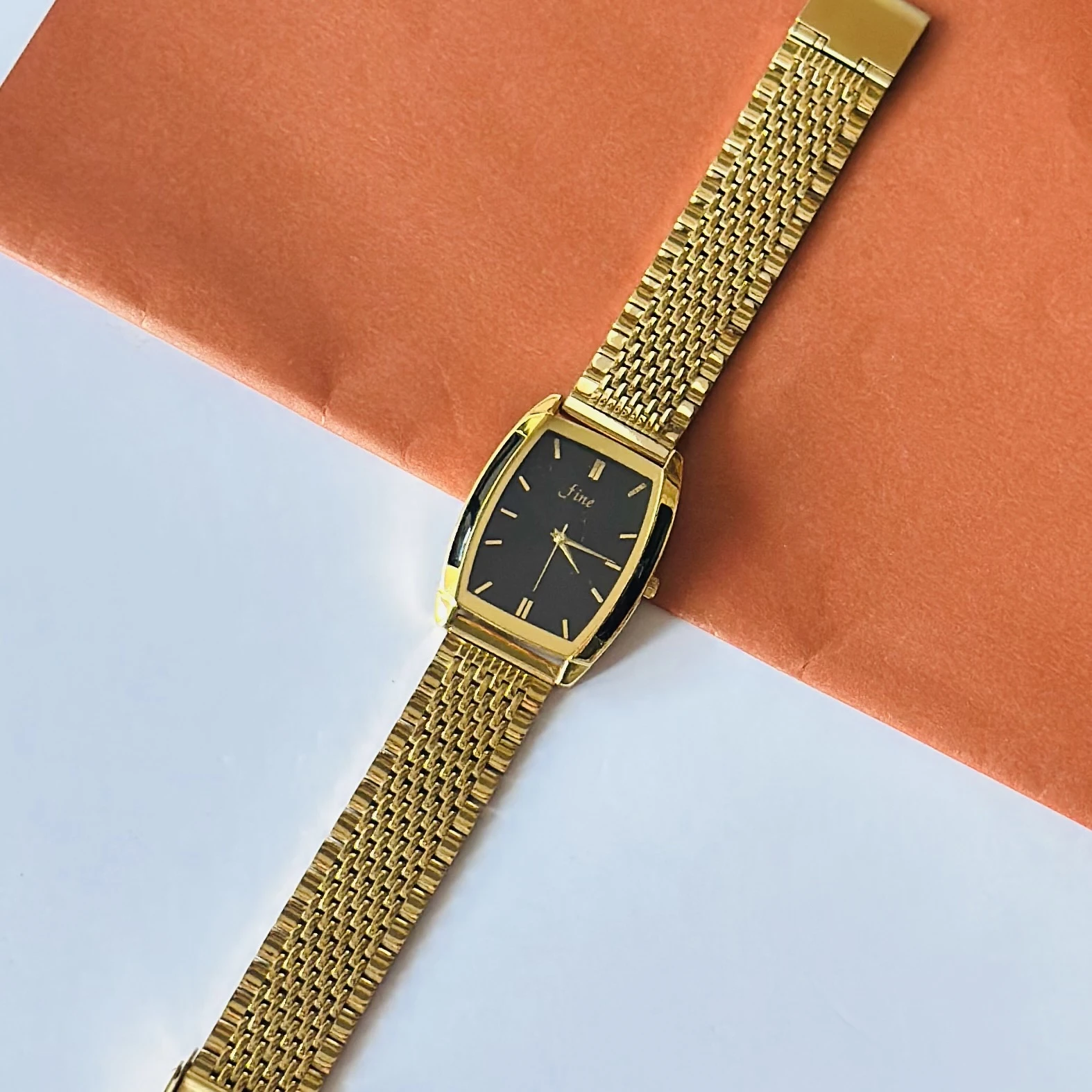 👉 Theme :- Gold tone analog quartz watch with a metal strap.
