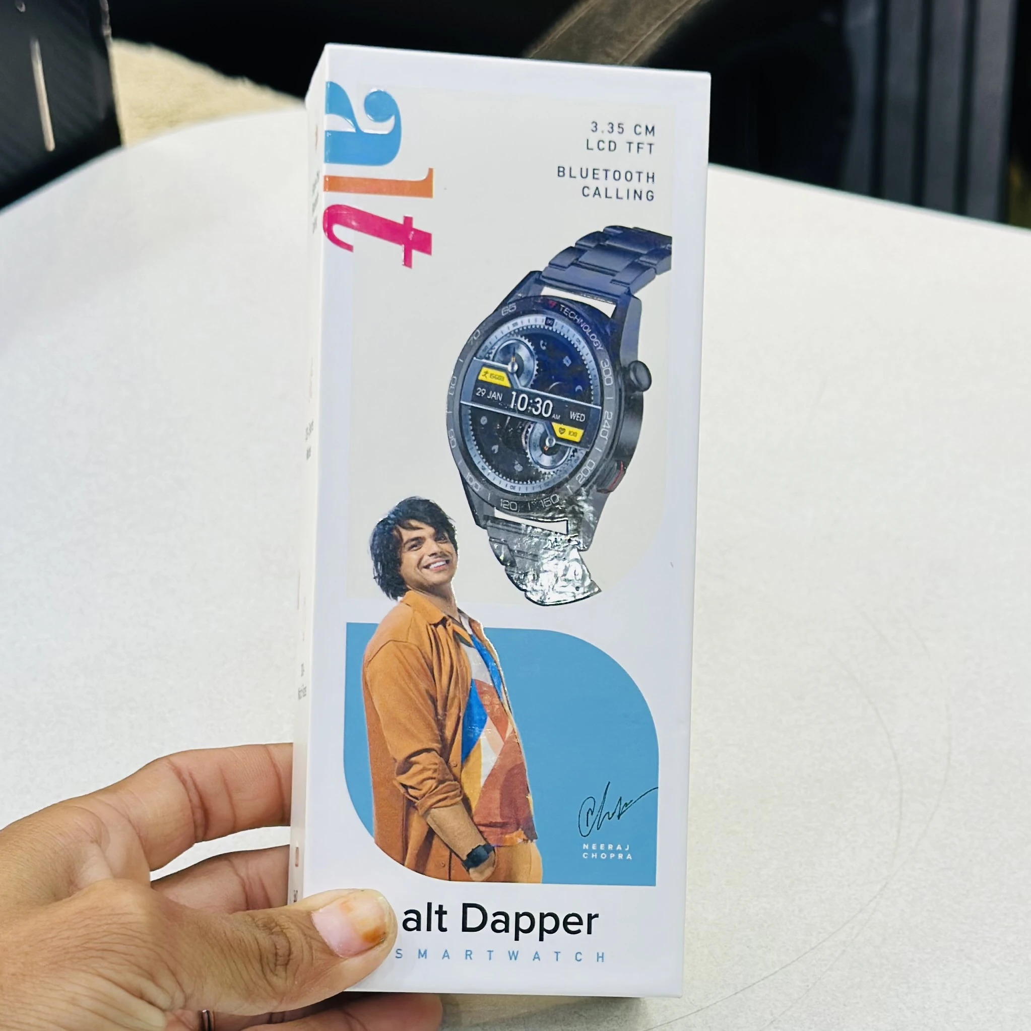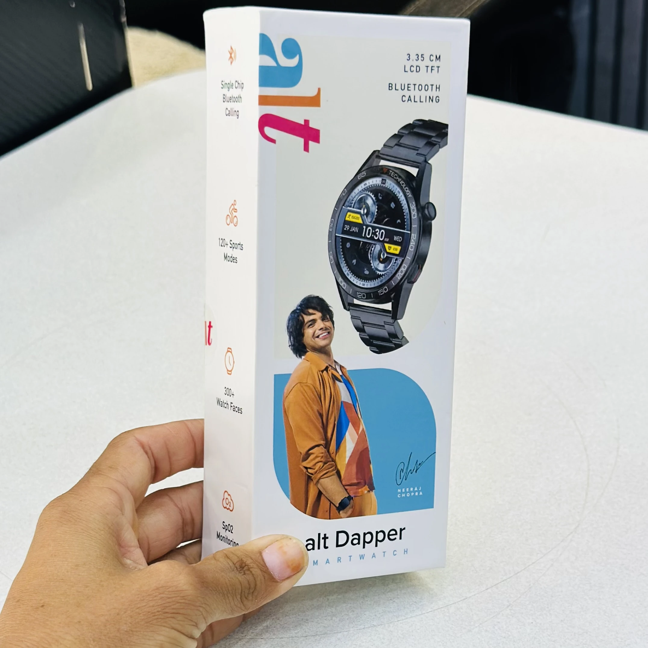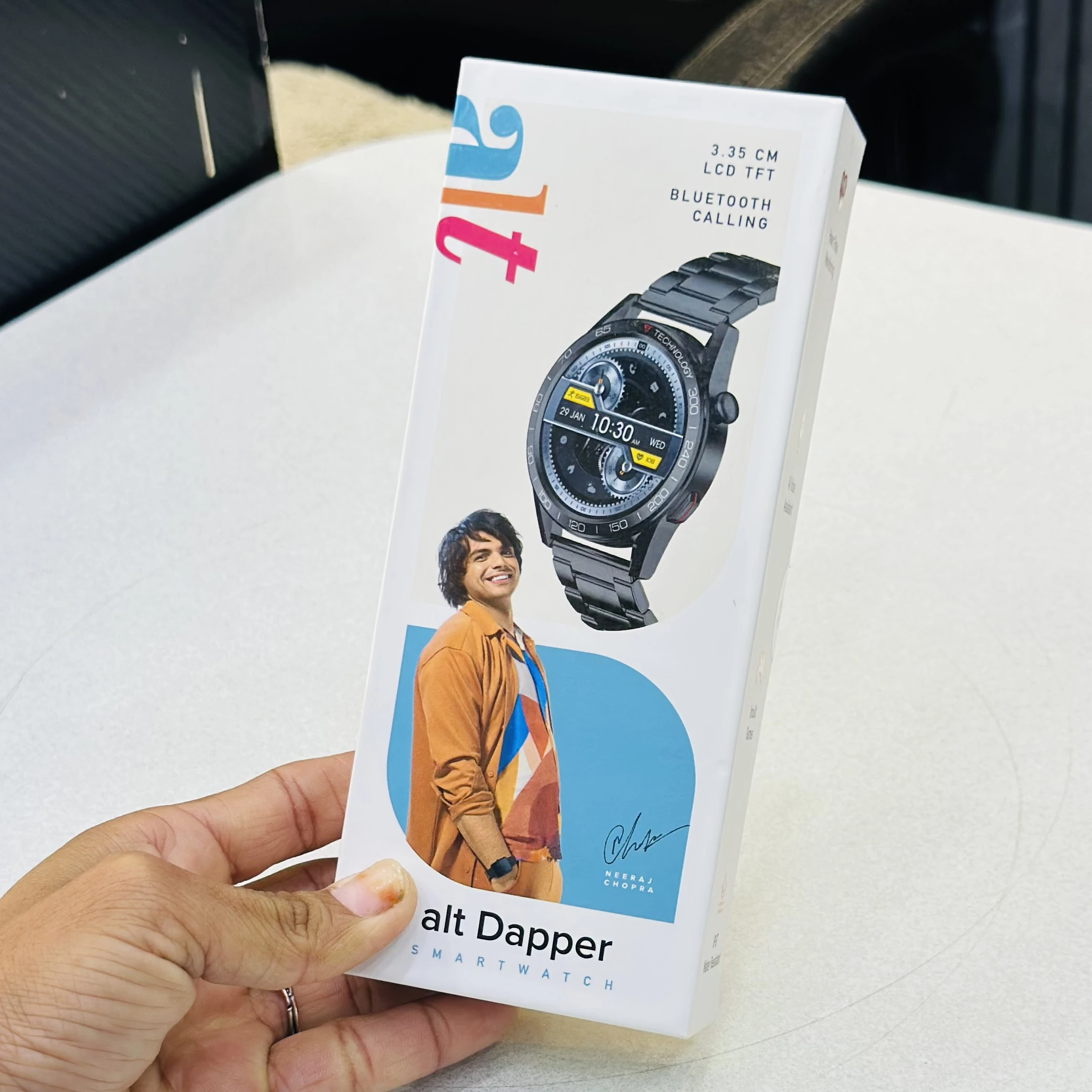 An. Alt Dapper smartwatch box, featuring Olympic gold medalist Neeraj Chopra. Key details visible on the packaging include: