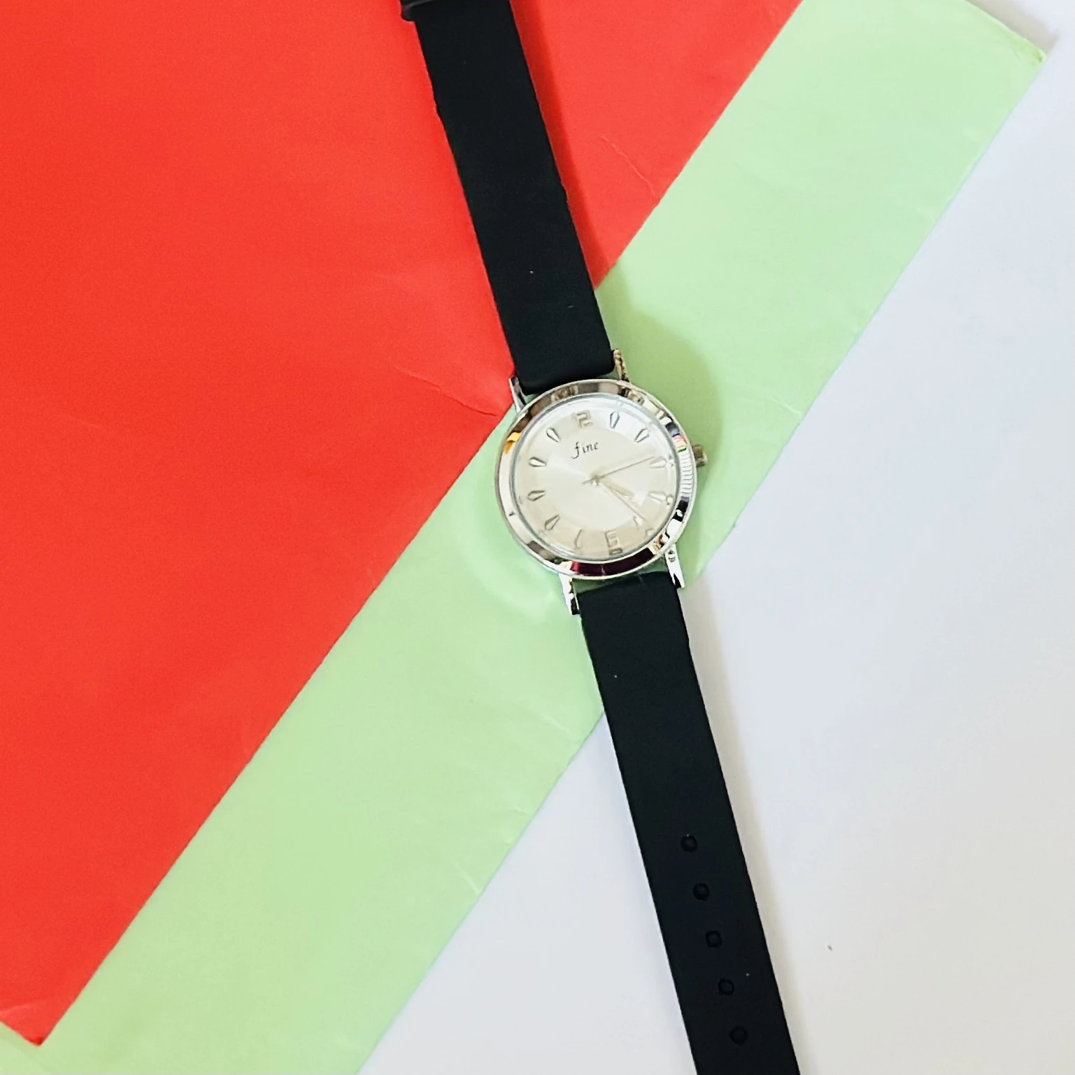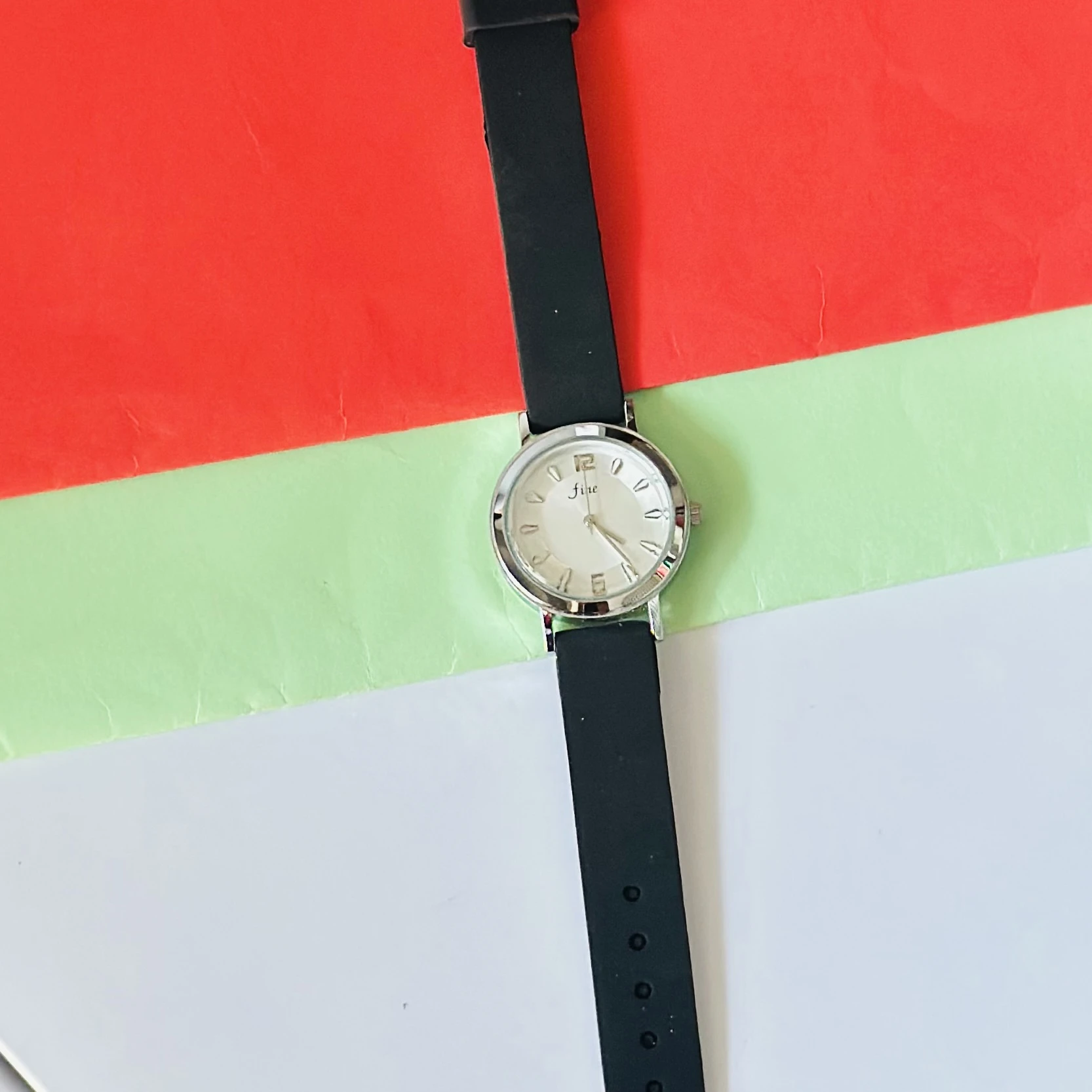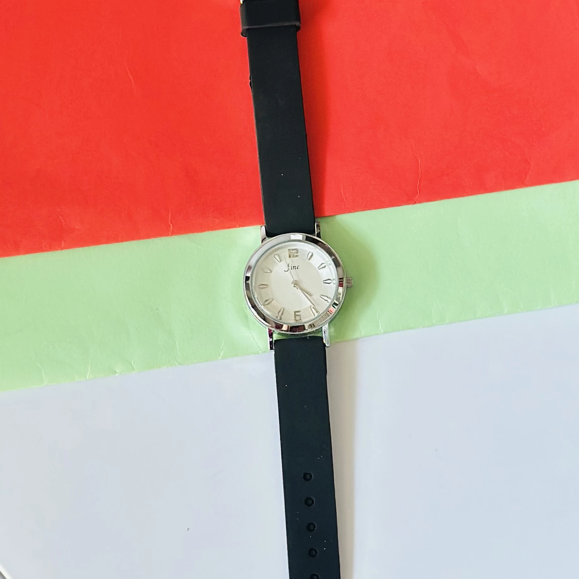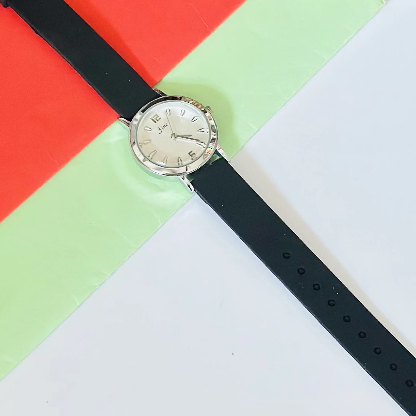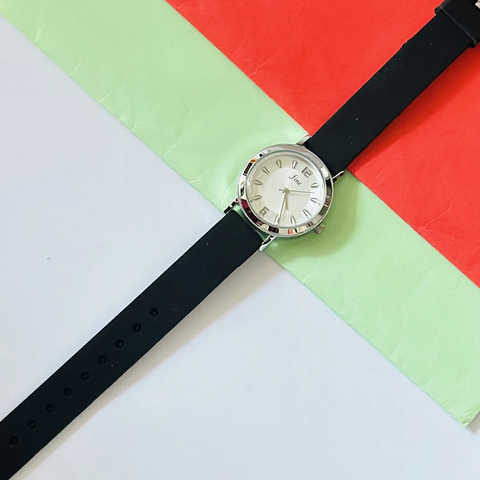 👉 Theme :- An analog women's wrist watch with a silver-tone case, white dial, and a black strap.