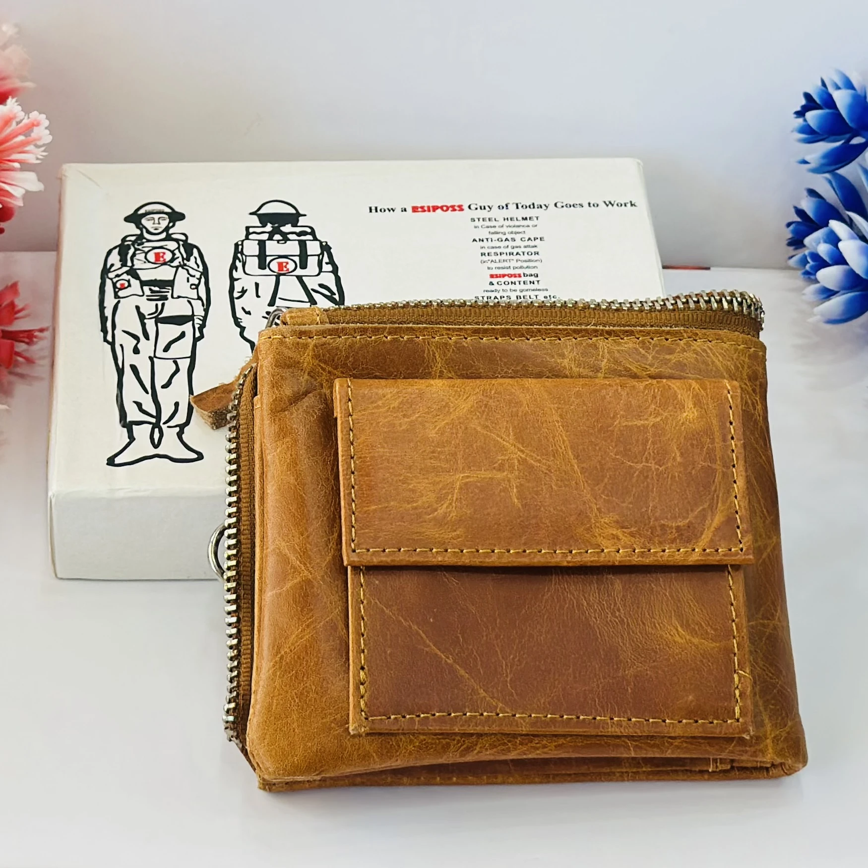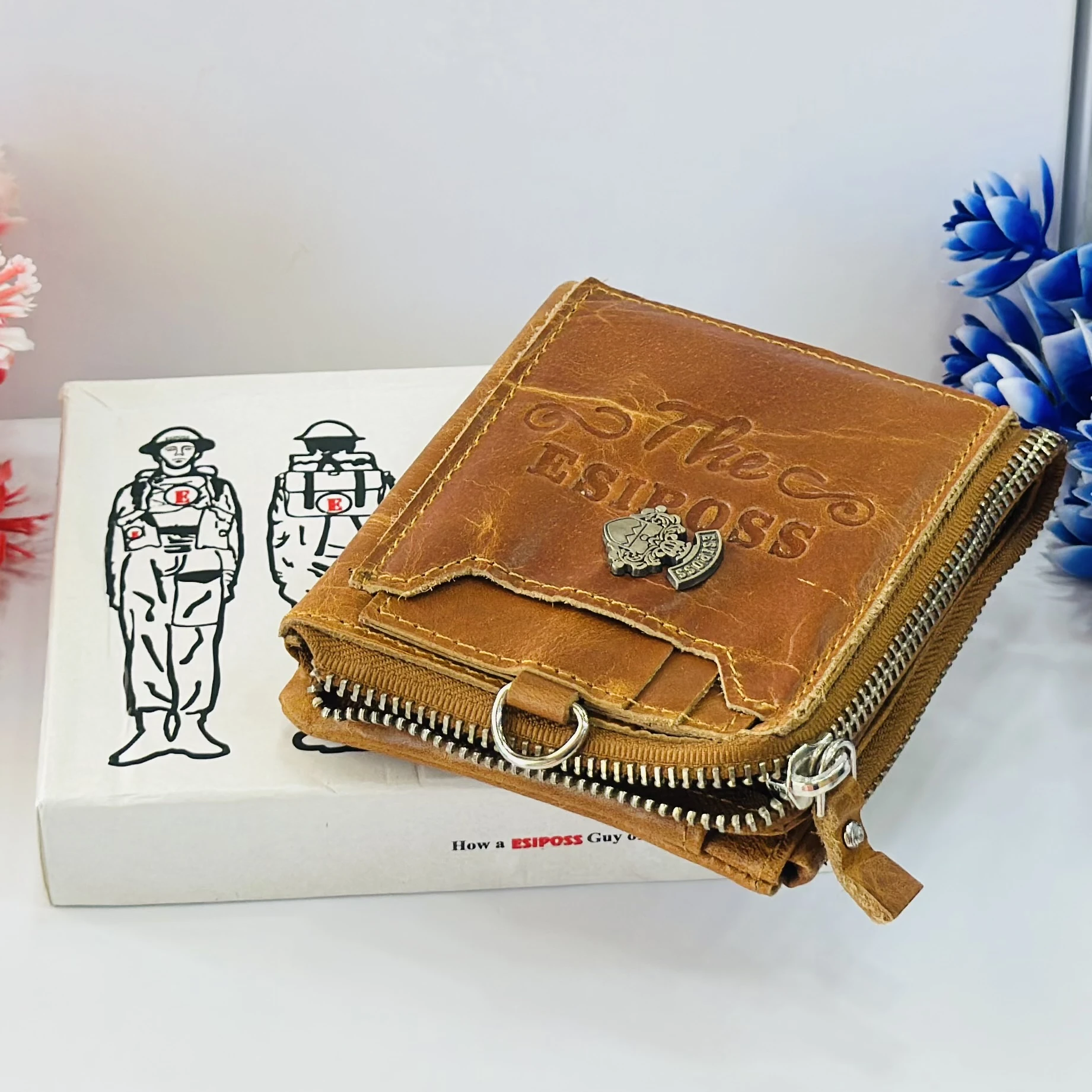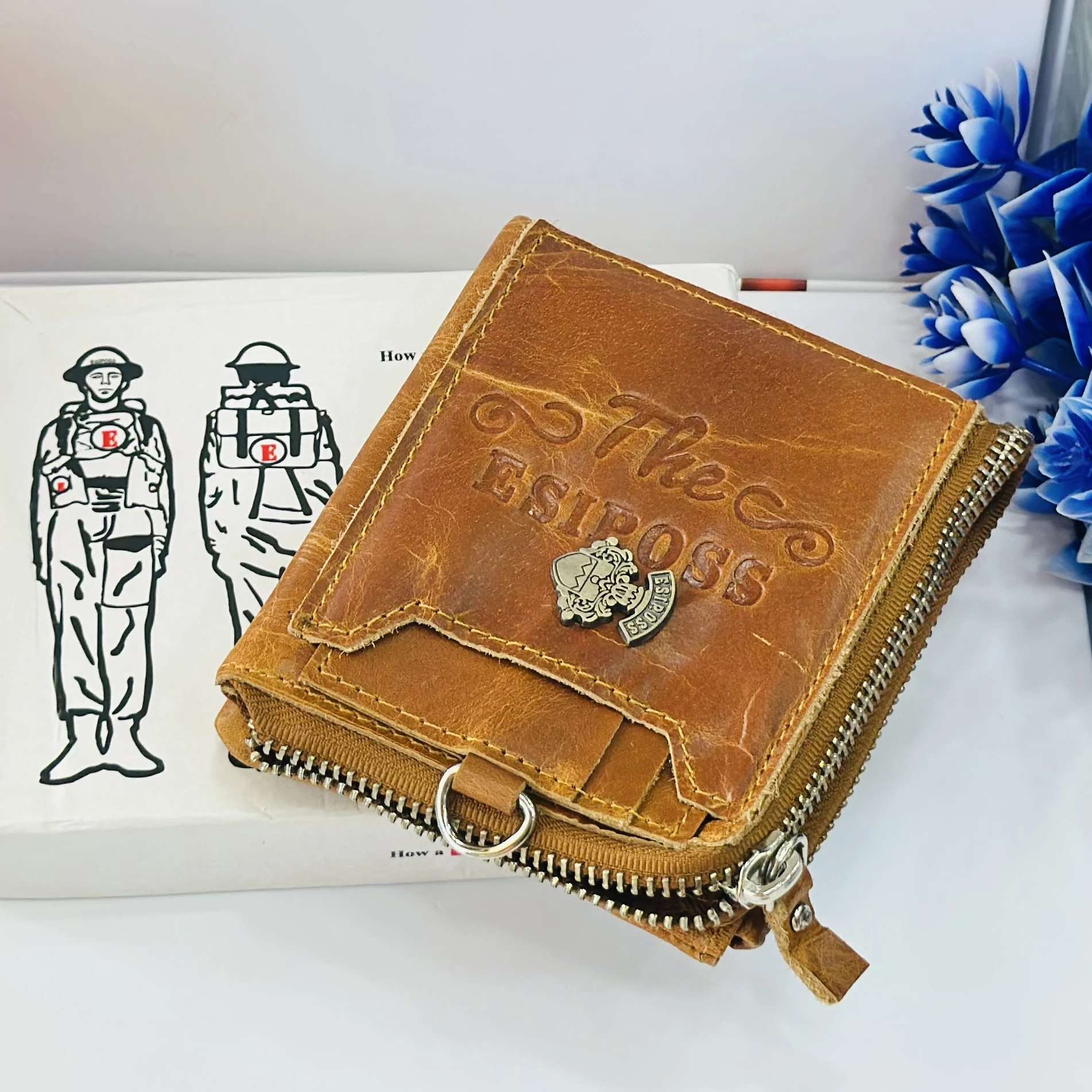 👉 Theme :- an Esiposs genuine leather men's wallet in a light brown or tan color.