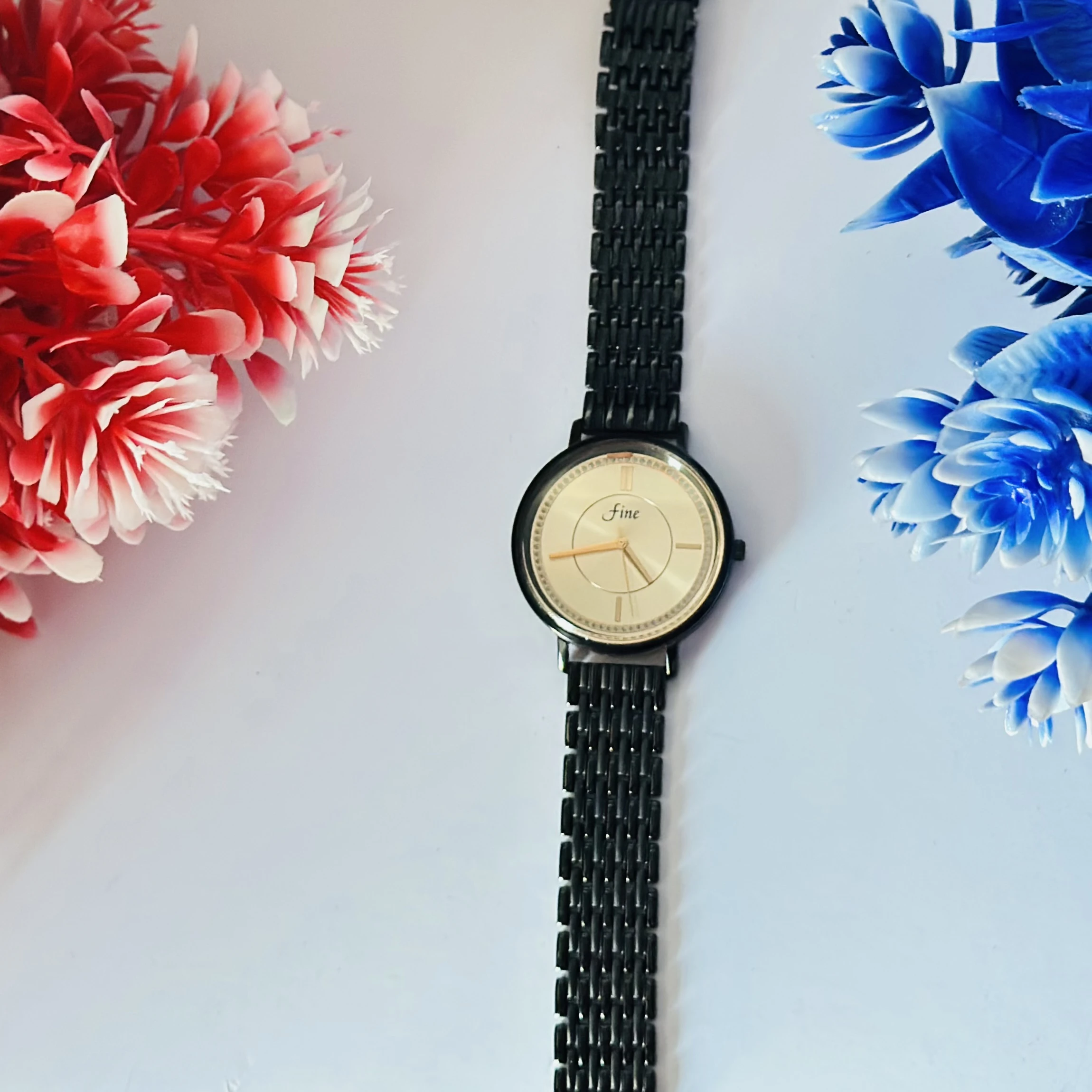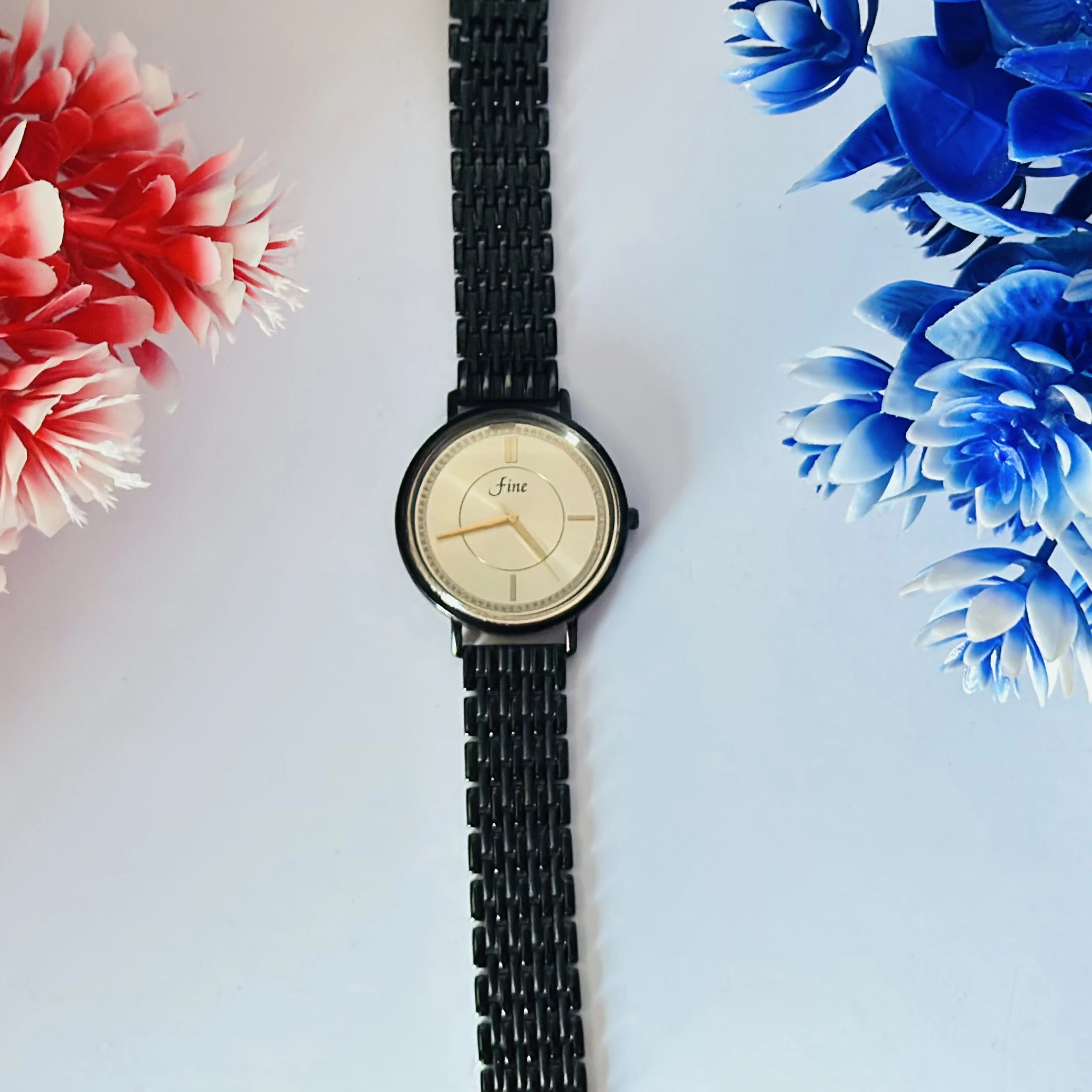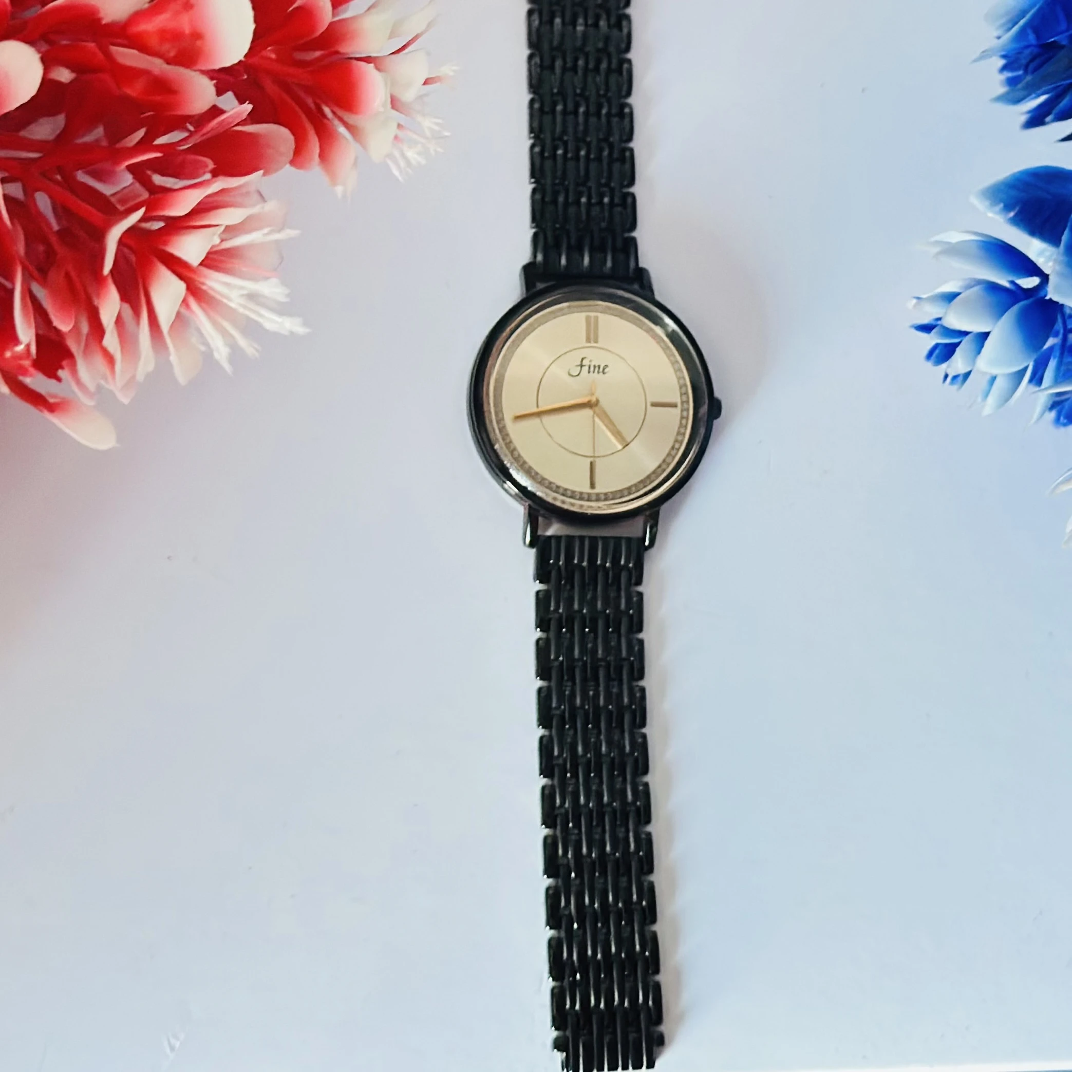 👉 Theme :- Analogue women's watch with a black stainless steel mesh strap and a beige dial