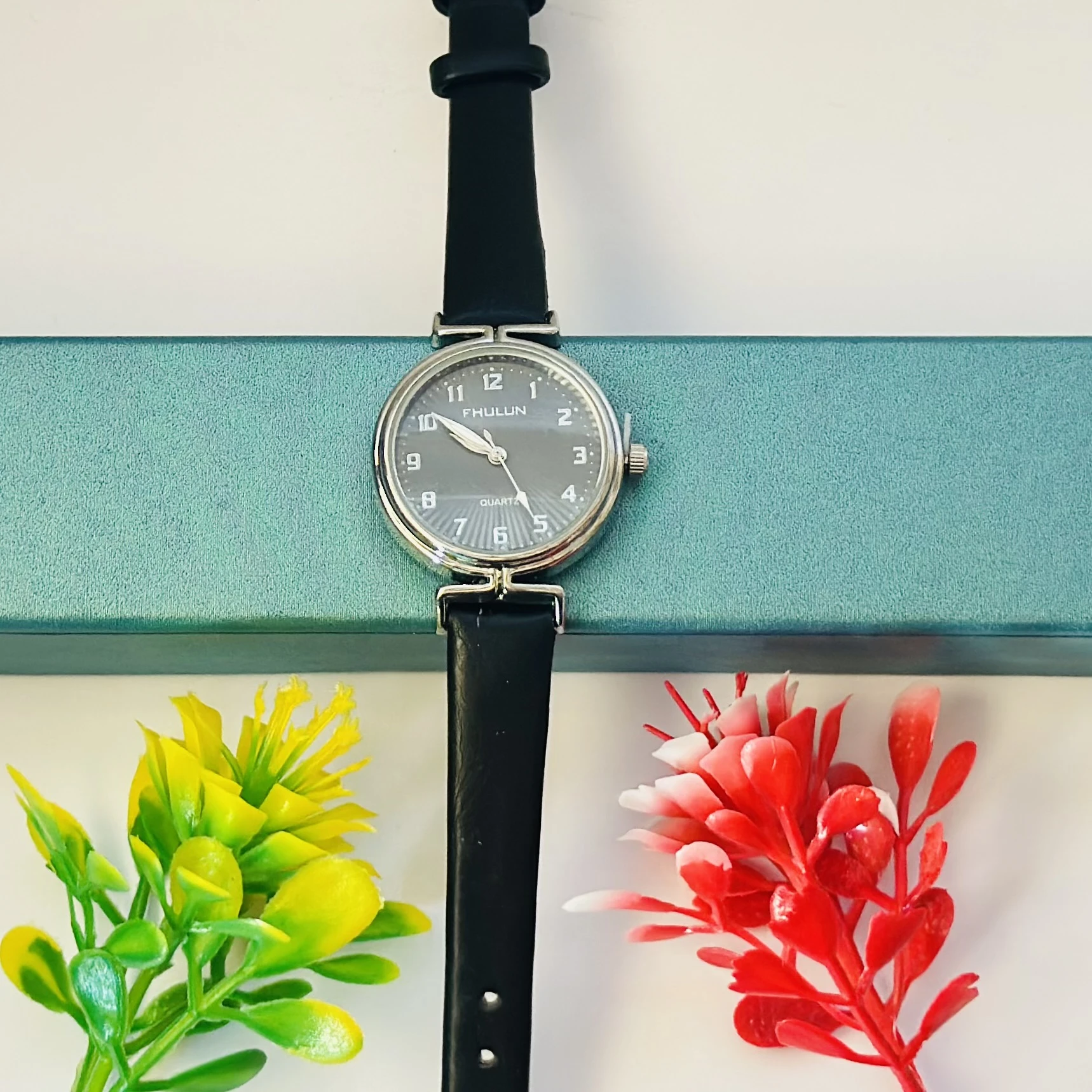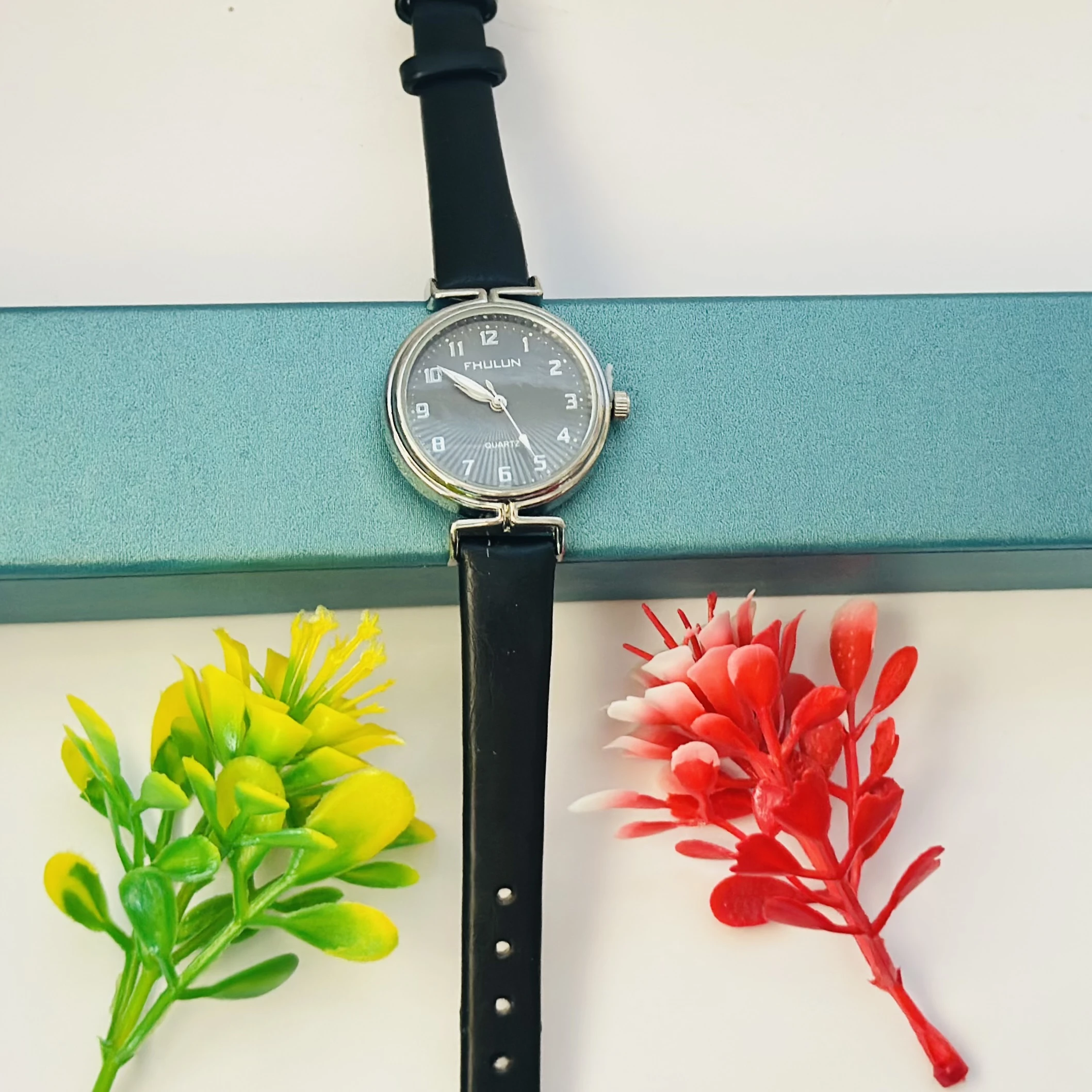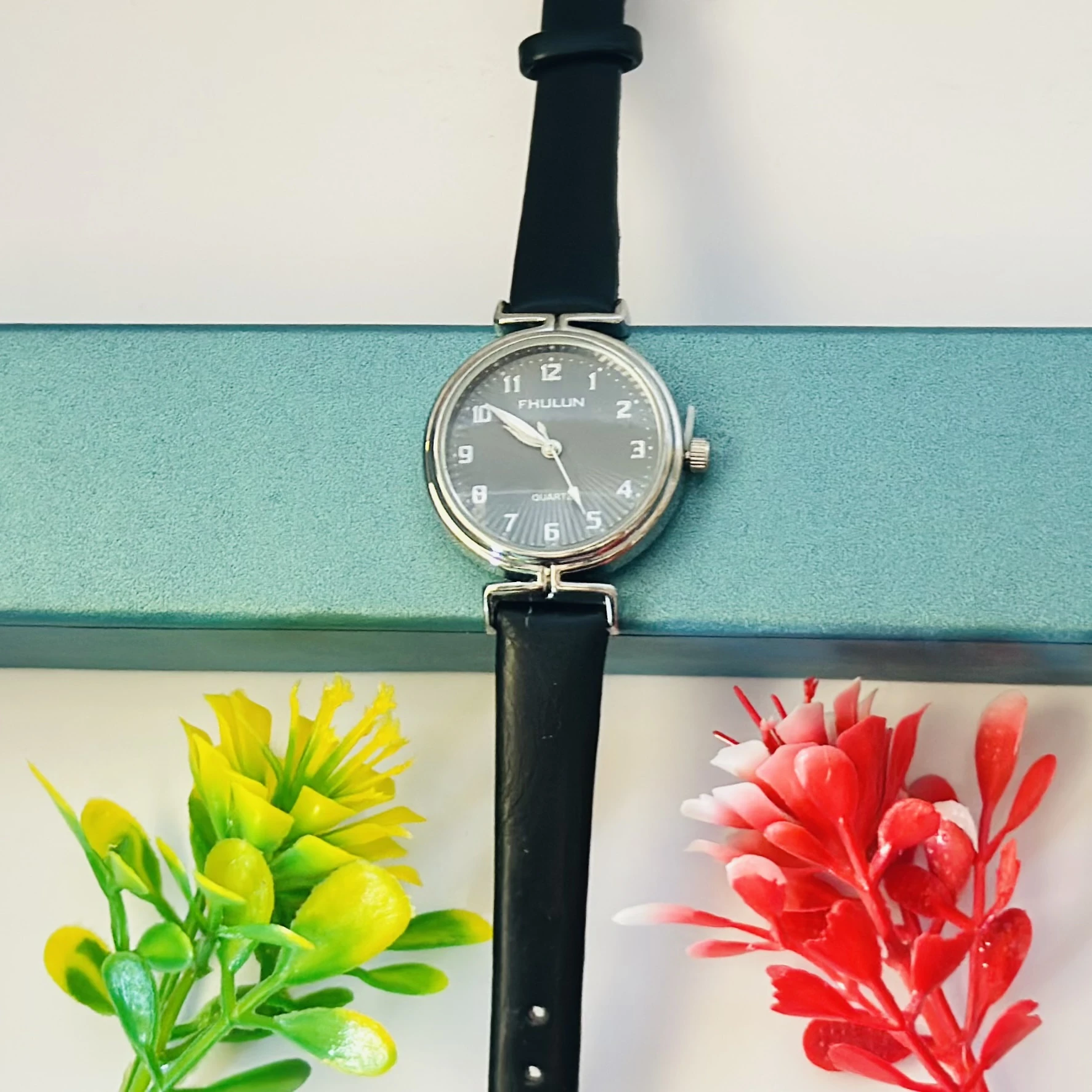 👉 Theme :- quartz analog watch with a black dial and black leather-look strap