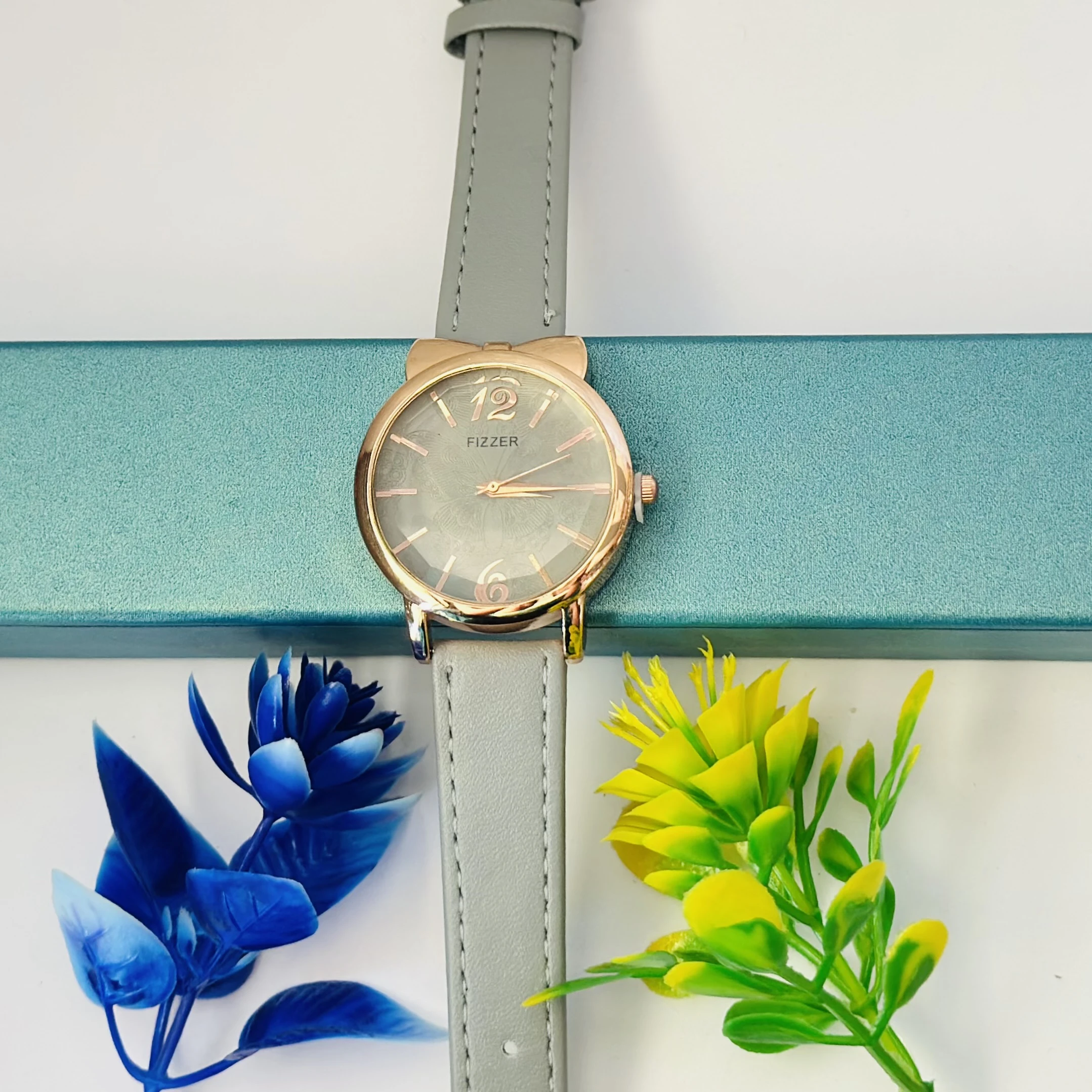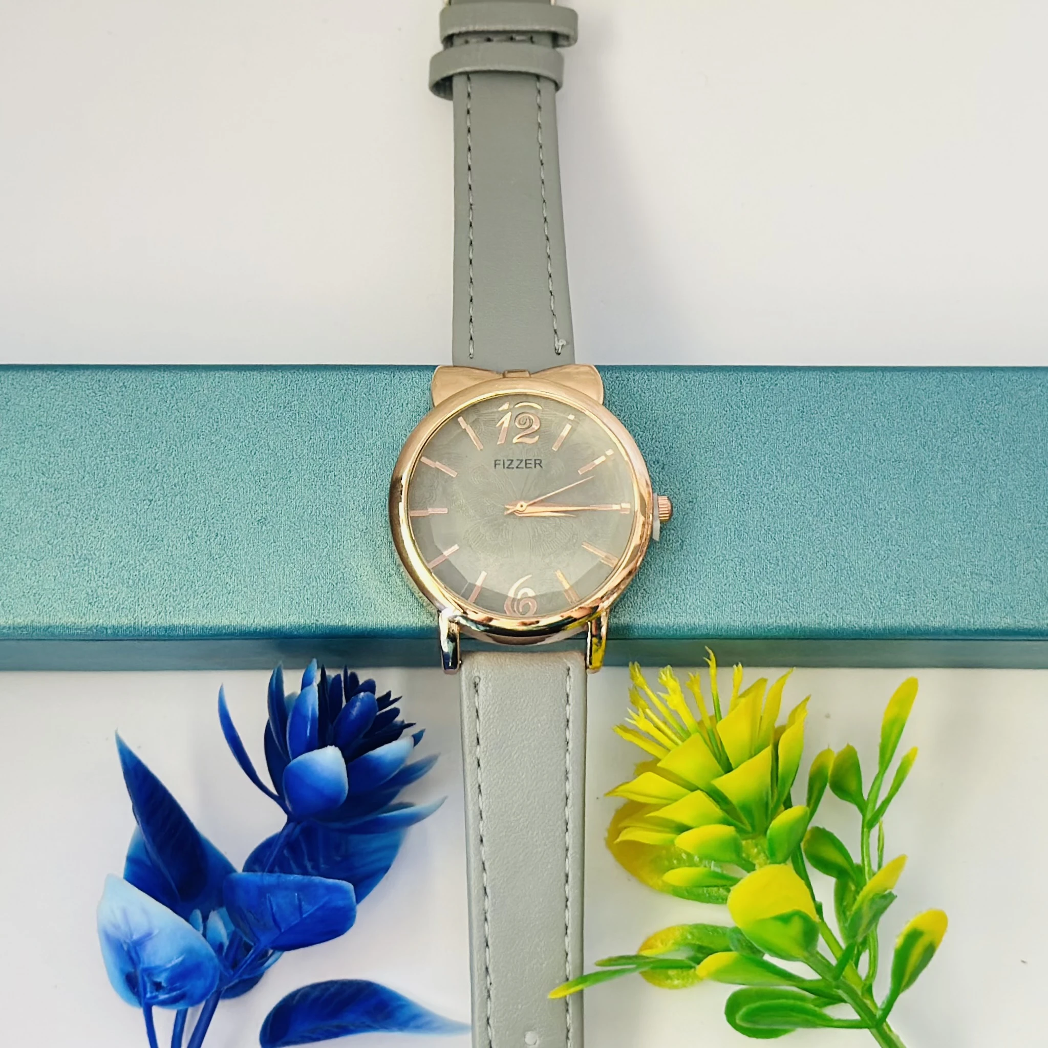 👉 Theme :- Analog watch with a rose gold-tone case, mother-of-pearl dial, and a grey leather strap.