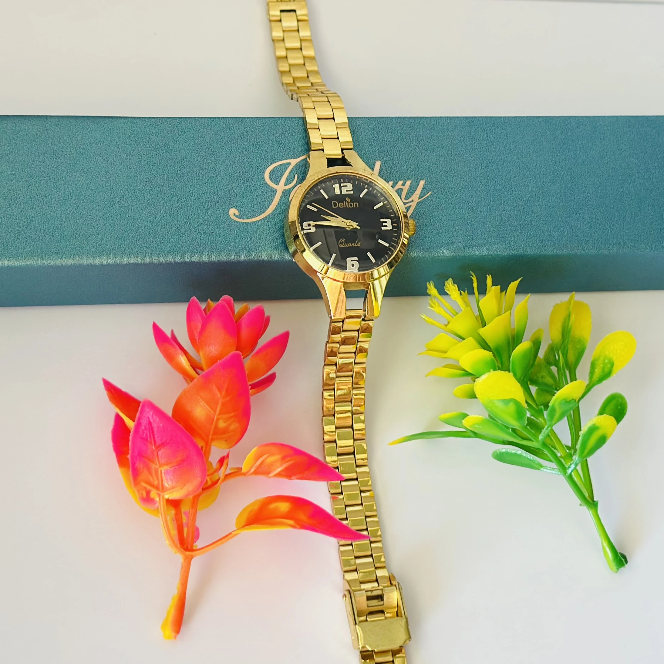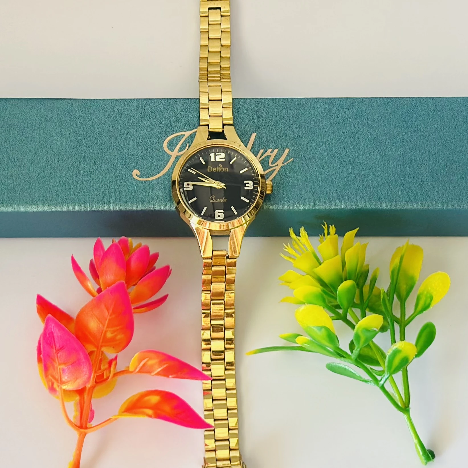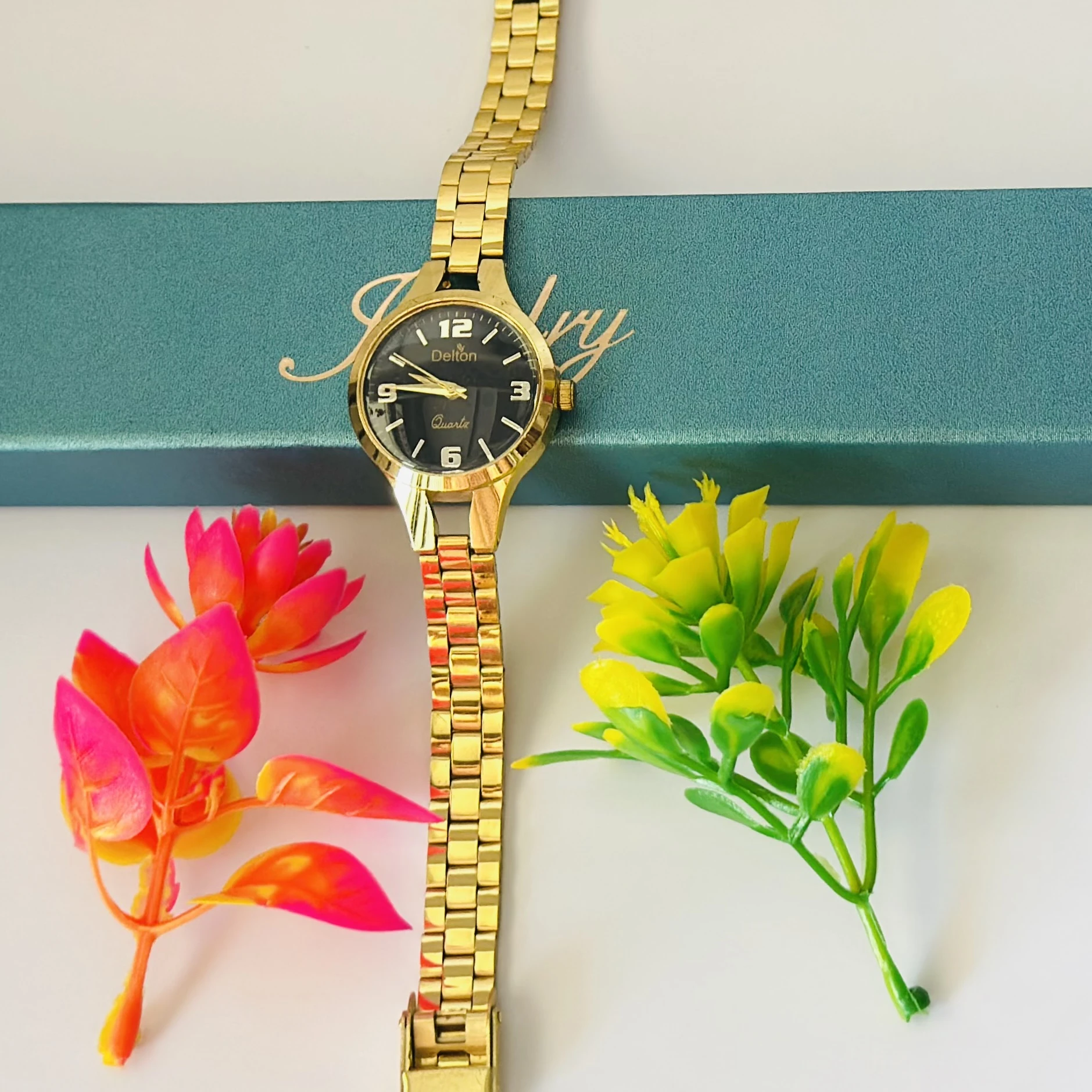 👉 Theme :- Analog quartz watch with a black dial and a gold-tone stainless steel strap.