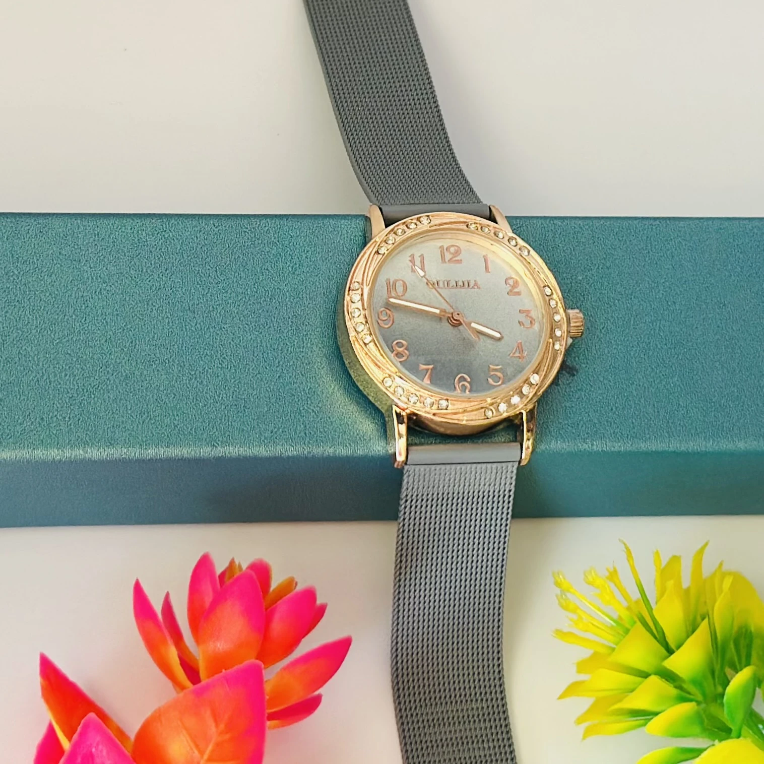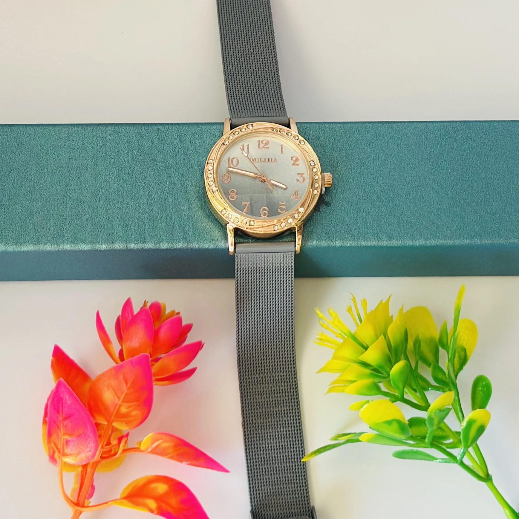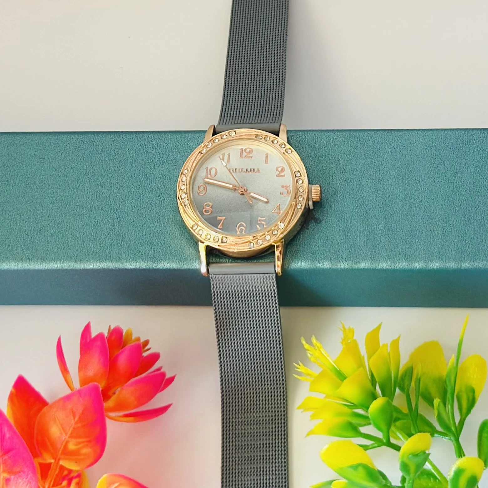 👉 Theme :- Women’s analog watch with a rose gold-tone case, crystal-embellished bezel, grey dial, and grey stainless steel mesh strap.