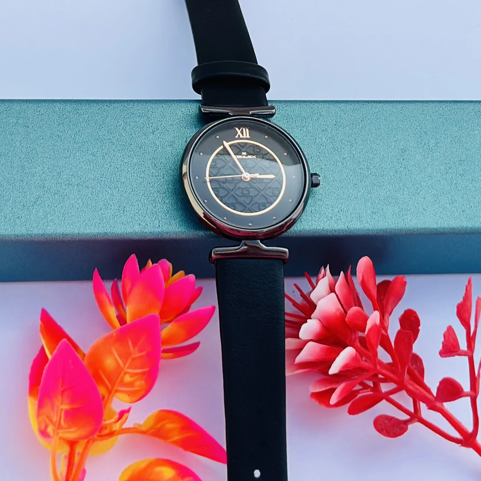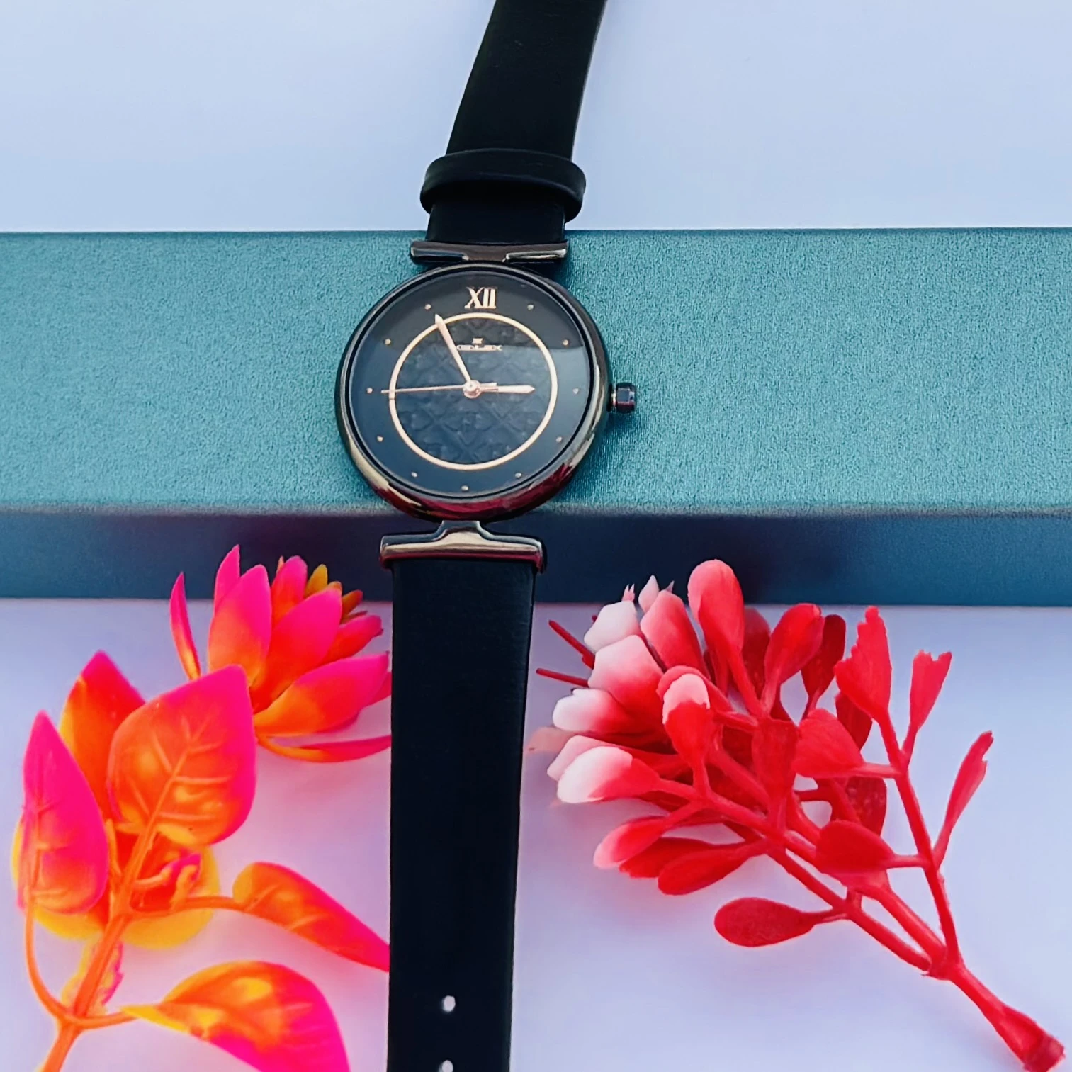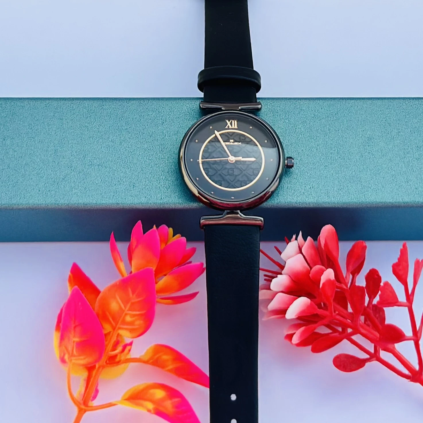 👉 Theme :- Analog watch for women with a black leather strap and gunmetal dial.