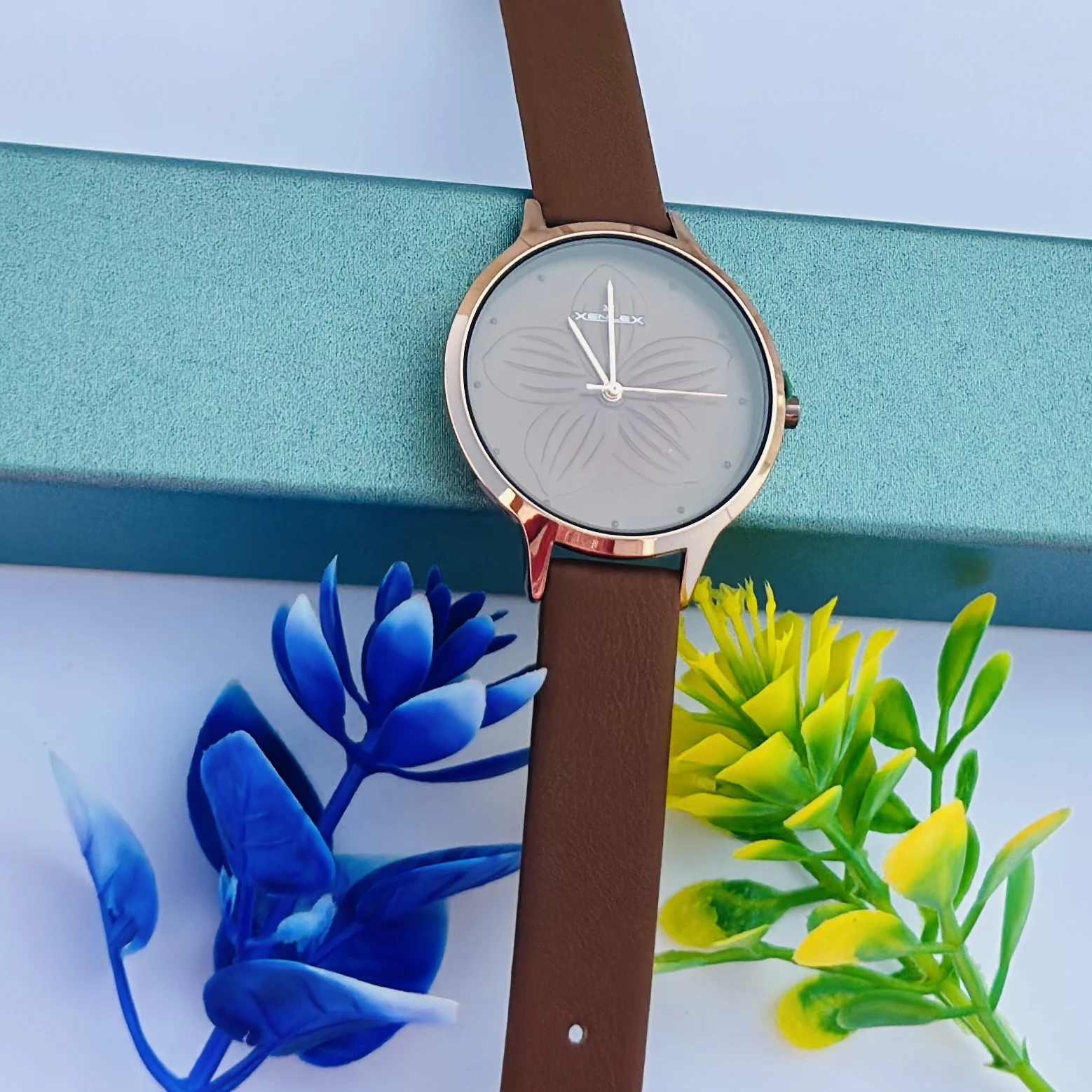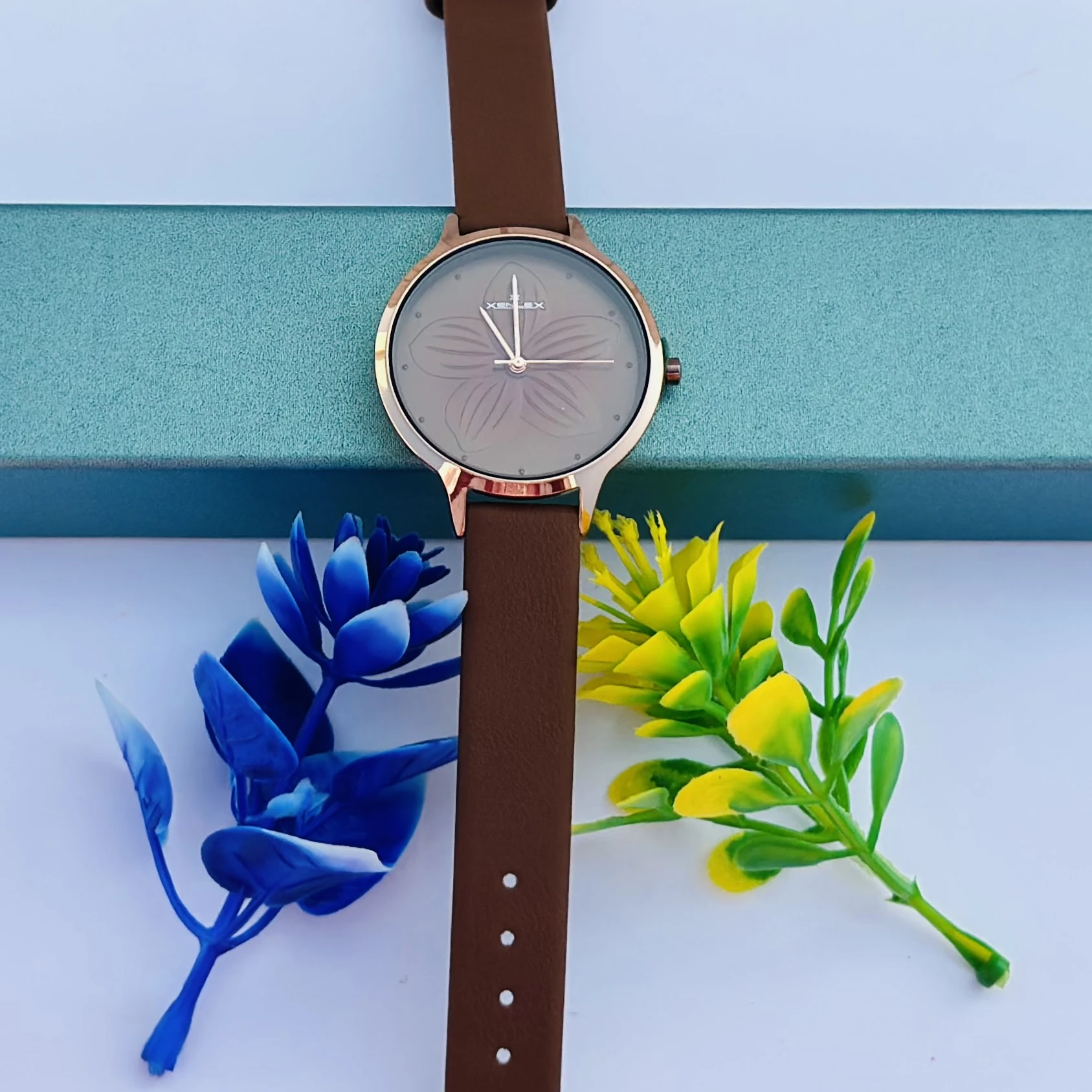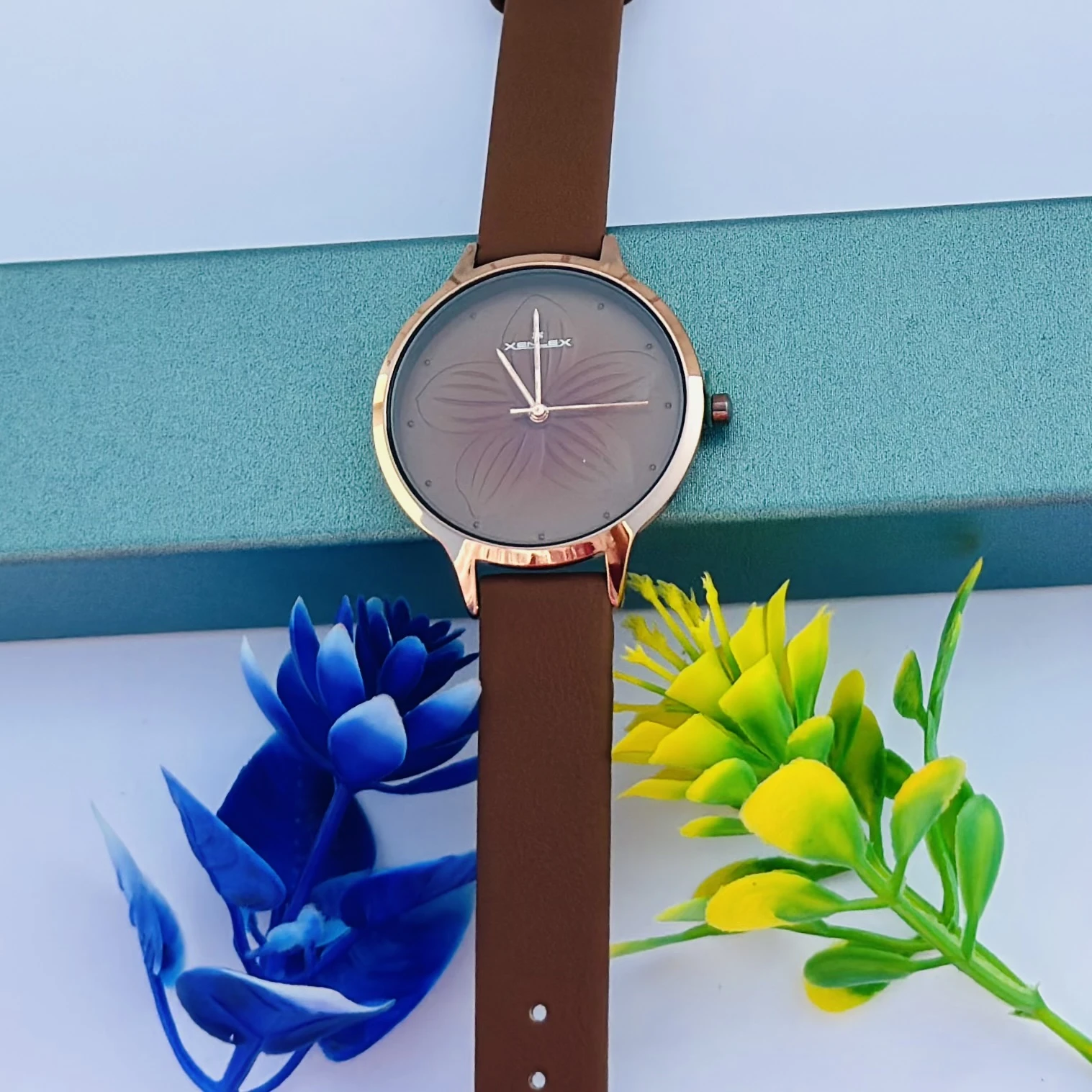 👉 Theme :- Analog watch for women with a brown leather strap and pink dial.
