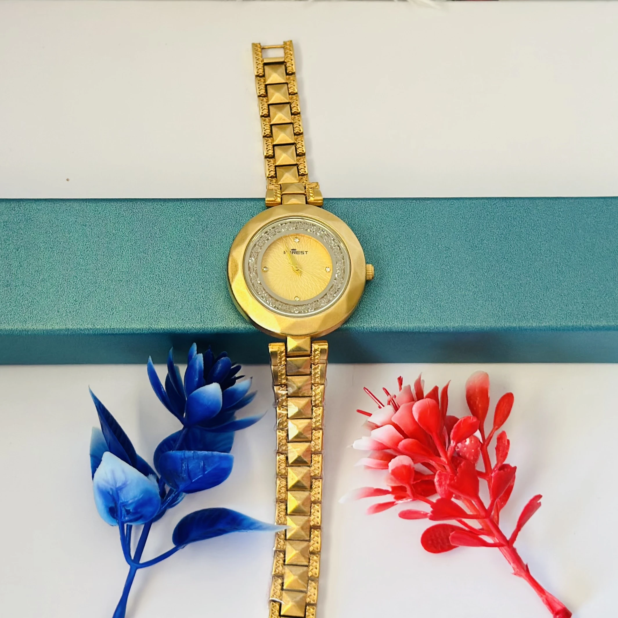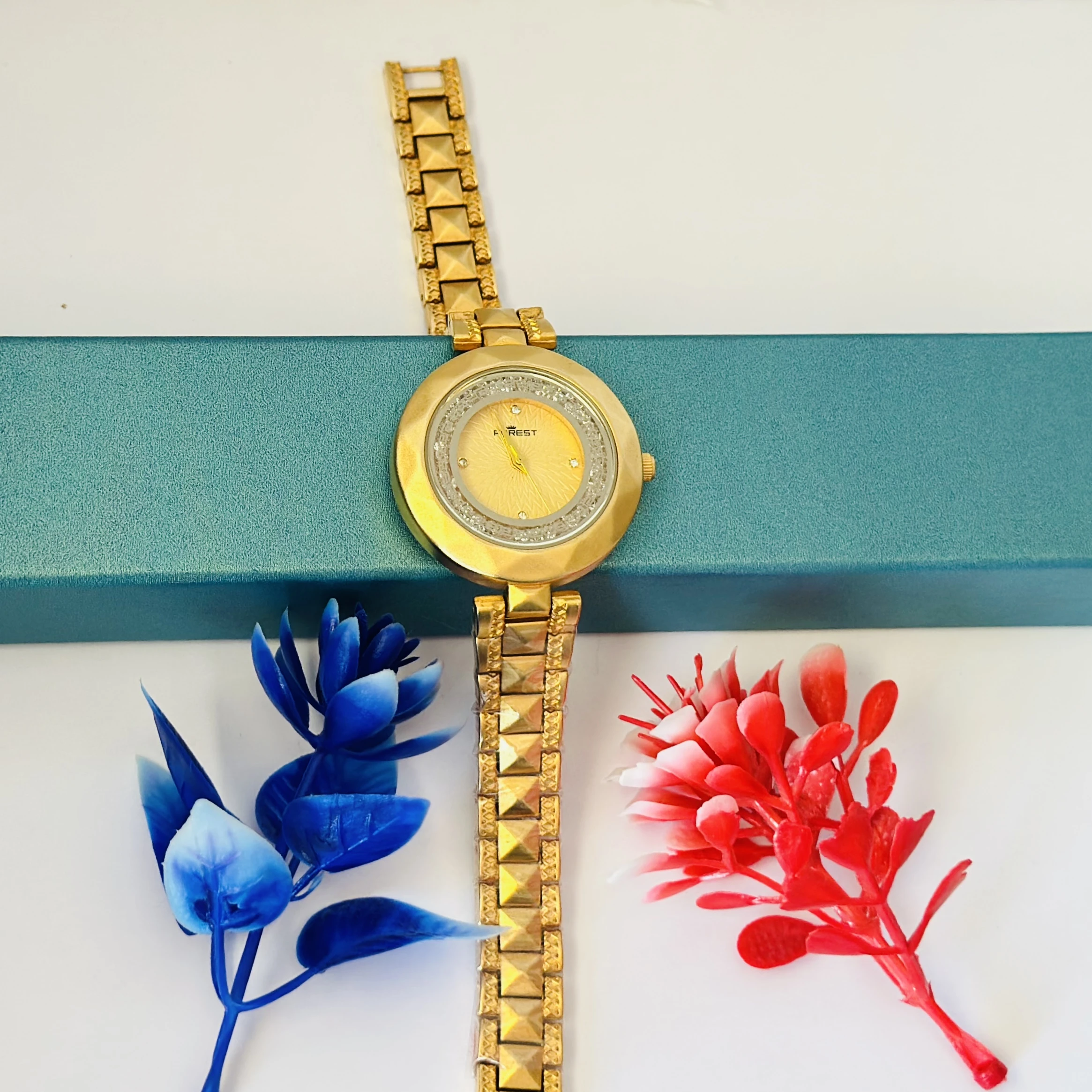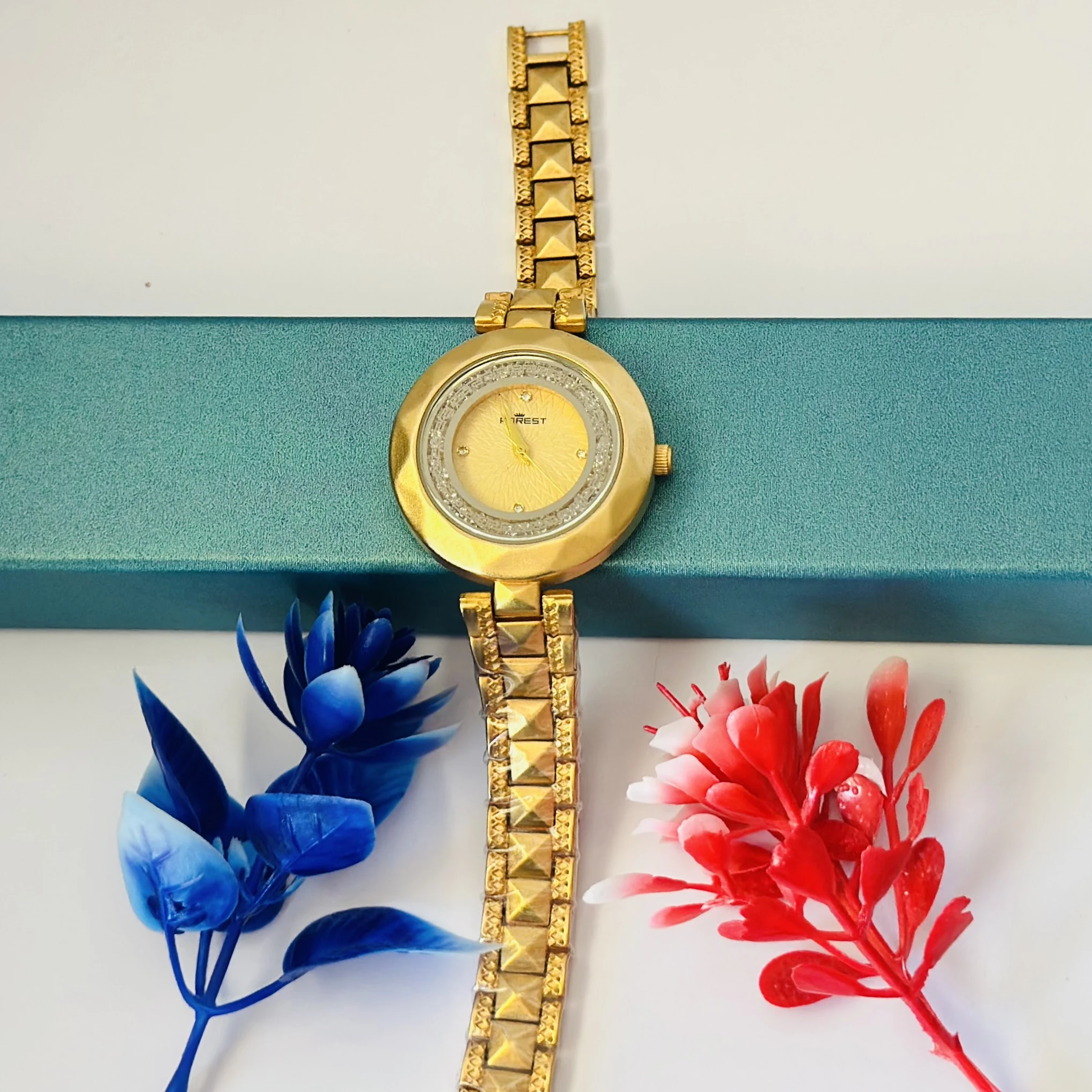 👉 Theme :- analog watch for women with a golden dial and band.