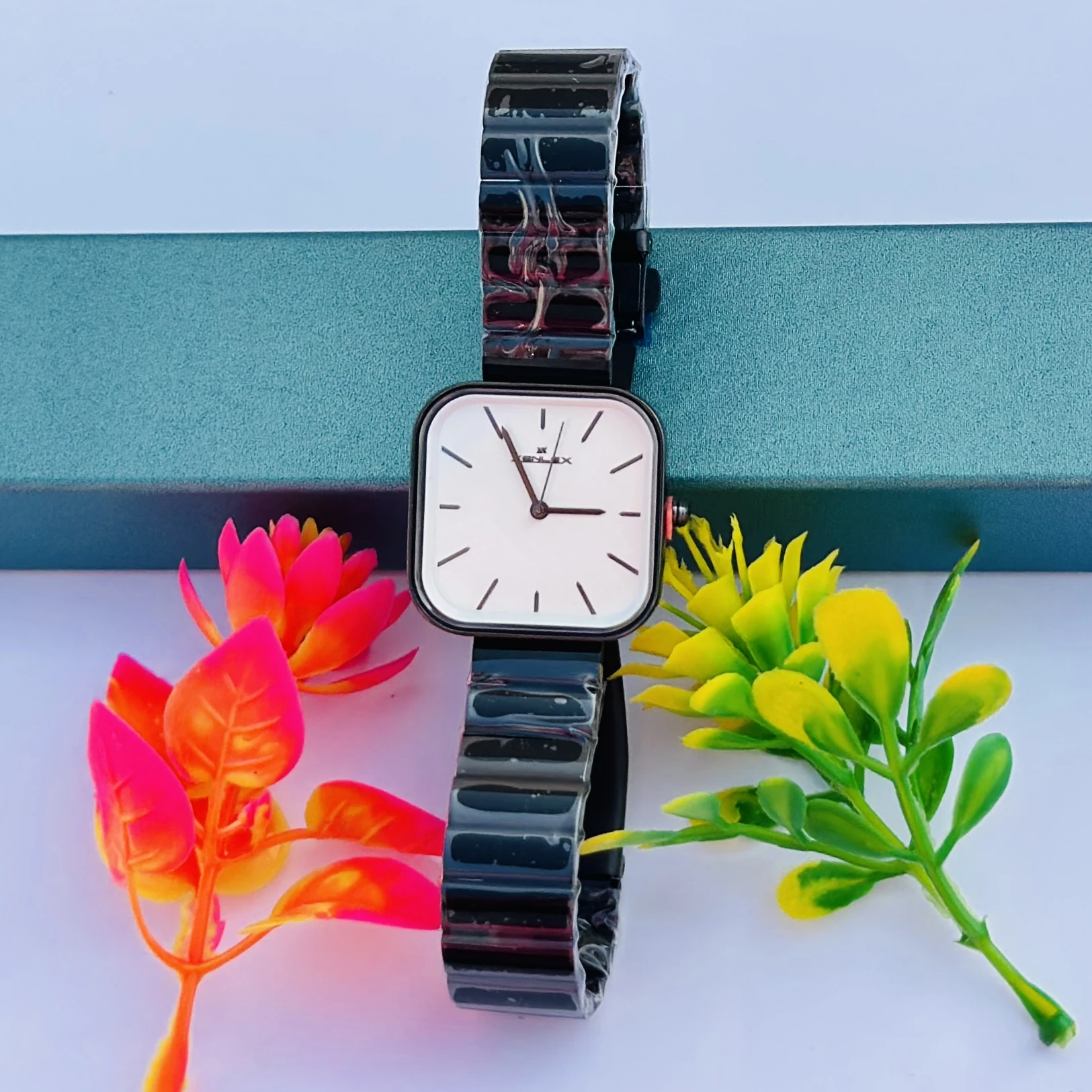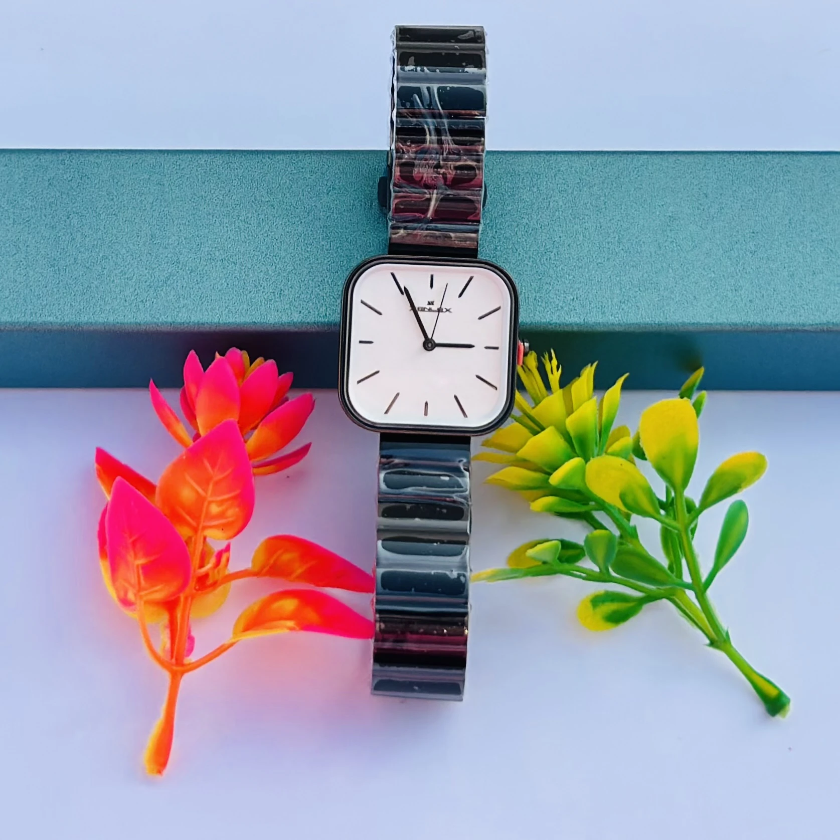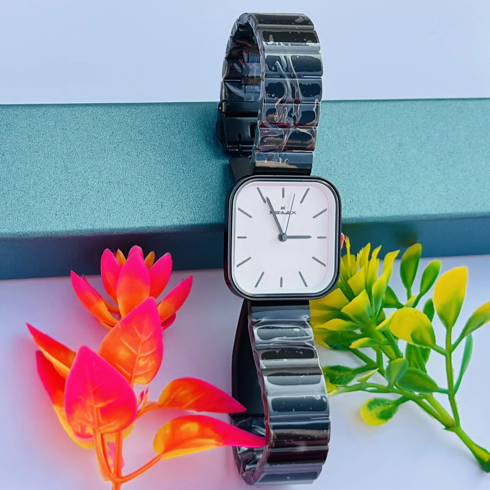 👉 Theme :- analog watch with a black stainless steel bracelet.