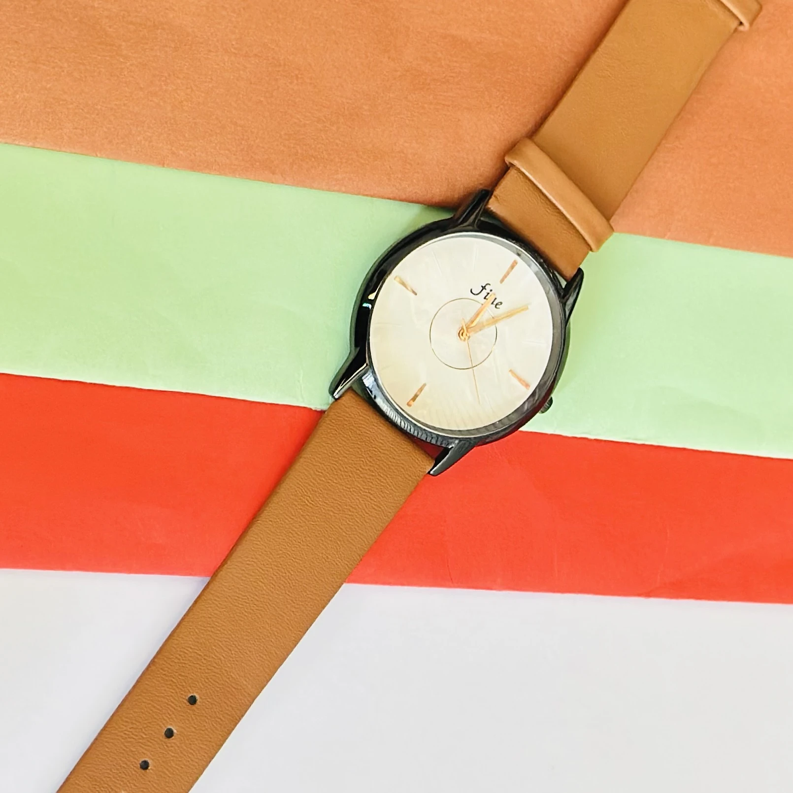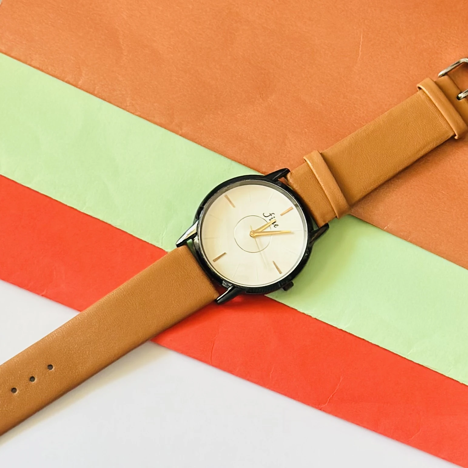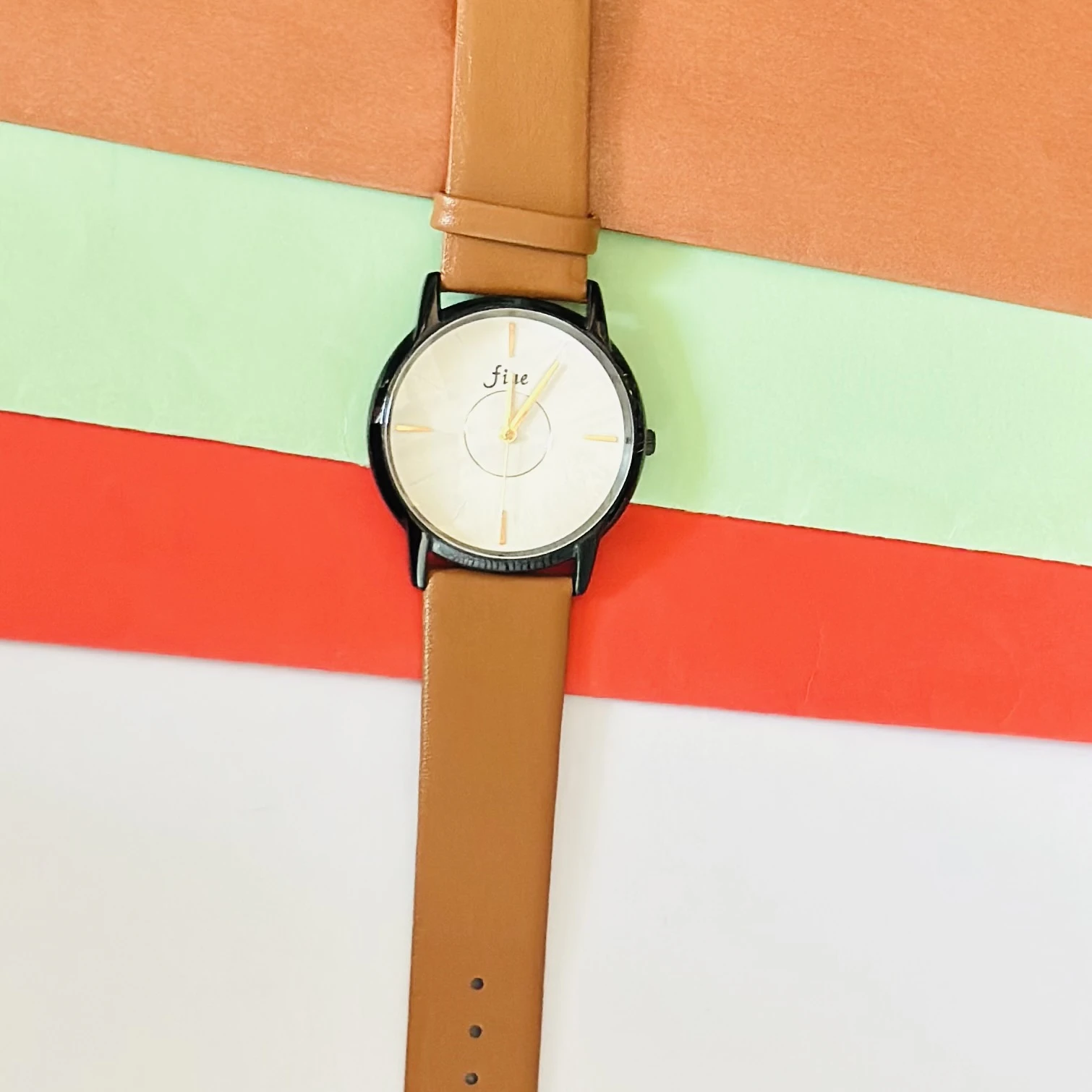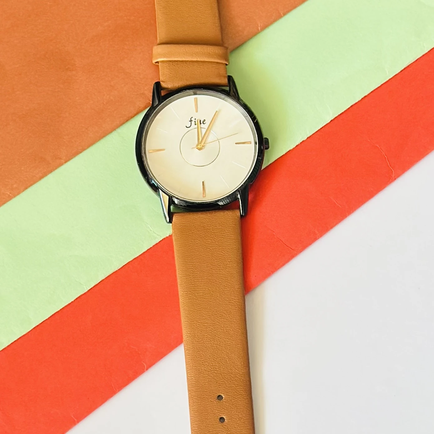 👉 Theme :- Analog wrist watch with a brown leather strap.