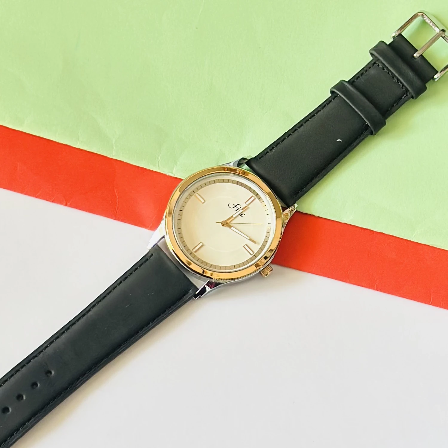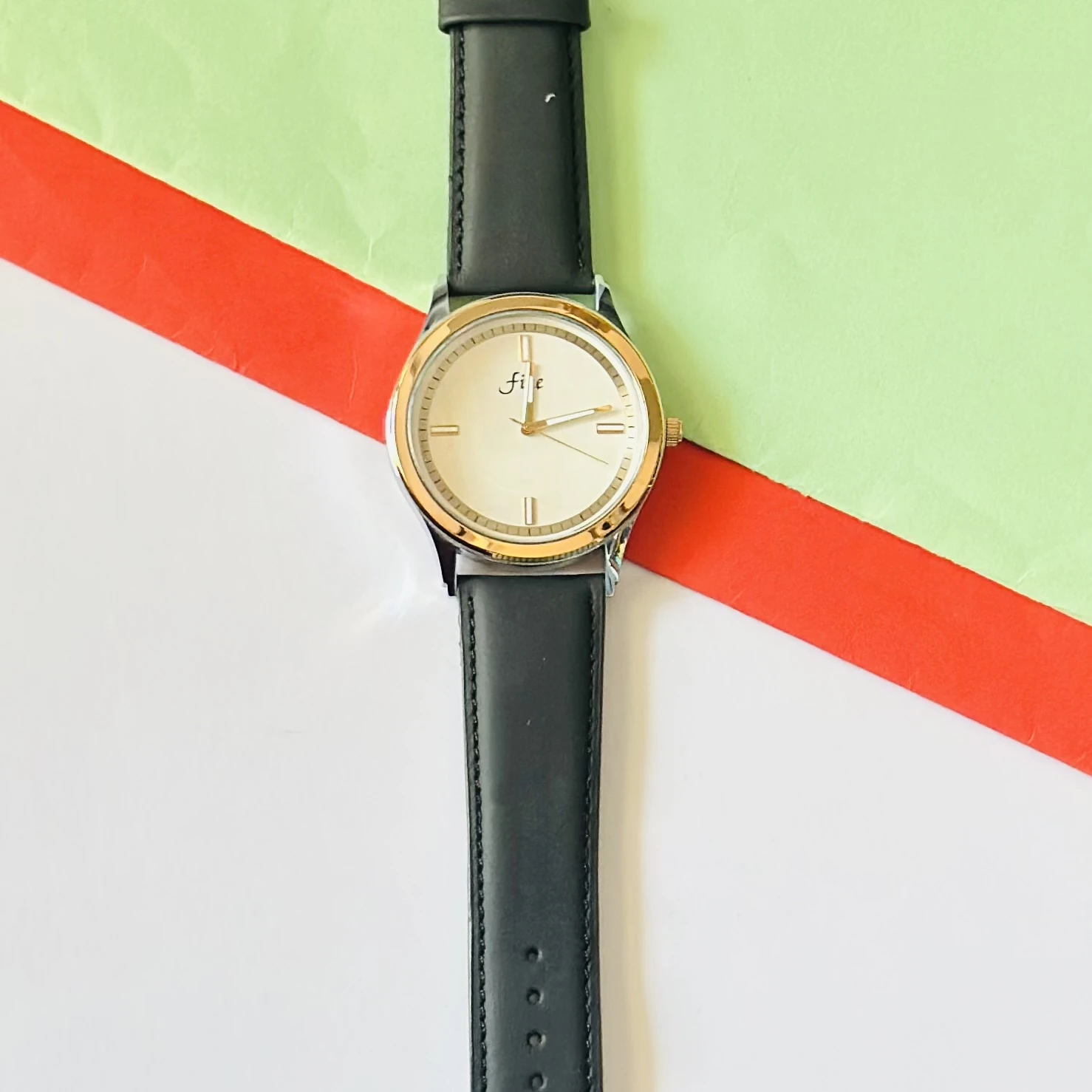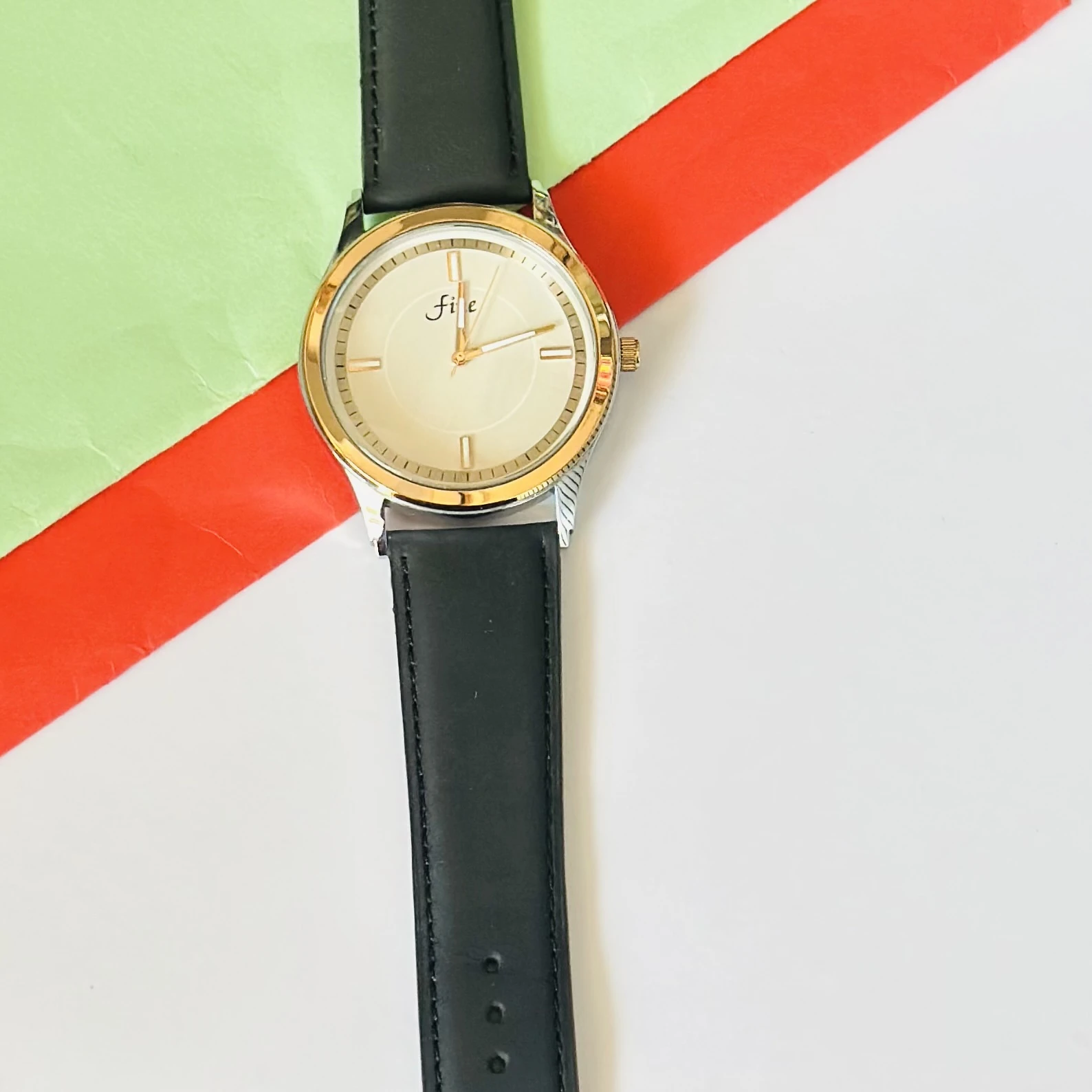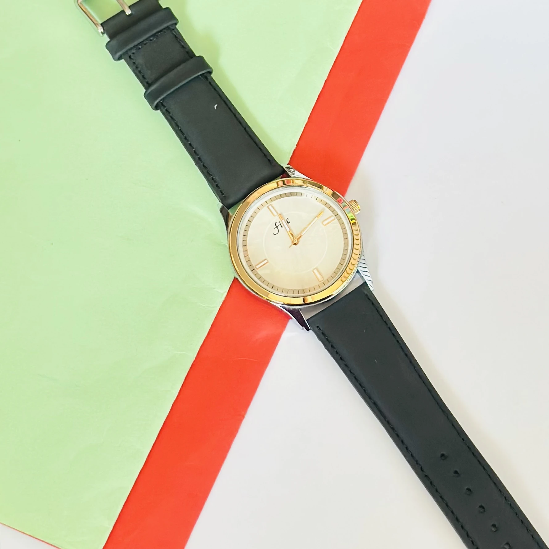 👉 Theme :- Fine analog watch with a Black leather strap.