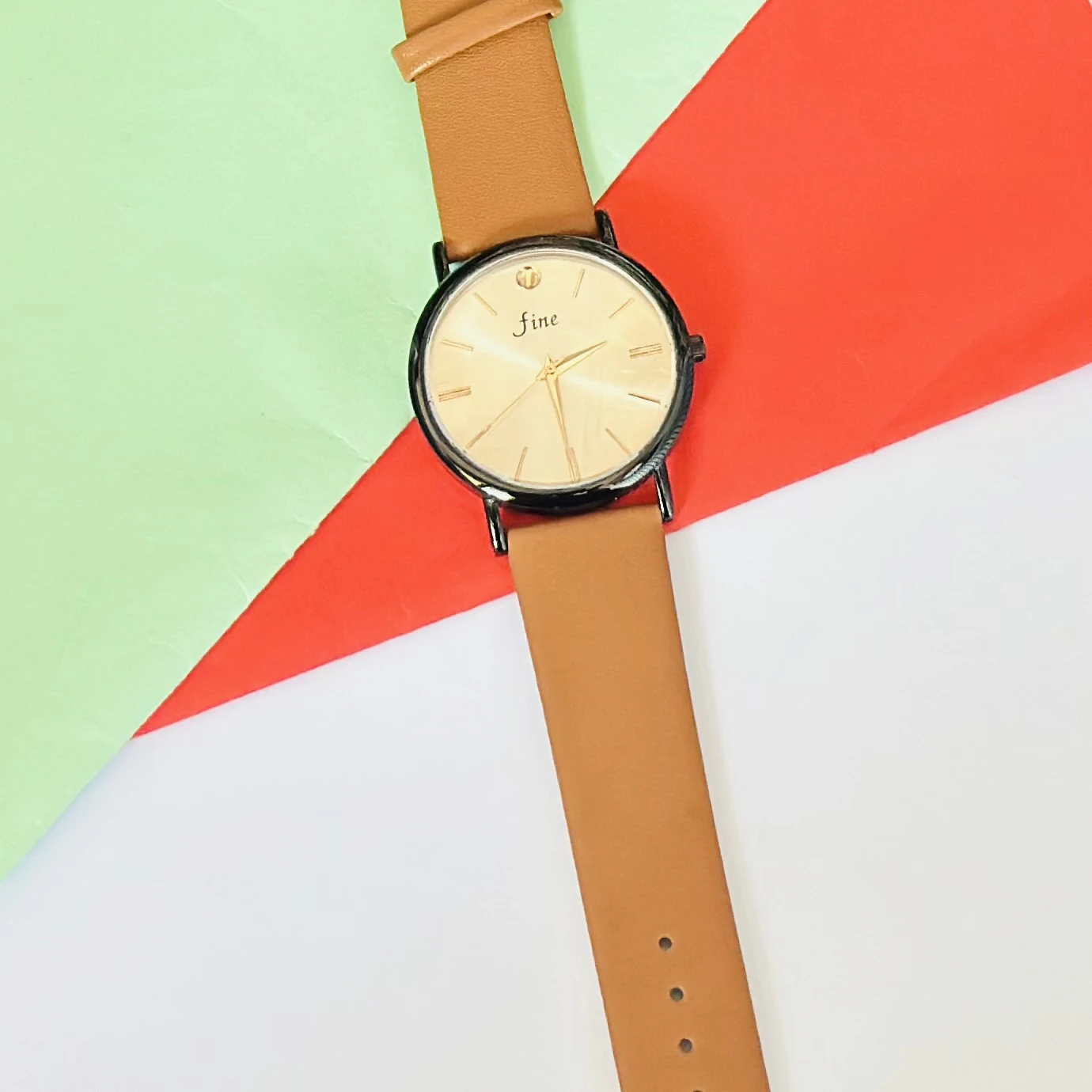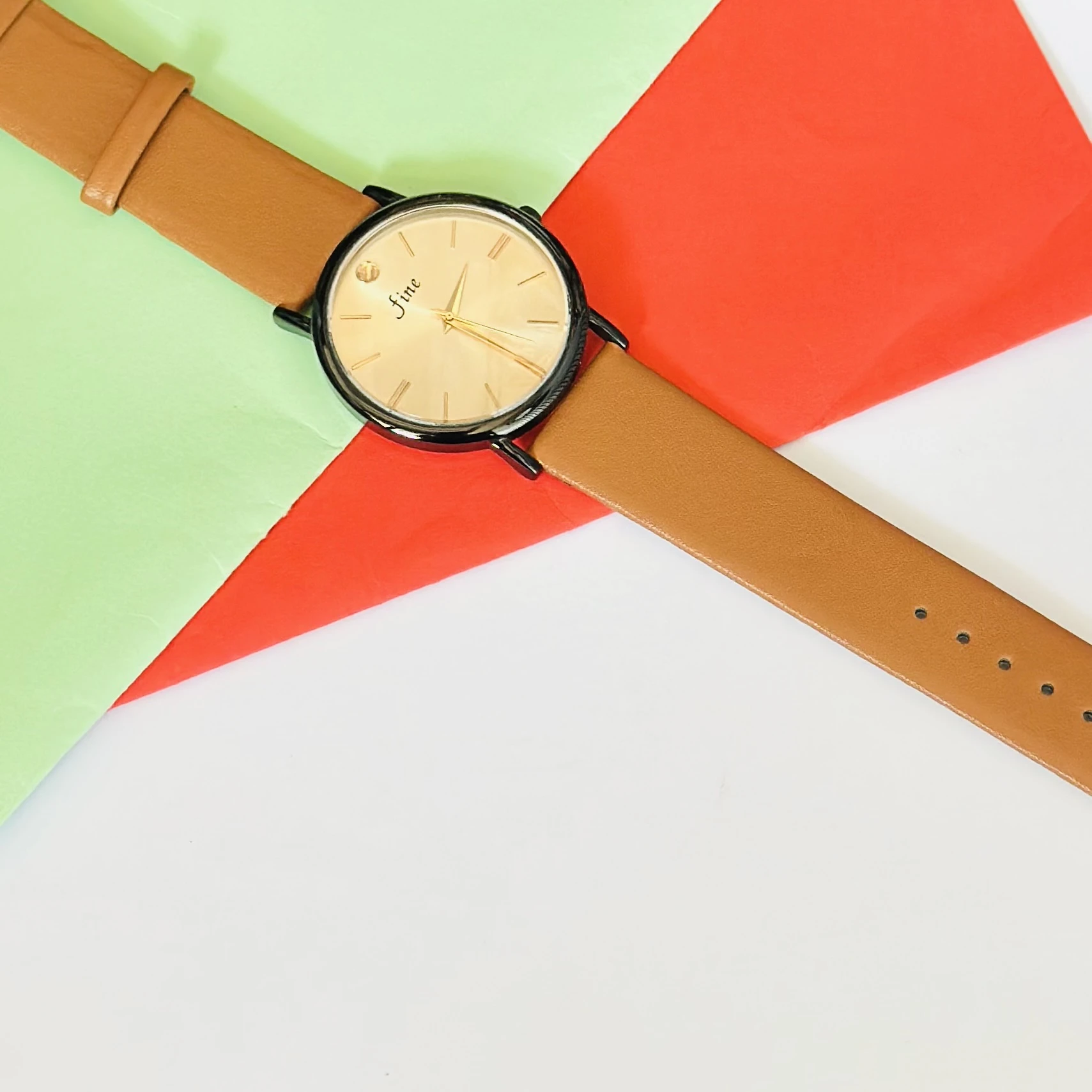 👉 Theme :- Analog wristwatch with a gold-tone case and a brown leather strap.