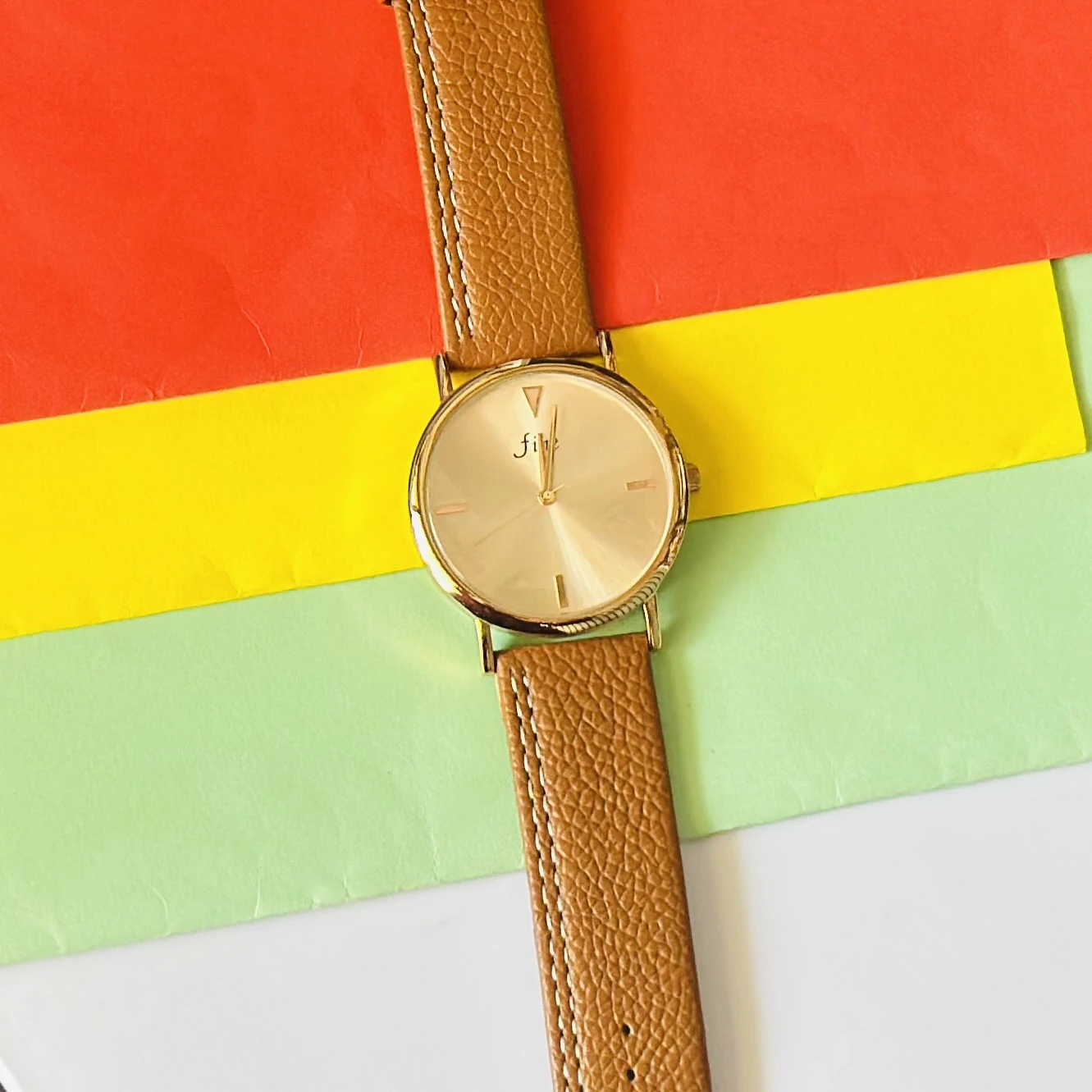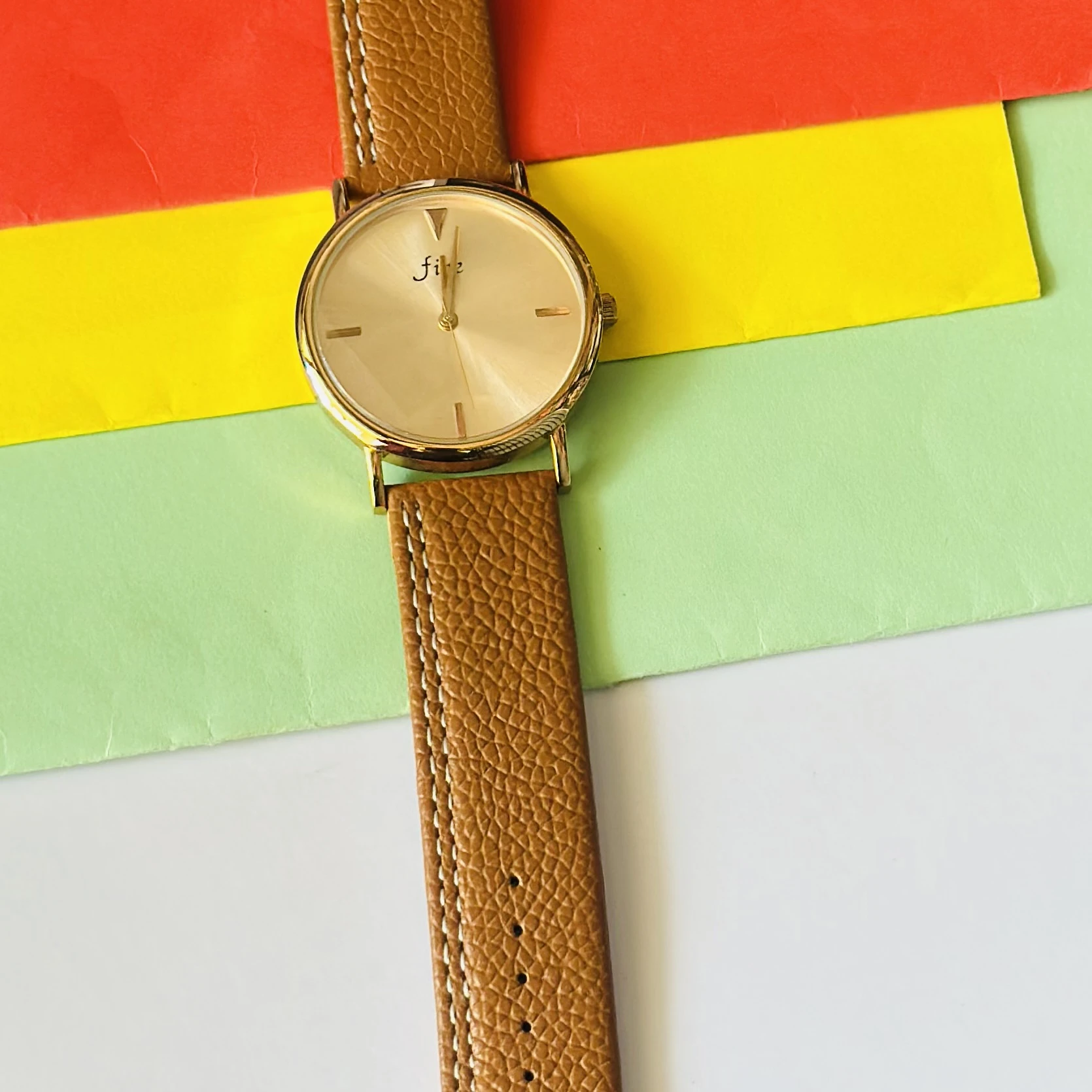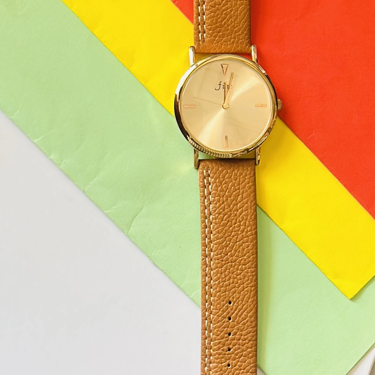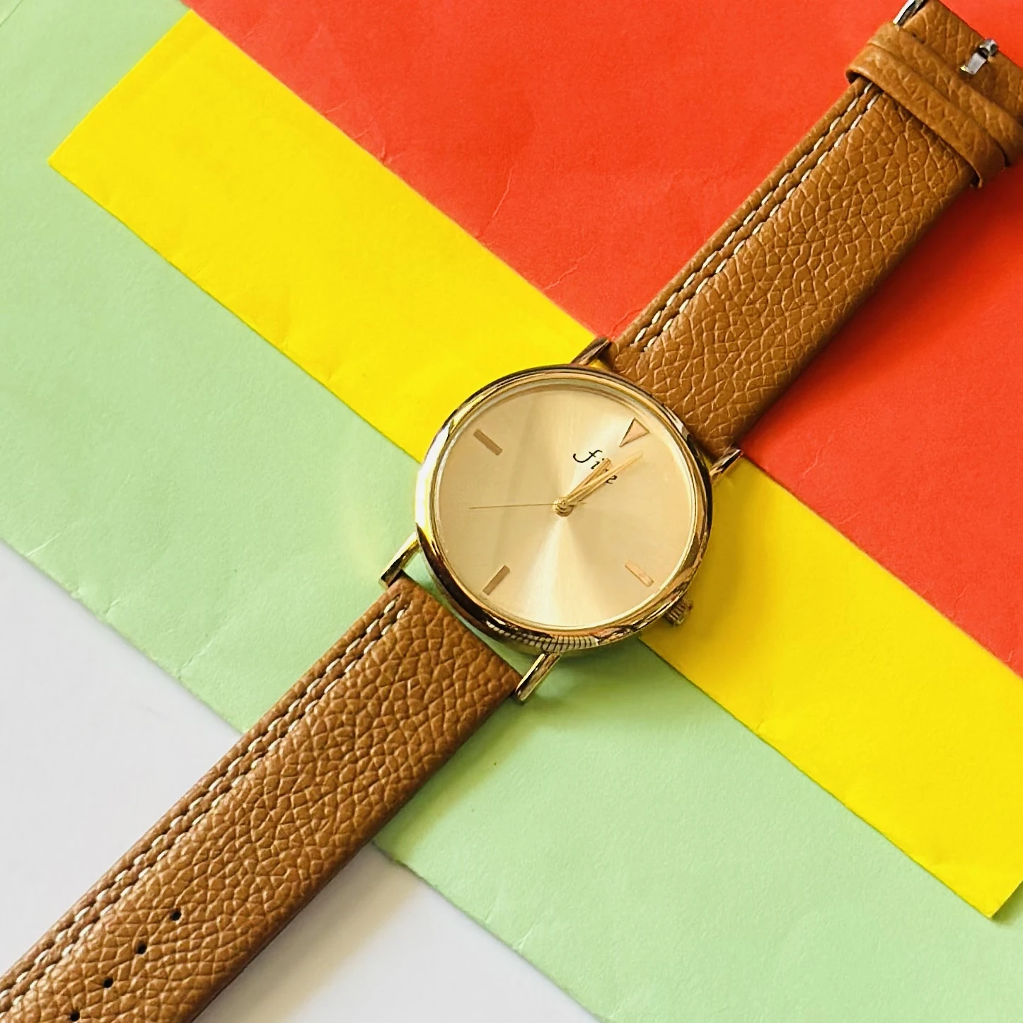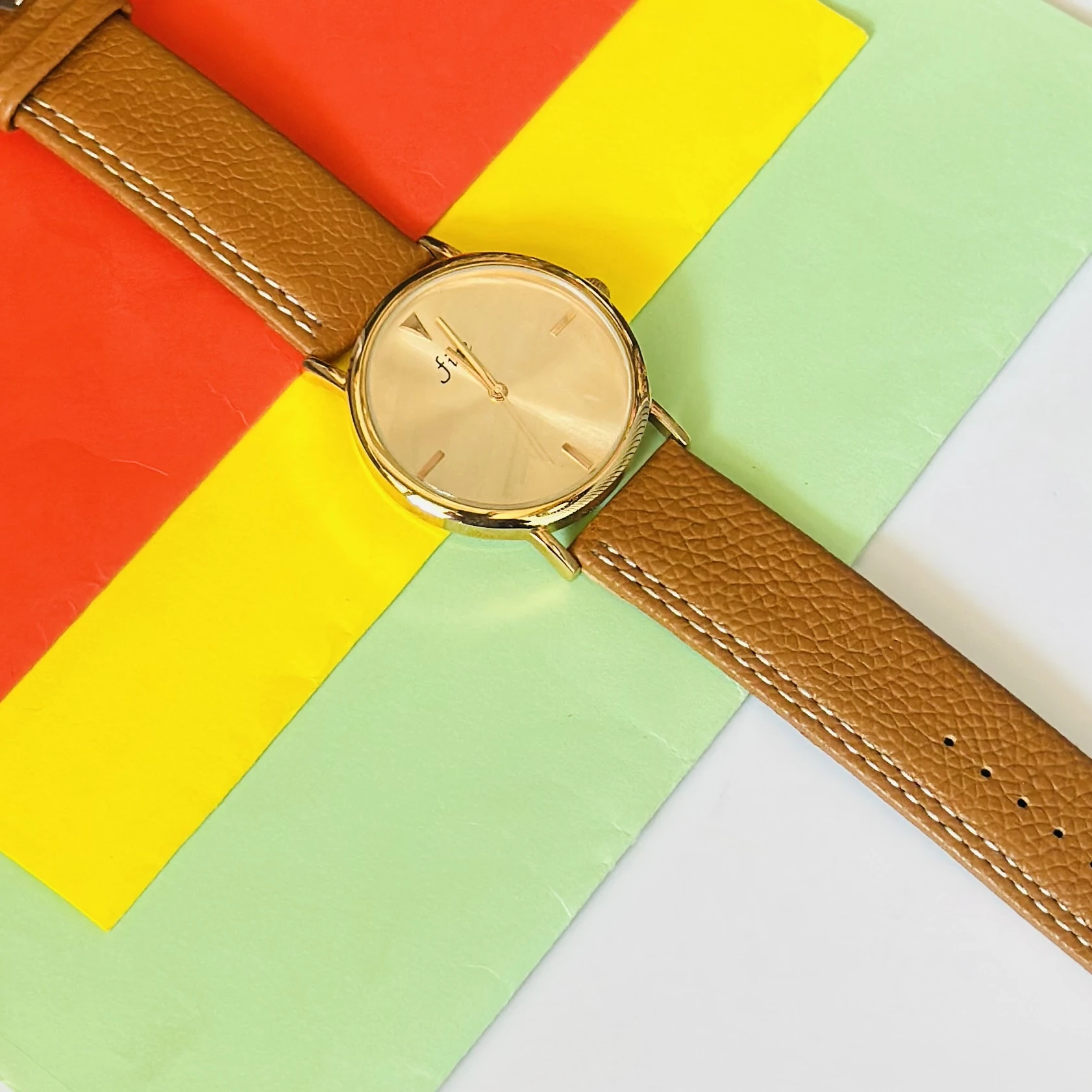 👉 Theme :- Analog wristwatch with a gold-tone case and a brown leather strap.