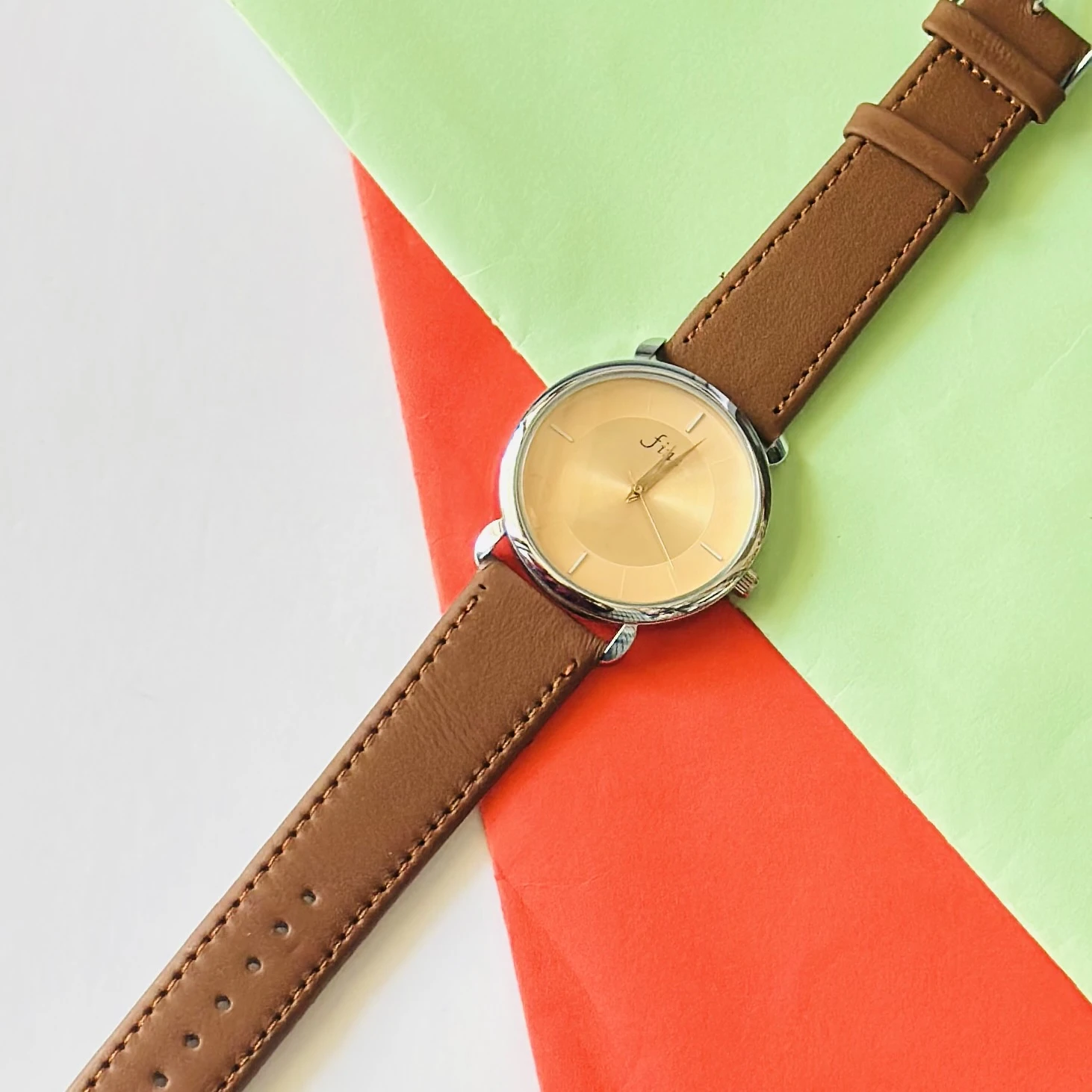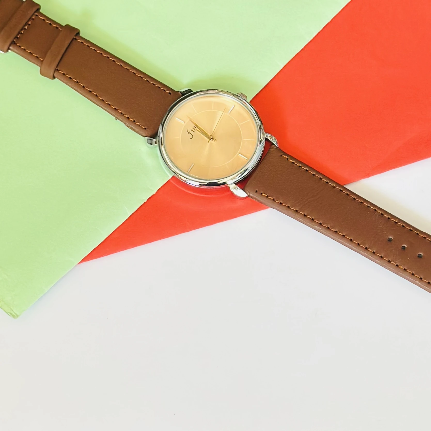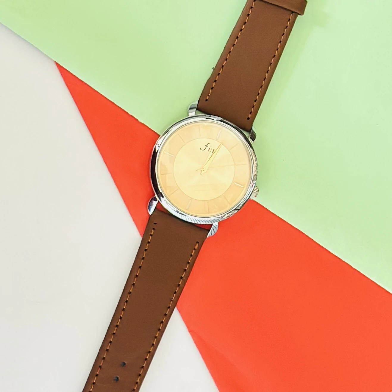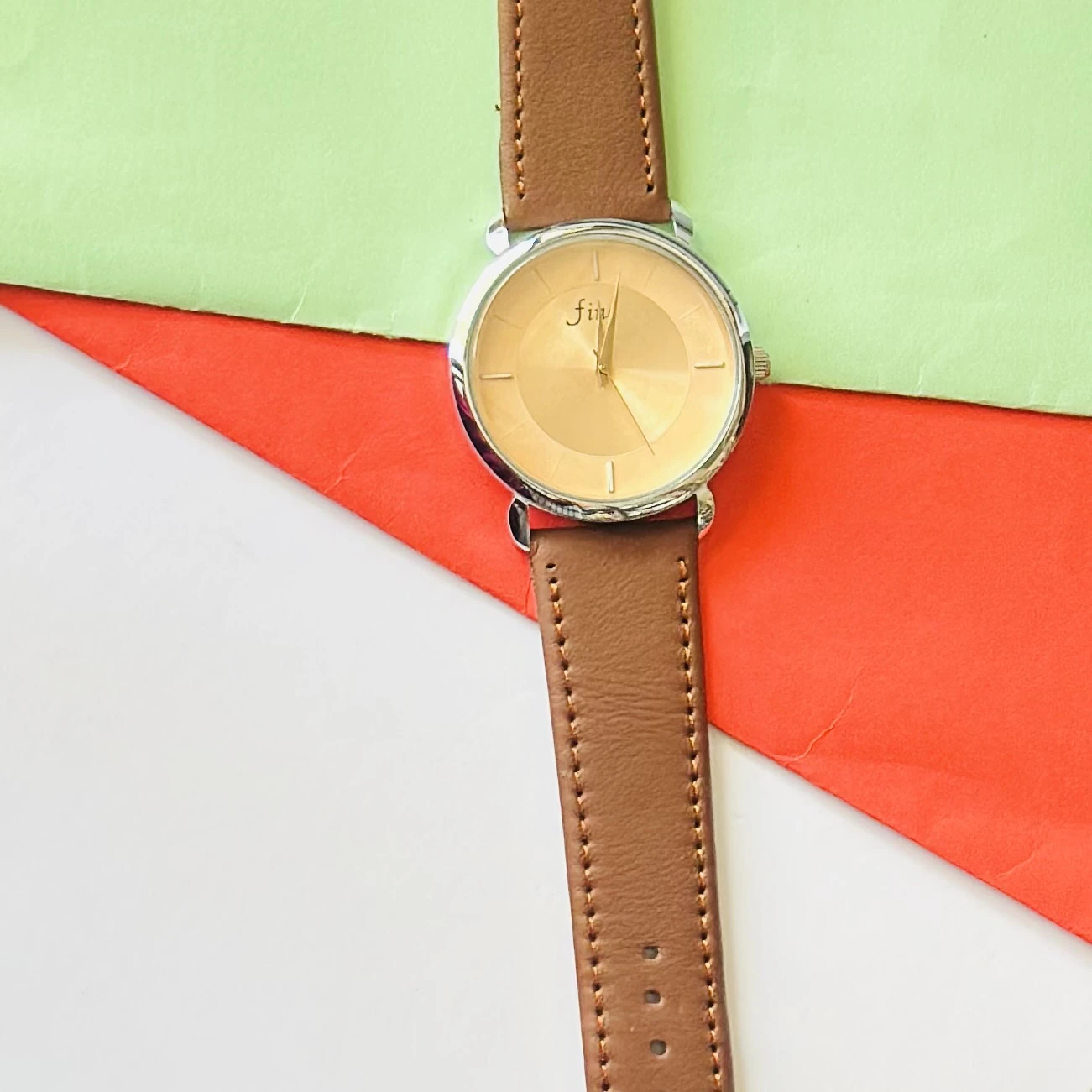 👉 Theme :- Analog wristwatch with a gold-tone case and a brown leather strap.