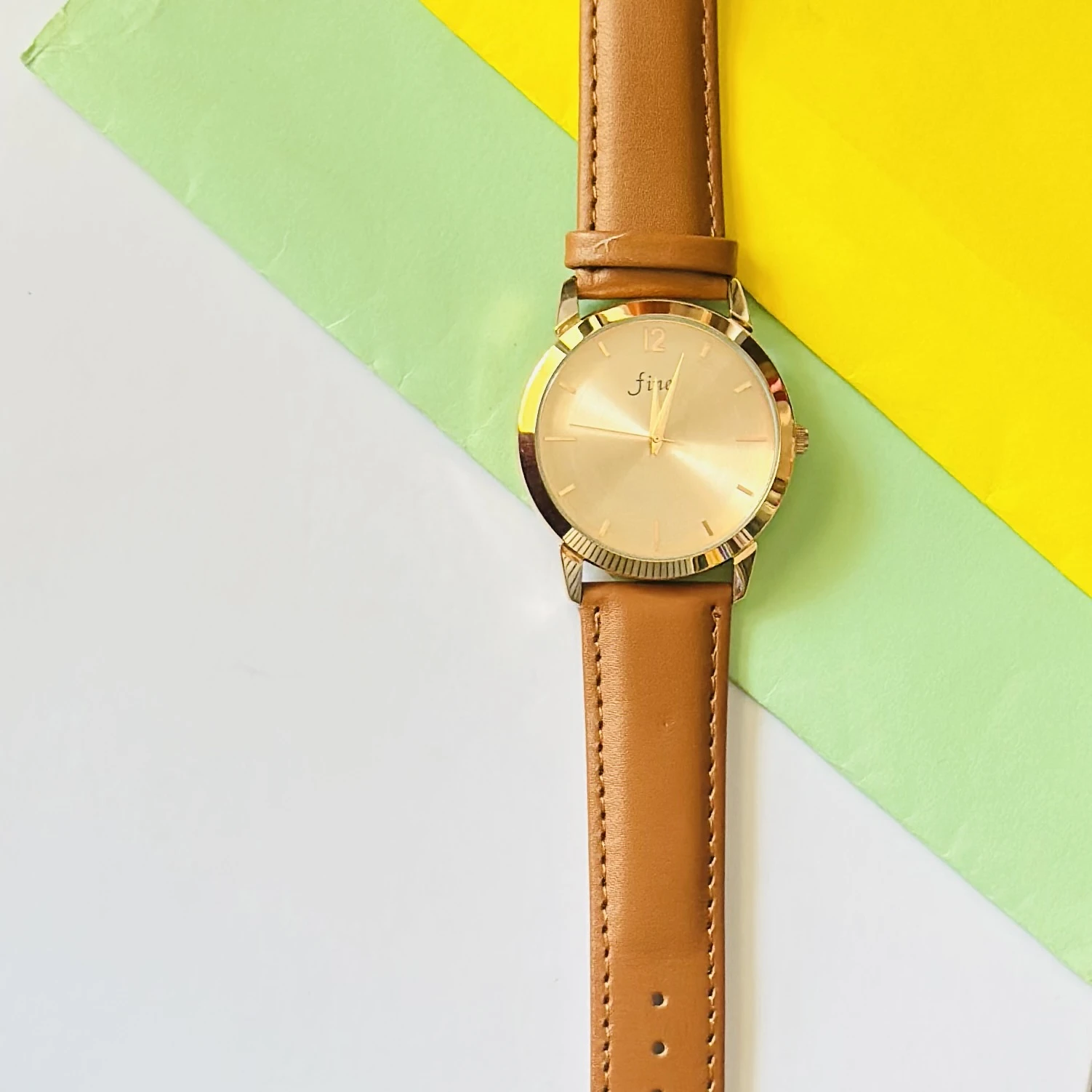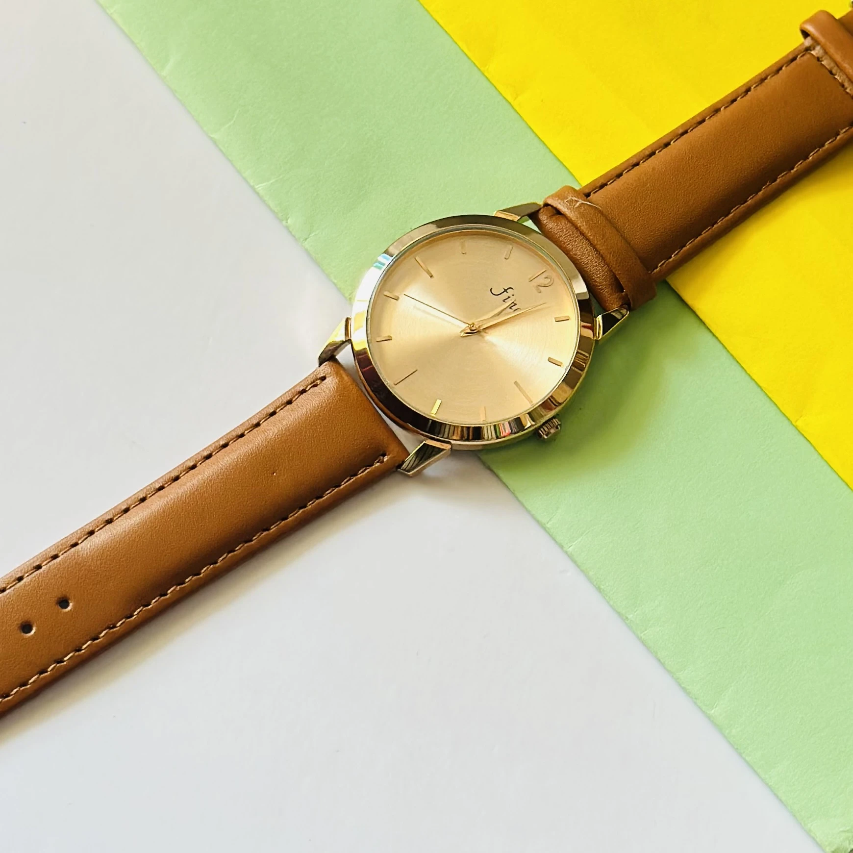 👉 Theme :- Analog wristwatch with a gold-tone case and a brown leather strap.