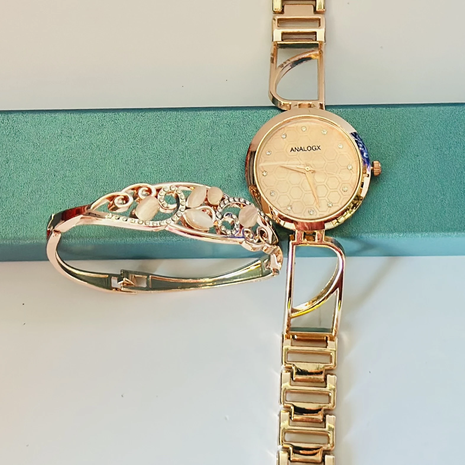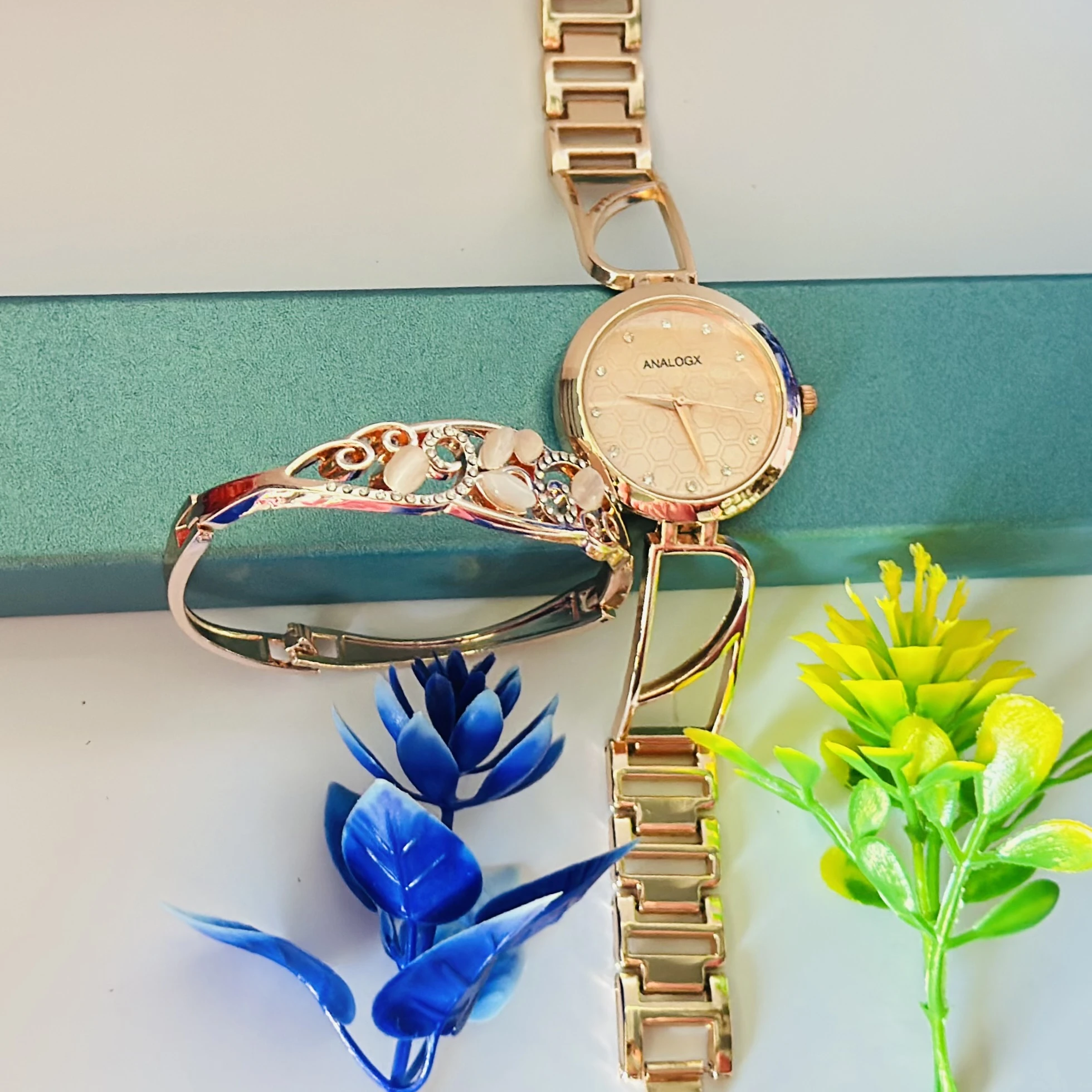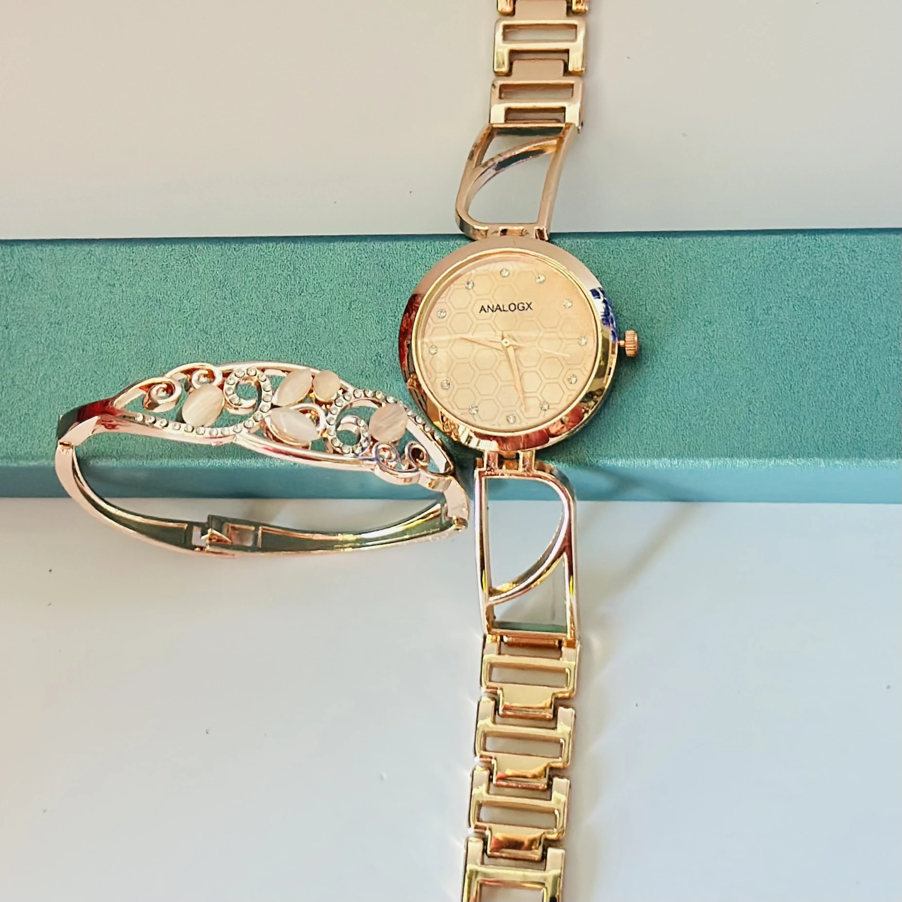 👉 Theme :- Analogx rose gold analog watch and a matching bracelet.