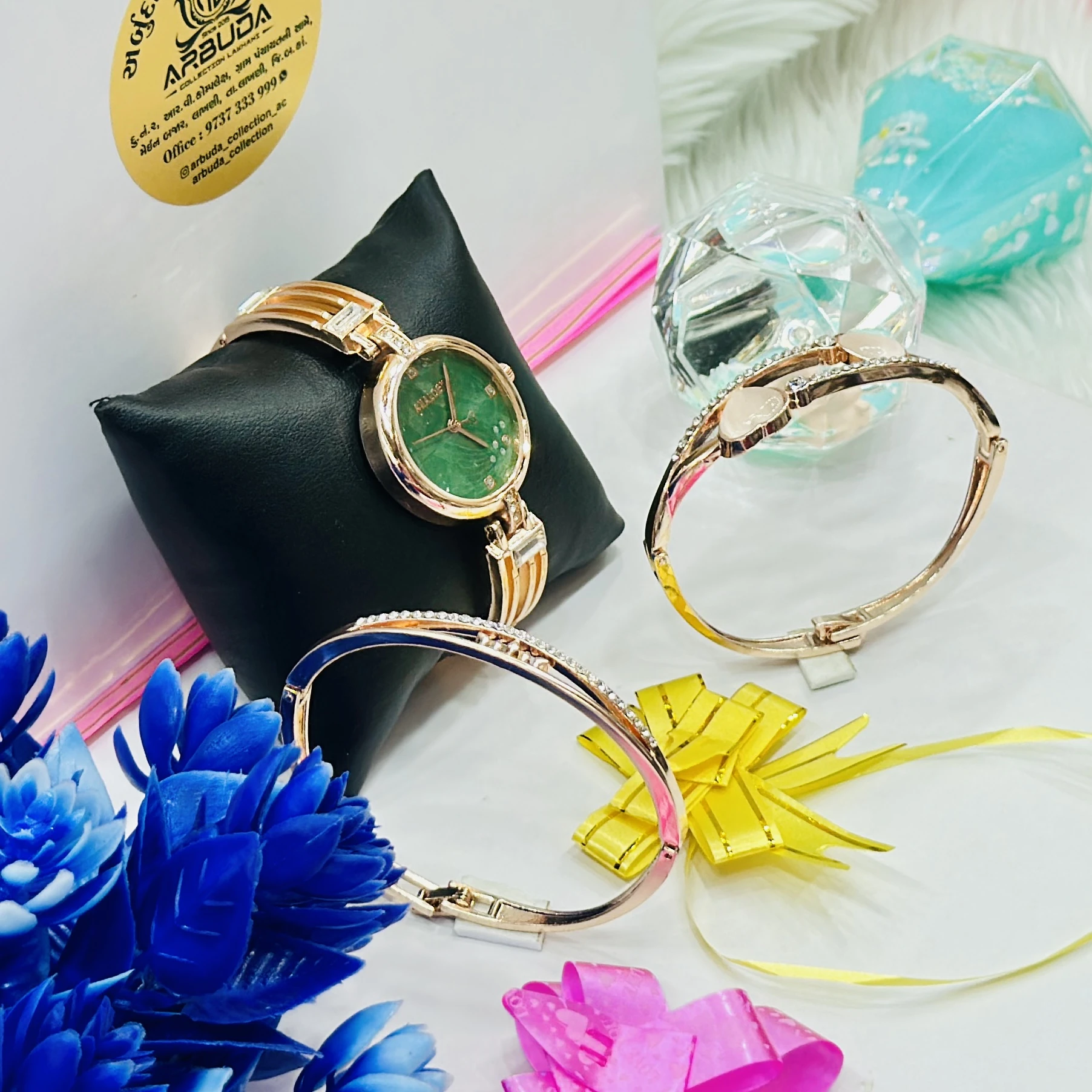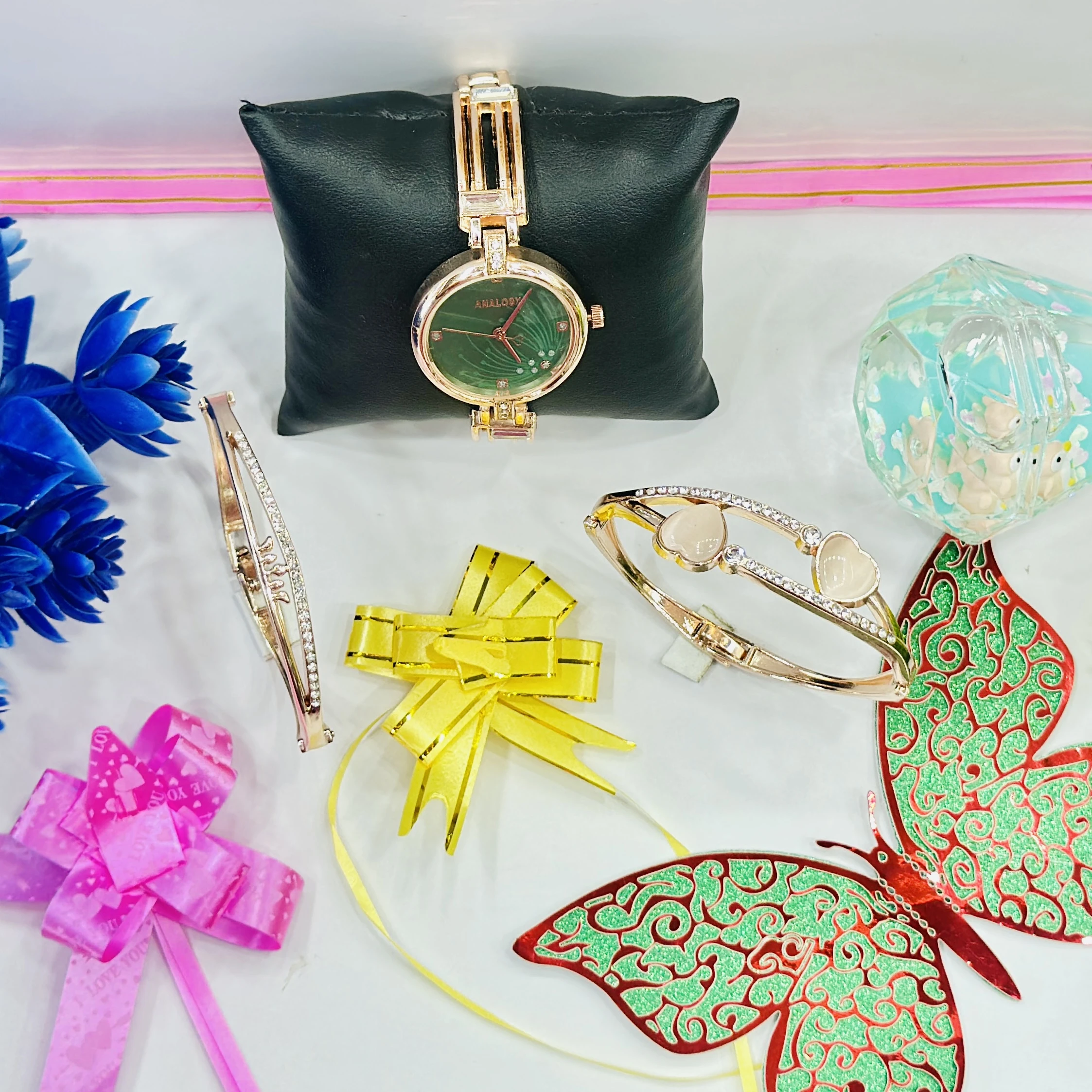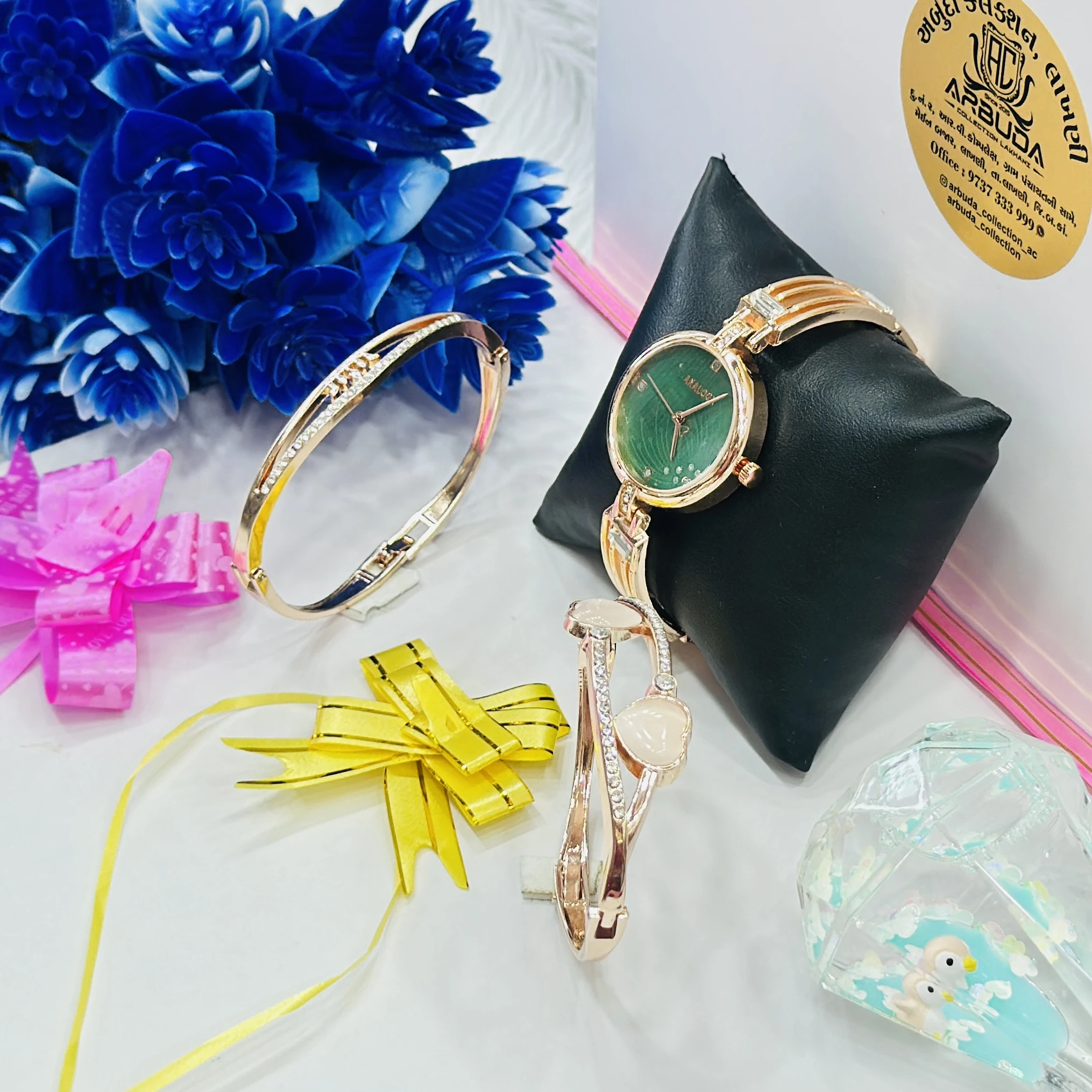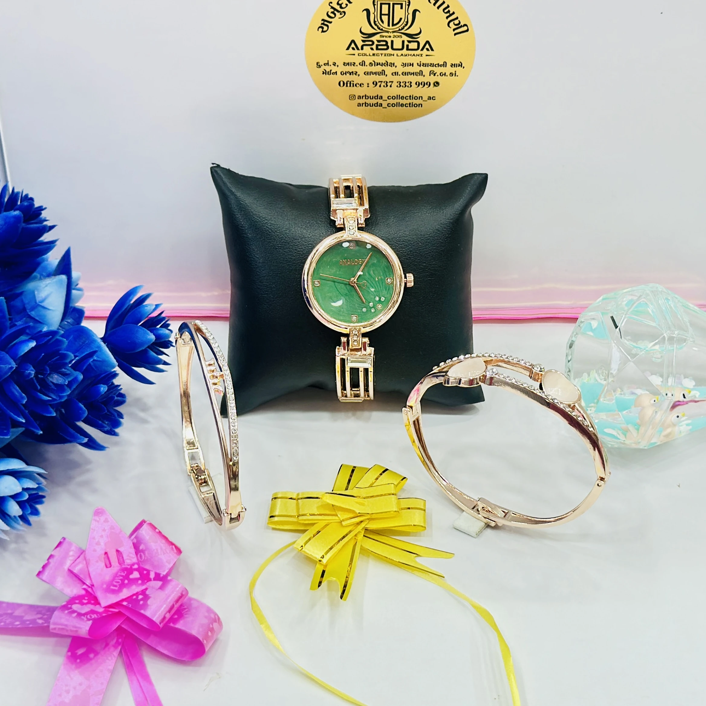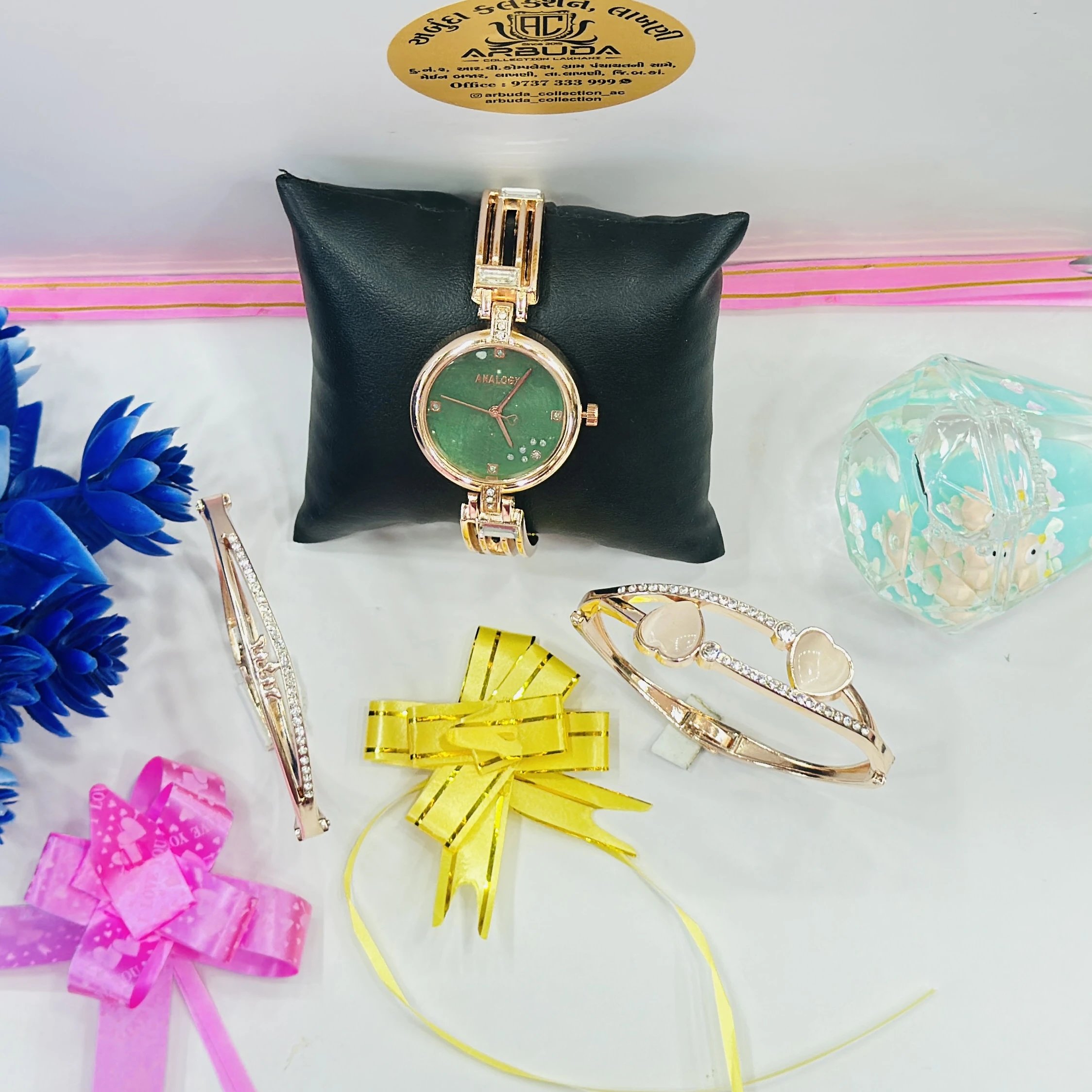 👉Theme :- ladies' rose gold-tone Analogx brand watch set that includes matching bracelets.