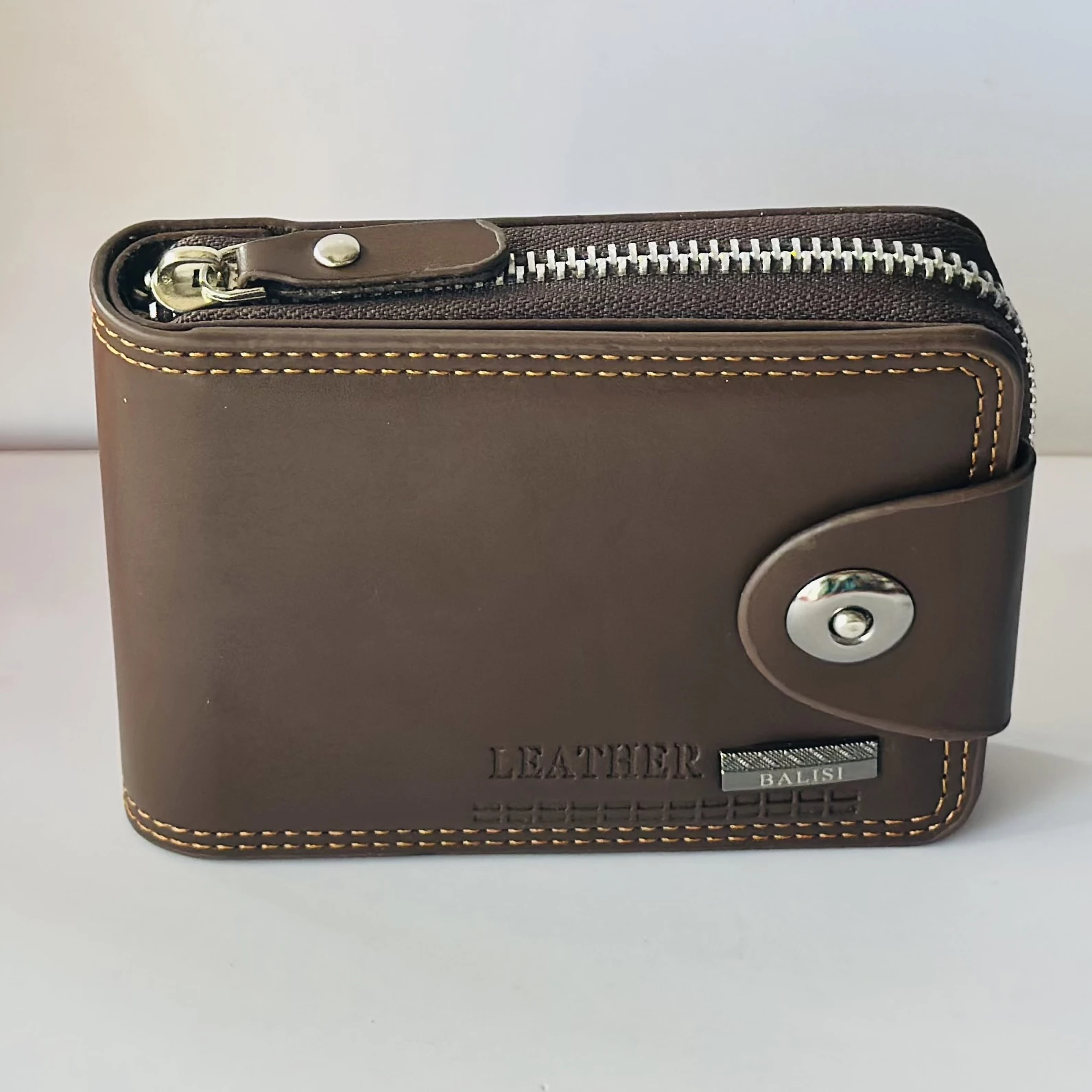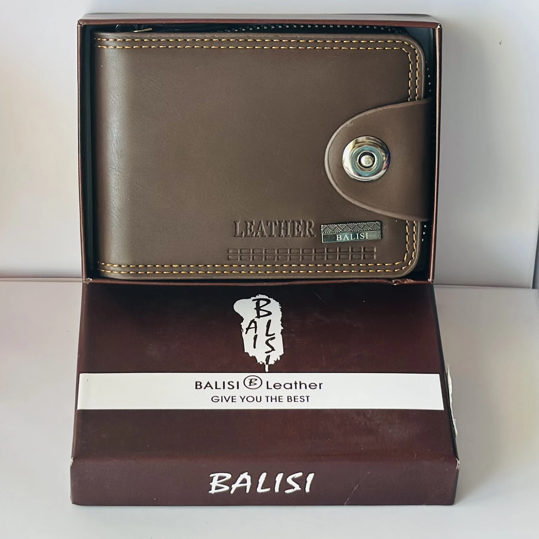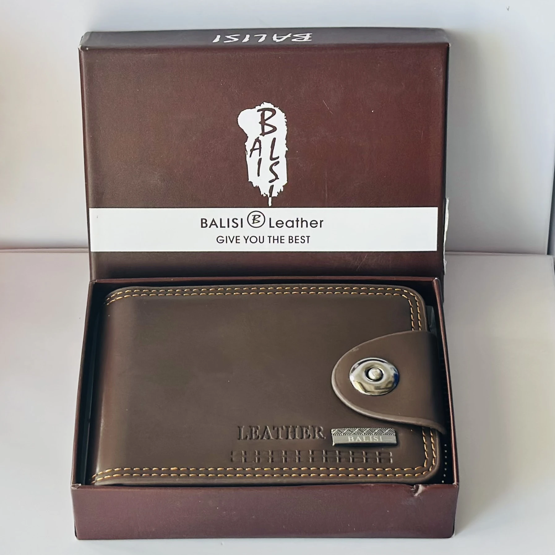 👉 Theme :- Balisi men's brown leather bifold wallet with a snap closure.