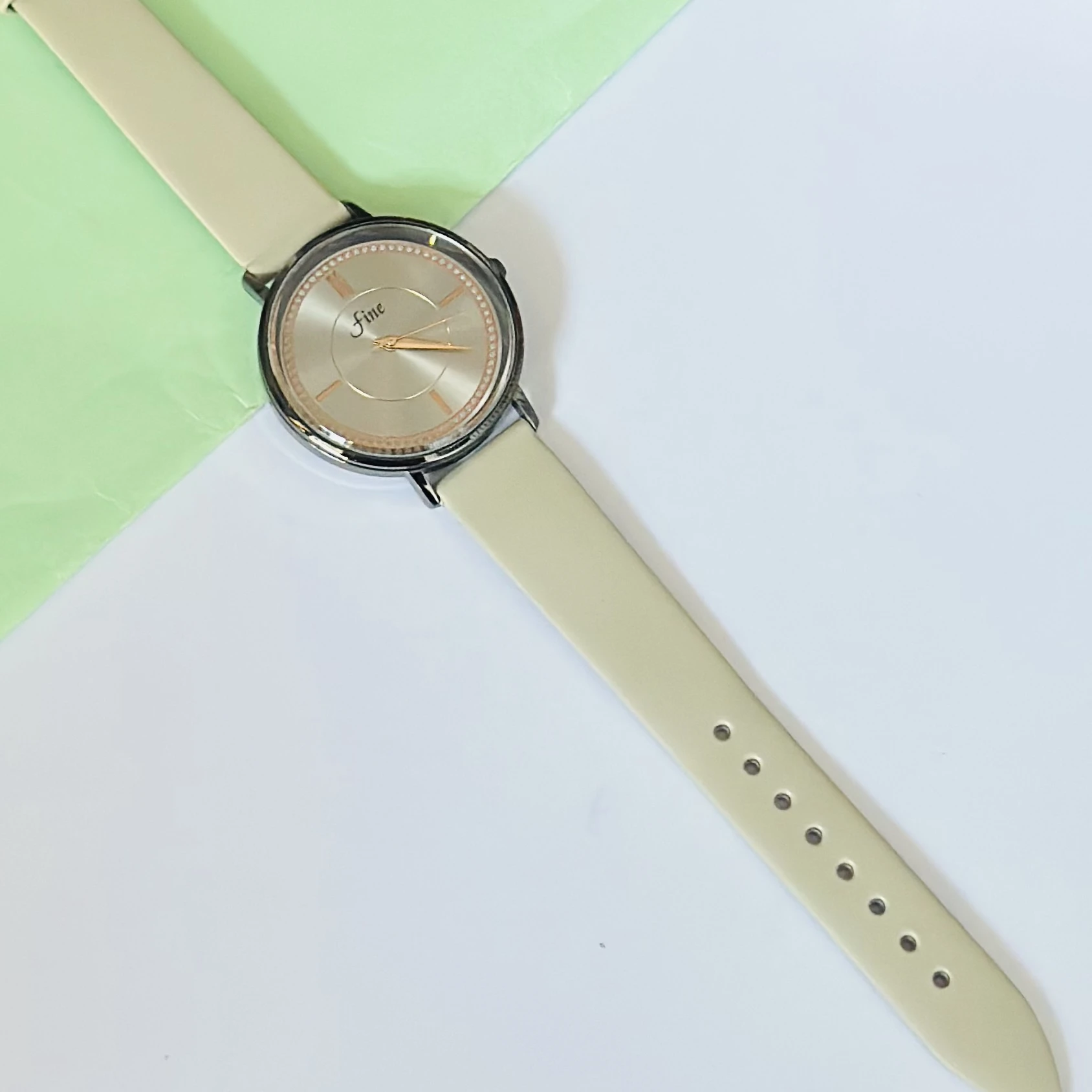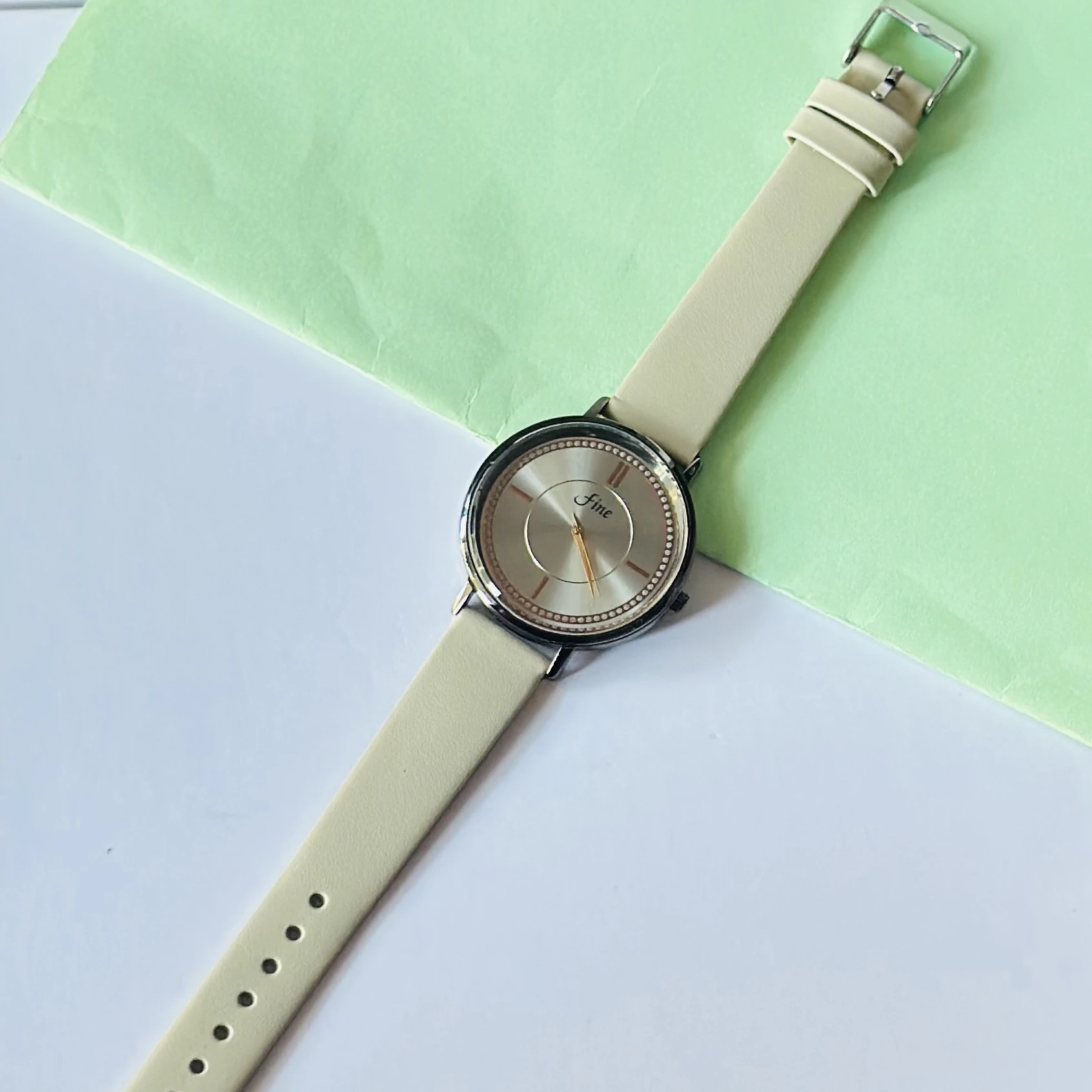 👉 Theme :- minimalist beige analog quartz watch with a round silver-toned case and dial, and a cream-colored silicone or leather strap.