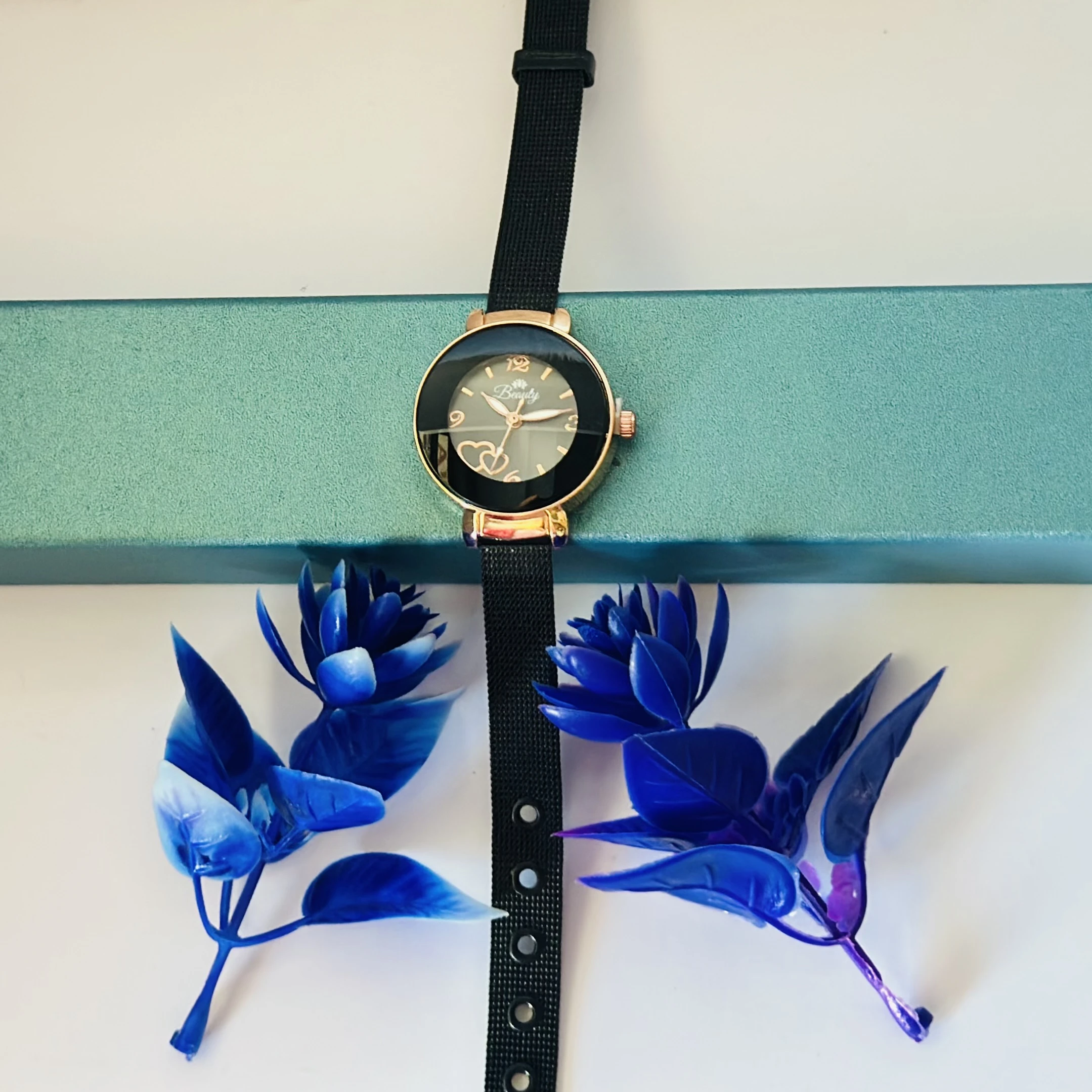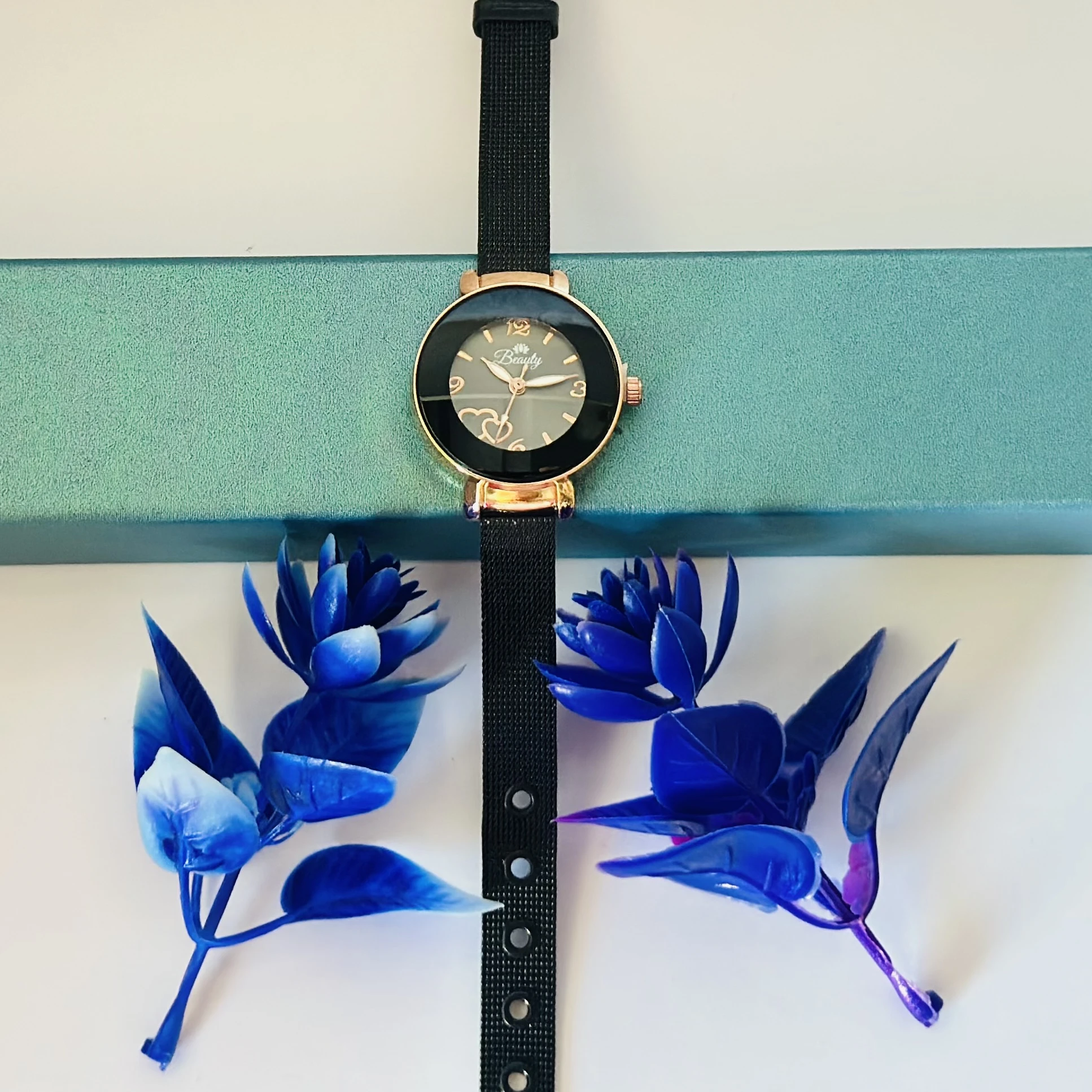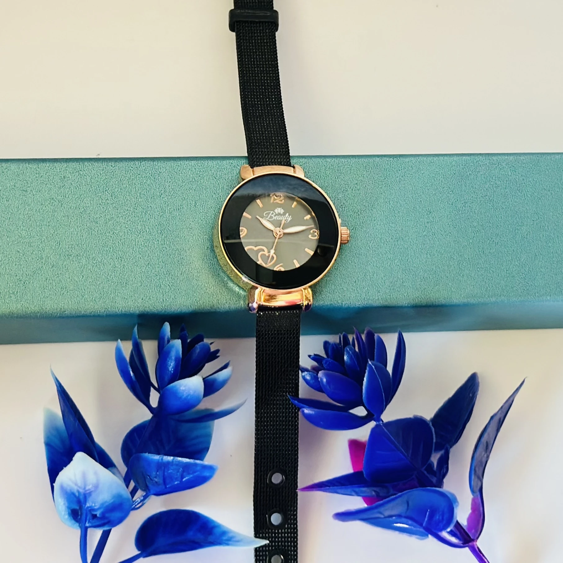 👉 Theme :- Benyty women's analog watch with a rose gold-tone case and a black mesh strap.