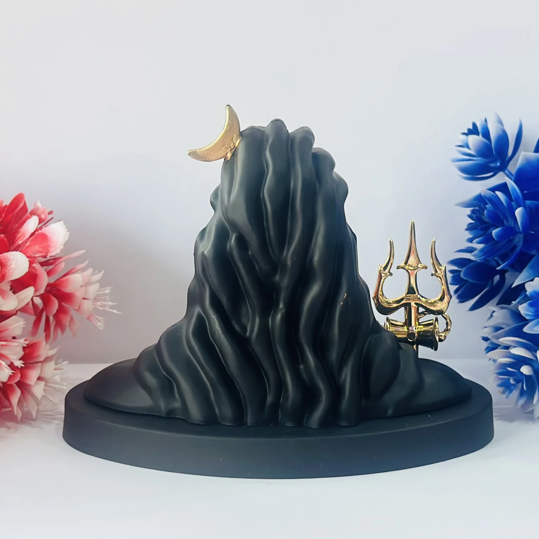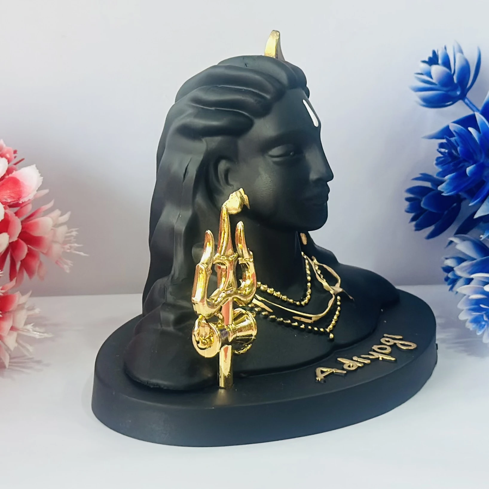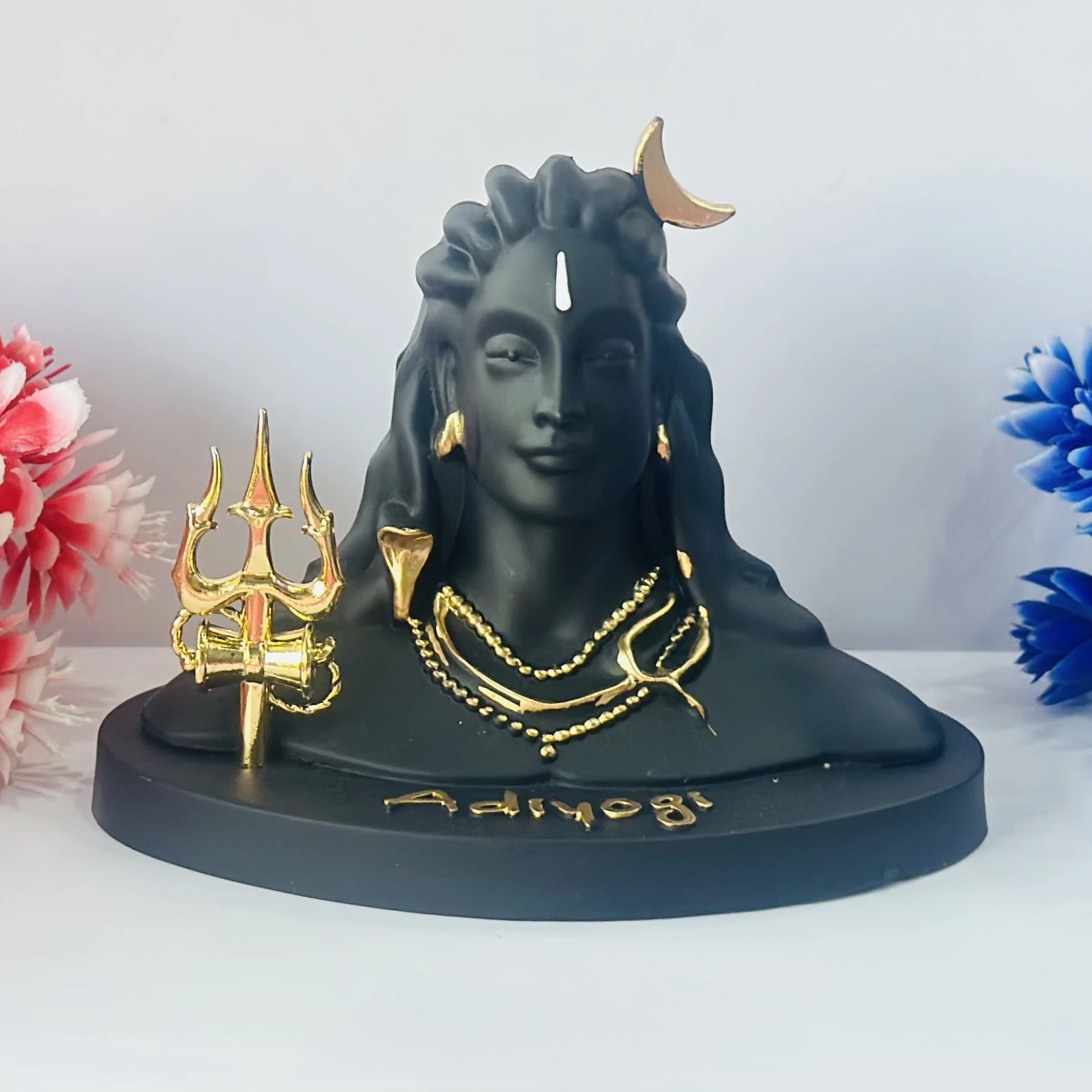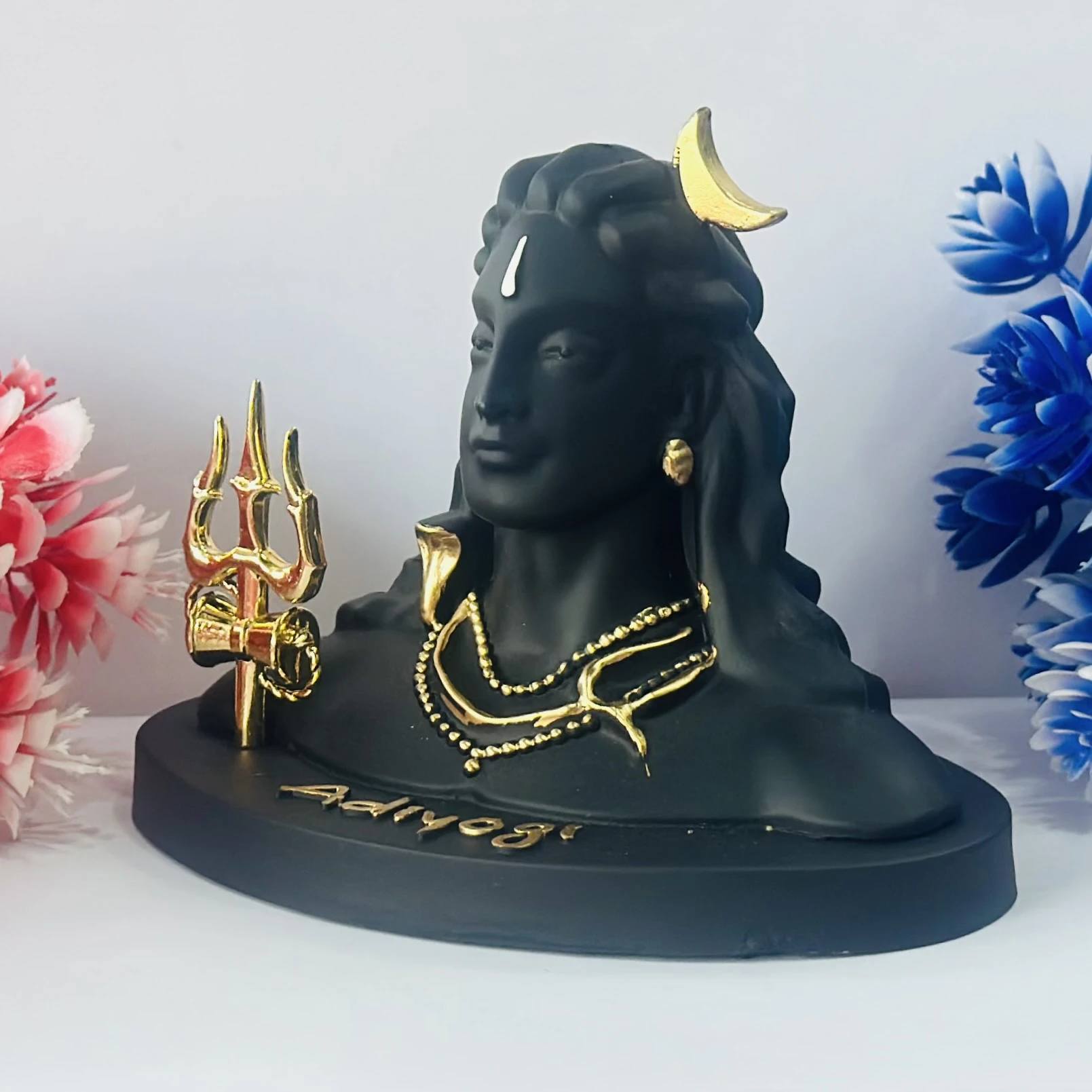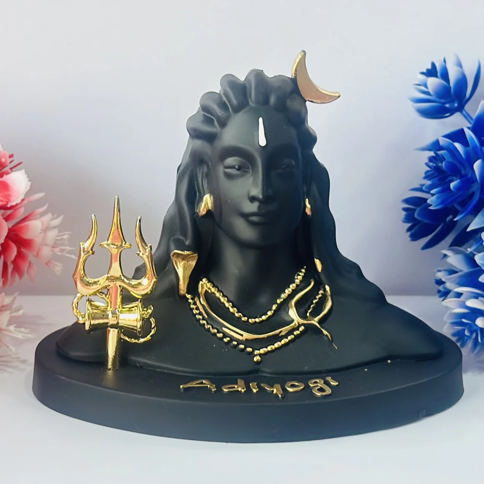 👉 Theme :- Black Adiyogi Shiva statue with a golden Trishul and crescent moon.