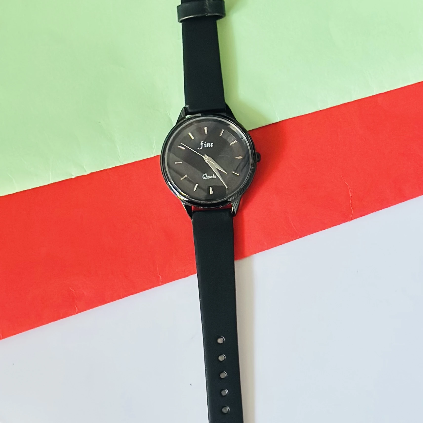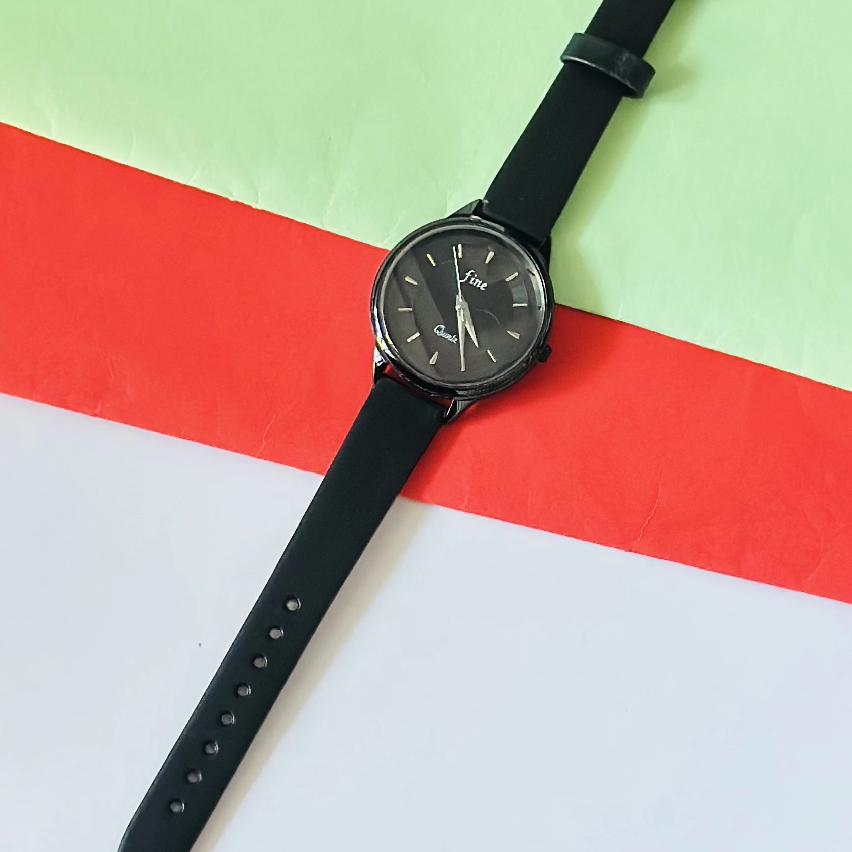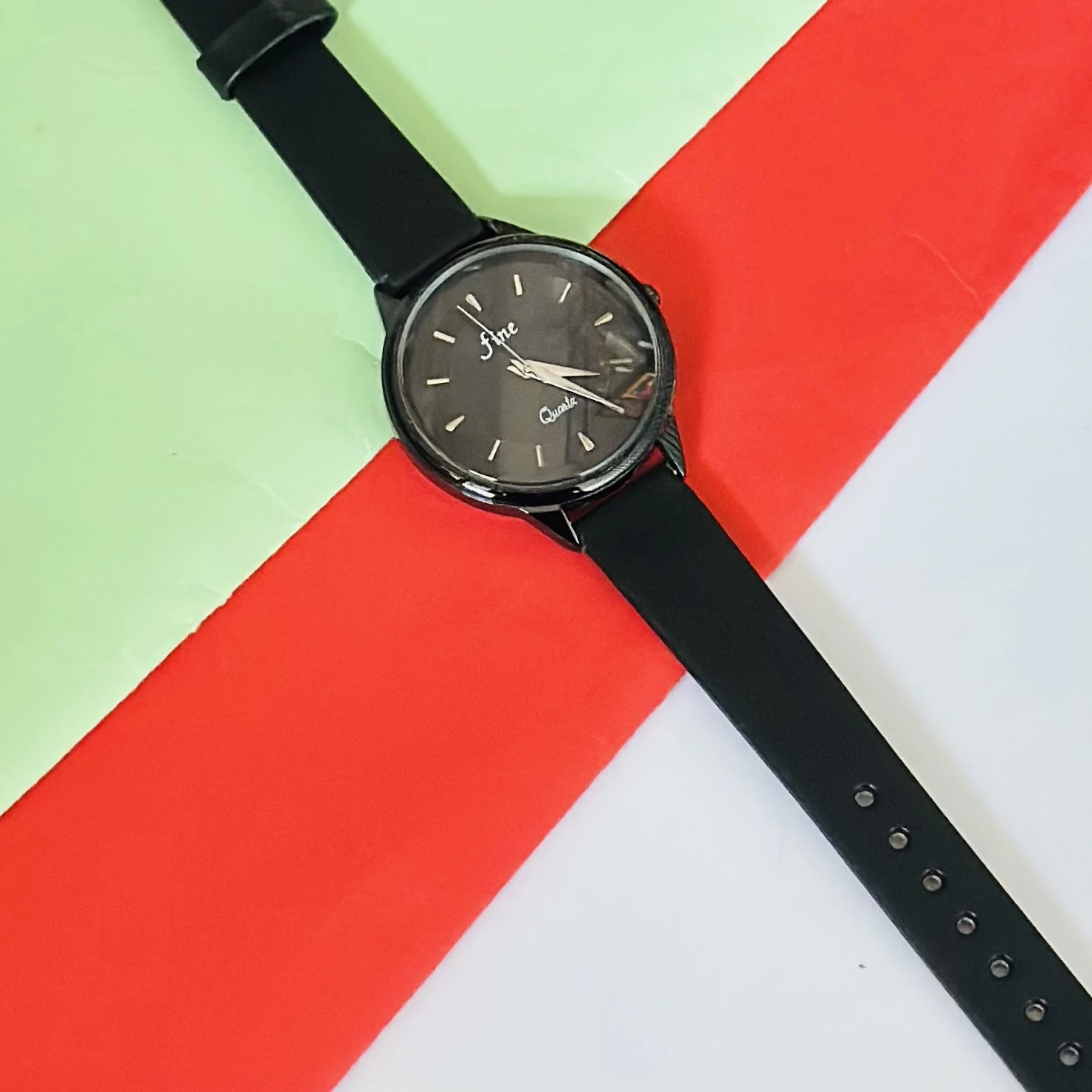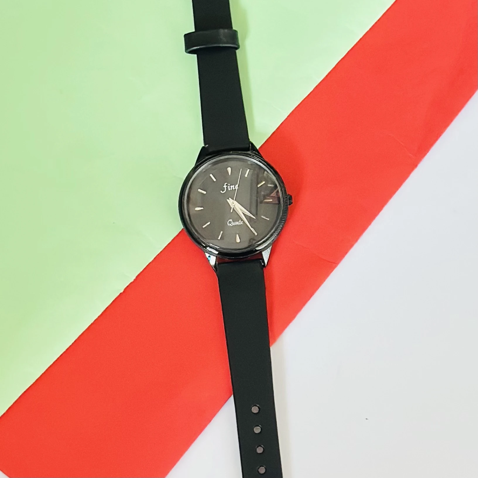 👉 Theme :- Black analog quartz wrist watch with a black strap.