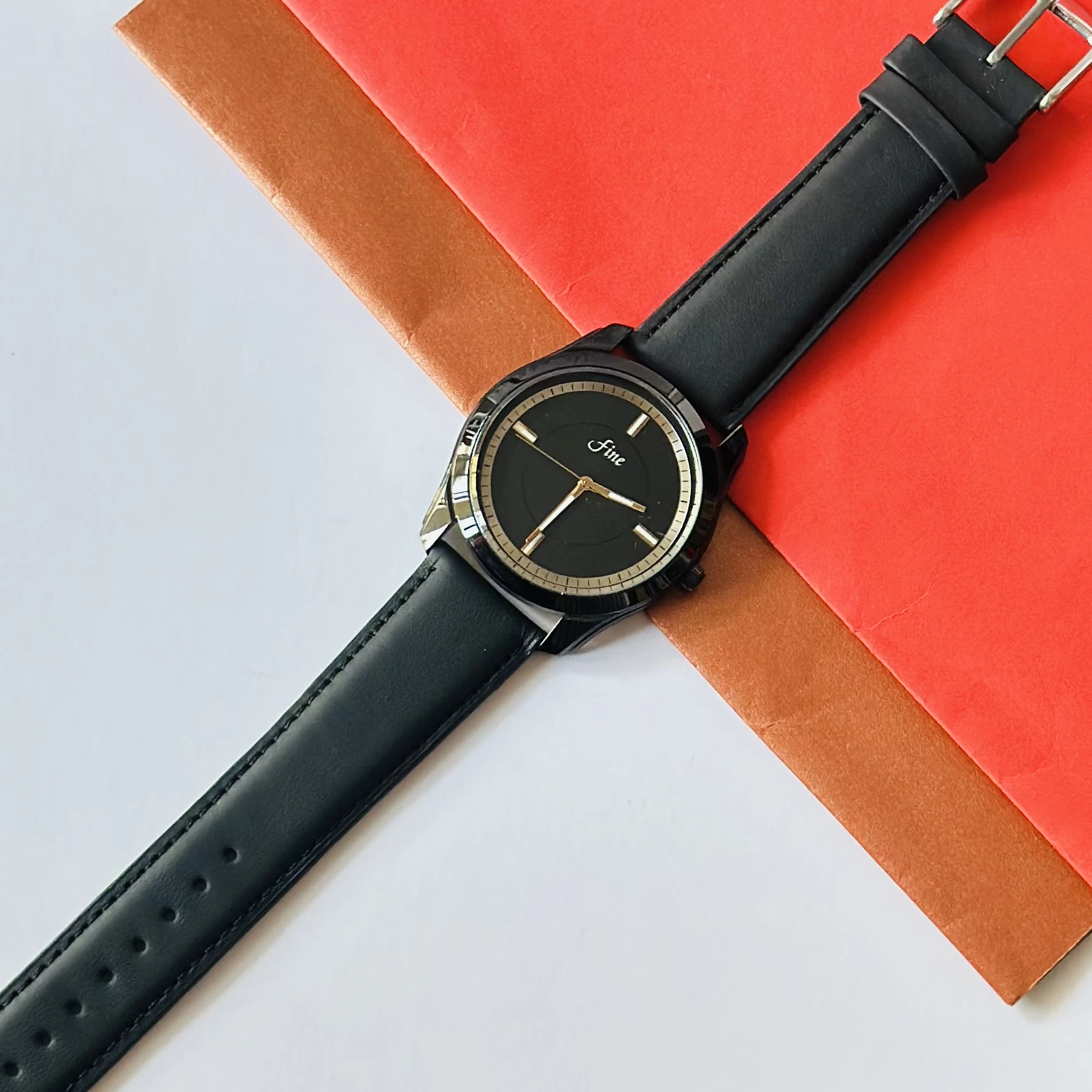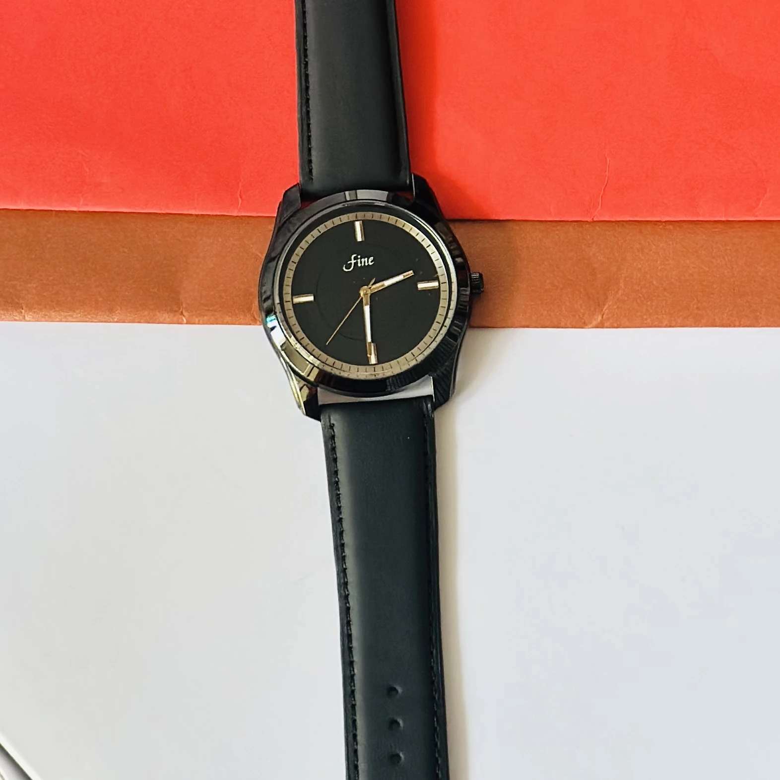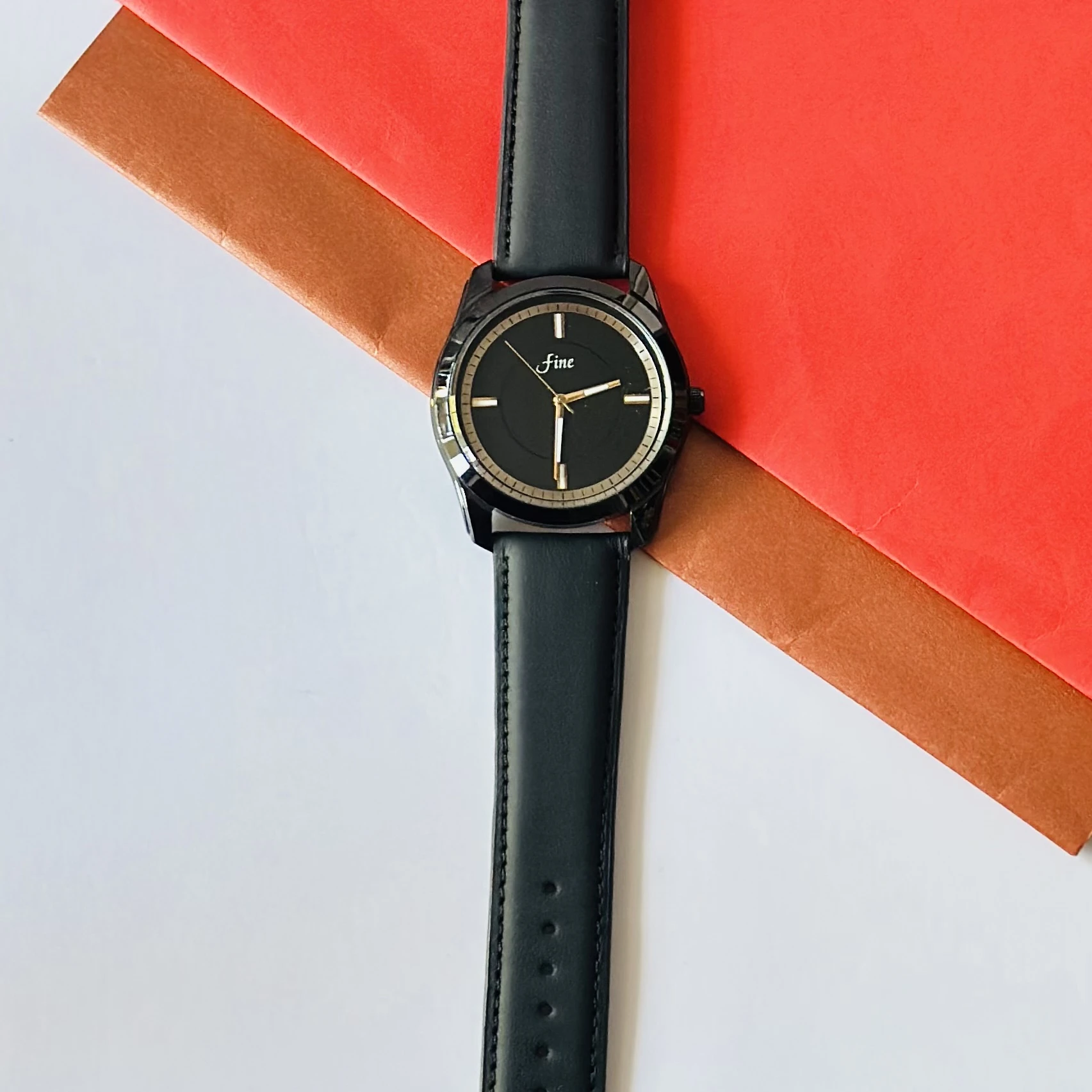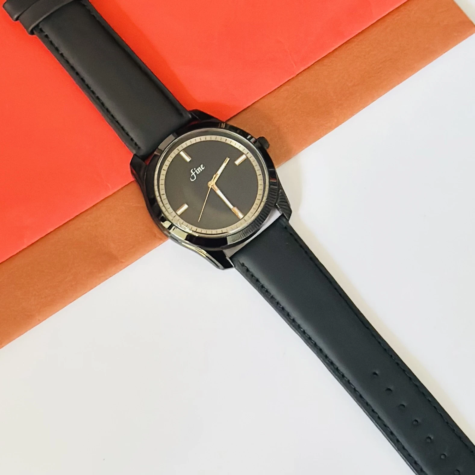 👉 Theme :- Black analog watch with a black leather or silicone strap.